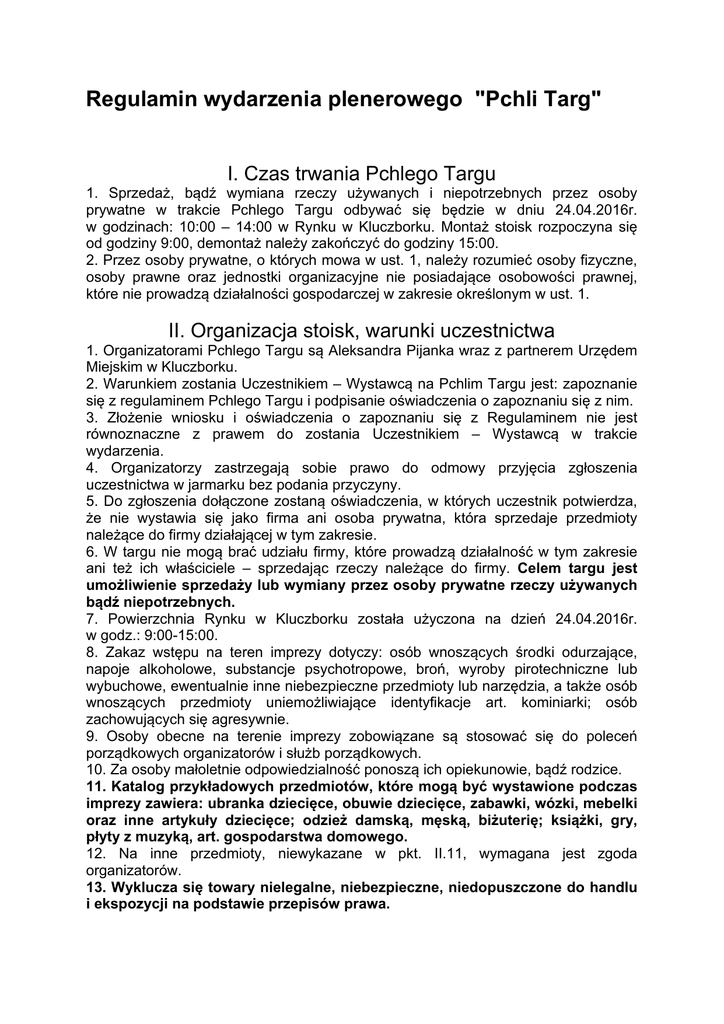 Regulamin wydarzenia plenerowego "Pchli Targ" I. Czas trwania Pchlego Targu 1. Sprzedaż, bądź wymiana rzeczy używanych i niepotrzebnych przez osoby prywatne w trakcie Pchlego Targu odbywać się będzie w dniu 24.04.2016r. w godzinach: 10:00 – 14:00 w Rynku w Kluczborku. Montaż stoisk rozpoczyna się od godziny 9:00, demontaż należy zakończyć do godziny 15:00. 2. Przez osoby prywatne, o których mowa w ust. 1, należy rozumieć osoby fizyczne, osoby prawne oraz jednostki organizacyjne nie posiadające osobowości prawnej, które nie prowadzą działalności gospodarczej w zakresie określonym w ust. 1. II. Organizacja stoisk, warunki uczestnictwa 1. Organizatorami Pchlego Targu są Aleksandra Pijanka wraz z partnerem Urzędem Miejskim w Kluczborku. 2. Warunkiem zostania Uczestnikiem – Wystawcą na Pchlim Targu jest: zapoznanie się z regulaminem Pchlego Targu i podpisanie oświadczenia o zapoznaniu się z nim. 3. Złożenie wniosku i oświadczenia o zapoznaniu się z Regulaminem nie jest równoznaczne z prawem do zostania Uczestnikiem – Wystawcą w trakcie wydarzenia. 4. Organizatorzy zastrzegają sobie prawo do odmowy przyjęcia zgłoszenia uczestnictwa w jarmarku bez podania przyczyny. 5. Do zgłoszenia dołączone zostaną oświadczenia, w których uczestnik potwierdza, że nie wystawia się jako firma ani osoba prywatna, która sprzedaje przedmioty należące do firmy działającej w tym zakresie. 6. W targu nie mogą brać udziału firmy, które prowadzą działalność w tym zakresie ani też ich właściciele – sprzedając rzeczy należące do firmy. Celem targu jest umożliwienie sprzedaży lub wymiany przez osoby prywatne rzeczy używanych bądź niepotrzebnych. 7. Powierzchnia Rynku w Kluczborku została użyczona na dzień 24.04.2016r. w godz.: 9:00-15:00. 8. Zakaz wstępu na teren imprezy dotyczy: osób wnoszących środki odurzające, napoje alkoholowe, substancje psychotropowe, broń, wyroby pirotechniczne lub wybuchowe, ewentualnie inne niebezpieczne przedmioty lub narzędzia, a także osób wnoszących przedmioty uniemożliwiające identyfikacje art. kominiarki; osób zachowujących się agresywnie. 9. Osoby obecne na terenie imprezy zobowiązane są stosować się do poleceń porządkowych organizatorów i służb porządkowych. 10. Za osoby małoletnie odpowiedzialność ponoszą ich opiekunowie, bądź rodzice. 11. Katalog przykładowych przedmiotów, które mogą być wystawione podczas imprezy zawiera: ubranka dziecięce, obuwie dziecięce, zabawki, wózki, mebelki oraz inne artykuły dziecięce; odzież damską, męską, biżuterię; książki, gry, płyty z muzyką, art. gospodarstwa domowego. 12. Na inne przedmioty, niewykazane w pkt. II.11, wymagana jest zgoda organizatorów. 13. Wyklucza się towary nielegalne, niebezpieczne, niedopuszczone do handlu i ekspozycji na podstawie przepisów prawa. 14. Zgłoszenia na Pchli Targ przesyłamy drogą mailową ([email protected]) do dnia 22.04.2016r. Wnioski i oświadczenia dostarczamy w dniu Pchlego Targu do organizatorów wydarzenia. 15. W przypadku odrzucenia zgłoszenia organizatorzy poinformują o tym za pośrednictwem poczty elektronicznej lub telefonicznie do dnia 23.04.2016r. 16. Uczestnik Pchlego Targu może zgłosić organizatorowi rezygnację z uczestnictwa z wydarzenia. 17. Uczestnik otrzymuje drogą elektroniczną identyfikator. Identyfikator ten, należy wydrukować we własnym zakresie i mieć ze sobą podczas wydarzenia. 18. Po zakończeniu działalności stoiska Uczestnik zobowiązany jest do posprzątania odpadów w jego obrębie. Odpady muszą być wyrzucane wyłącznie do przeznaczonych do tego pojemników. 19. Uczestnicy imprezy zorganizują swoje stanowiska w miejscu wyznaczonym przez Organizatorów. 20. Organizatorzy mają prawo do wyłączenia ze stoiska artykułu, który według organizatorów jest niezgodny z charakterem Pchlego Targu. 21. Wystawca we własnym zakresie przygotowuje miejsce ekspozycji sprzedawanych rzeczy tj. koc lub stolik, krzesło, namiot, ewentualnie parasol. 22. Uczestnictwo w wydarzeniu jest bezpłatne. III. Ubezpieczenia 1. Organizatorzy nie ponoszą odpowiedzialności za uszkodzenia wystawianych przedmiotów przed, po i w trakcie trwania Pchlego Targu. 2. Organizatorzy nie odpowiadają za szkody spowodowane kradzieżą, wandalizmem, działaniem sił przyrody i innymi przyczynami losowymi. IV. Postanowienia końcowe 1. Ilość miejsc ekspozycyjnych jest ograniczona, decyduje kolejność zgłoszeń. 2. W przypadku nie zastosowania się Uczestnika do postanowień regulaminu, Organizatorzy mogą zdecydować o wykluczeniu Uczestnika - Wystawcę z Pchlego Targu. 3. W przypadku niepogody Organizatorzy zastrzegają sobie prawo do odwołania imprezy. 4. Wykonywanie postanowień regulaminu ww. Regulaminu powierza się Organizatorom, Policji i Straży Miejskiej.