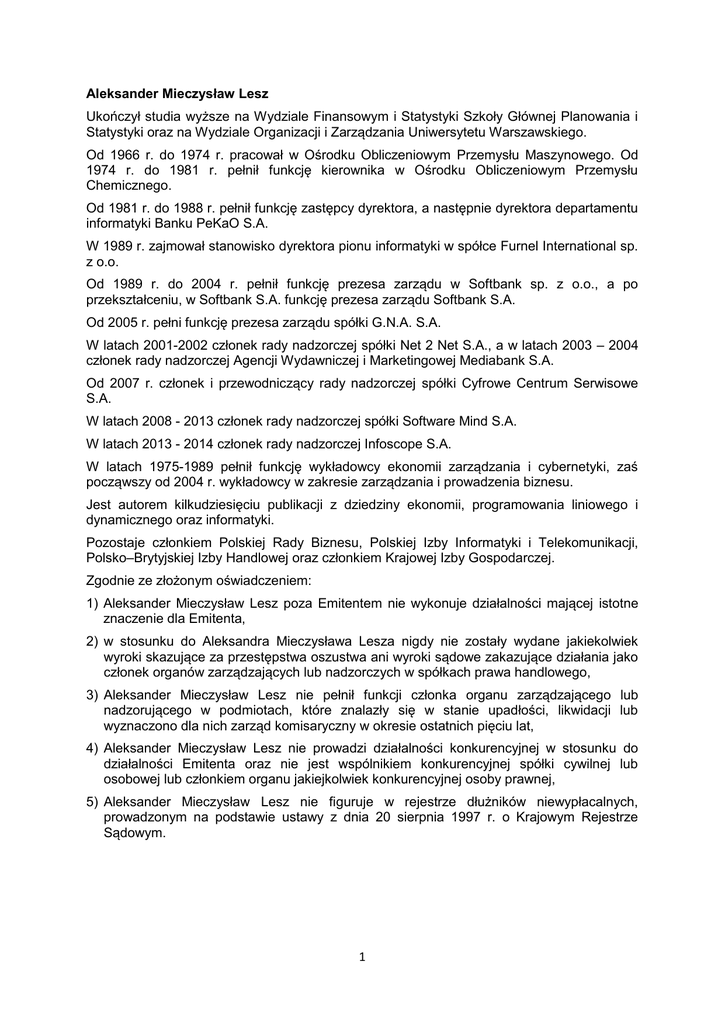 Aleksander Mieczysław Lesz Ukończył studia wyższe na Wydziale Finansowym i Statystyki Szkoły Głównej Planowania i Statystyki oraz na Wydziale Organizacji i Zarządzania Uniwersytetu Warszawskiego. Od 1966 r. do 1974 r. pracował w Ośrodku Obliczeniowym Przemysłu Maszynowego. Od 1974 r. do 1981 r. pełnił funkcję kierownika w Ośrodku Obliczeniowym Przemysłu Chemicznego. Od 1981 r. do 1988 r. pełnił funkcję zastępcy dyrektora, a następnie dyrektora departamentu informatyki Banku PeKaO S.A. W 1989 r. zajmował stanowisko dyrektora pionu informatyki w spółce Furnel International sp. z o.o. Od 1989 r. do 2004 r. pełnił funkcję prezesa zarządu w Softbank sp. z o.o., a po przekształceniu, w Softbank S.A. funkcję prezesa zarządu Softbank S.A. Od 2005 r. pełni funkcję prezesa zarządu spółki G.N.A. S.A. W latach 2001-2002 członek rady nadzorczej spółki Net 2 Net S.A., a w latach 2003 – 2004 członek rady nadzorczej Agencji Wydawniczej i Marketingowej Mediabank S.A. Od 2007 r. członek i przewodniczący rady nadzorczej spółki Cyfrowe Centrum Serwisowe S.A. W latach 2008 - 2013 członek rady nadzorczej spółki Software Mind S.A. W latach 2013 - 2014 członek rady nadzorczej Infoscope S.A. W latach 1975-1989 pełnił funkcję wykładowcy ekonomii zarządzania i cybernetyki, zaś począwszy od 2004 r. wykładowcy w zakresie zarządzania i prowadzenia biznesu. Jest autorem kilkudziesięciu publikacji z dziedziny ekonomii, programowania liniowego i dynamicznego oraz informatyki. Pozostaje członkiem Polskiej Rady Biznesu, Polskiej Izby Informatyki i Telekomunikacji, Polsko–Brytyjskiej Izby Handlowej oraz członkiem Krajowej Izby Gospodarczej. Zgodnie ze złożonym oświadczeniem: 1) Aleksander Mieczysław Lesz poza Emitentem nie wykonuje działalności mającej istotne znaczenie dla Emitenta, 2) w stosunku do Aleksandra Mieczysława Lesza nigdy nie zostały wydane jakiekolwiek wyroki skazujące za przestępstwa oszustwa ani wyroki sądowe zakazujące działania jako członek organów zarządzających lub nadzorczych w spółkach prawa handlowego, 3) Aleksander Mieczysław Lesz nie pełnił funkcji członka organu zarządzającego lub nadzorującego w podmiotach, które znalazły się w stanie upadłości, likwidacji lub wyznaczono dla nich zarząd komisaryczny w okresie ostatnich pięciu lat, 4) Aleksander Mieczysław Lesz nie prowadzi działalności konkurencyjnej w stosunku do działalności Emitenta oraz nie jest wspólnikiem konkurencyjnej spółki cywilnej lub osobowej lub członkiem organu jakiejkolwiek konkurencyjnej osoby prawnej, 5) Aleksander Mieczysław Lesz nie figuruje w rejestrze dłużników niewypłacalnych, prowadzonym na podstawie ustawy z dnia 20 sierpnia 1997 r. o Krajowym Rejestrze Sądowym. 1 Jerzy Andrzej Kurczyna Ukończył studia wyższe na Wydziale Prawa Uniwersytetu Jagiellońskiego w Krakowie. W latach 1979 – 1989 kolejno aplikant prokuratorski, prokurator Prokuratury Rejonowej w Krośnie, prokurator Prokuratury Wojewódzkiej w Krośnie. Od roku 1997 do dnia dzisiejszego wspólnik i prezes zarządu spółki Konsulting PrawnoEkonomiczny sp. z o.o. z siedzibą w Krośnie. Pozostawał członkiem rad nadzorczych wielu spółek między innymi: spółki FRAC S.A., Tarpom S.A., spółki Owintar sp. z o.o., spółki Fructar sp. z o.o., spółki Auto-Market sp. z o.o., spółki NEXT sp. z o.o., spółki Wafro-Met sp. z o.o. W latach 2000-2002 Jerzy Kurczyna pozostawał członkiem rady nadzorczej spółki EuroPhone sp. z o.o. Jerzy Kurczyna był członkiem rady nadzorczej Firmy Wafro sp. z o.o. z siedzibą w Brzozowie, a po przekształceniu tej spółki, był członkiem rady nadzorczej Firmy Wafro S.A. z siedzibą w Brzozowie. Jerzy Kurczyna pełni funkcję członka Rady Nadzorczej spółki Cyfrowe Centrum Serwisowe S.A. od 2006 r. Od 1990 roku do chwili obecnej prowadzi kancelarię radcy prawnego w Krośnie. Zgodnie ze złożonym oświadczeniem: 1) Jerzy Andrzej Kurczyna poza Emitentem nie wykonuje działalności mającej istotne znaczenie dla Emitenta, 2) w stosunku do Jerzego Andrzeja Kurczyny nigdy nie zostały wydane jakiekolwiek wyroki skazujące za przestępstwa oszustwa ani wyroki sądowe zakazujące działania jako członek organów zarządzających lub nadzorczych w spółkach prawa handlowego, 3) Jerzy Andrzej Kurczyna nie pełnił funkcji członka organu zarządzającego lub nadzorującego w podmiotach, które znalazły się w stanie upadłości, likwidacji lub wyznaczono dla nich zarząd komisaryczny w okresie ostatnich pięciu lat, 4) Jerzy Andrzej Kurczyna nie prowadzi działalności konkurencyjnej w stosunku do działalności Emitenta oraz nie jest wspólnikiem konkurencyjnej spółki cywilnej lub osobowej lub członkiem organu jakiejkolwiek konkurencyjnej osoby prawnej, 5) Jerzy Andrzej Kurczyna nie figuruje w rejestrze dłużników niewypłacalnych, prowadzonym na podstawie ustawy z dnia 20 sierpnia 1997 r. o Krajowym Rejestrze Sądowym. Jakub Wacław Zygmunt Ukończył studia wyższe na Wydziale Prawa i Administracji Uniwersytetu Marii Curie – Skłodowskiej w Lublinie na kierunku prawo. Odbył aplikację sądową w Sądzie Okręgowym w Krośnie. W latach 2006 – 2009 aplikant sądowy. Złożył egzaminy sędziowski i radcowski. W roku 2010 uzyskał wpis na listę radców prawnych. W latach 2005 – 2008 zatrudniony w spółce Cyfrowe Centrum Serwisowe sp. z o.o., a po przekształceniu tej spółki w spółce Cyfrowe Centrum Serwisowe S.A. (tj. od 2006 r. do 2008). W latach 2008 – 2010 zatrudniony w kancelarii radcy prawnego Jerzego Kurczyny. Od 2011 r. zatrudniony w spółce Fresh Mobile Concepts sp. z o.o. Od 2006 r. pełni funkcję członka rady nadzorczej spółki Cyfrowe Centrum Serwisowe S.A. 2 Jakub Wacław Zygmunt jest synem Jerzego Macieja Zygmunta, który jest prezesem zarządu i akcjonariuszem. Obecnie prowadzi kancelarię radcy prawnego w Piasecznie. Zgodnie ze złożonym oświadczeniem: 1) Jakub Wacław Zyg