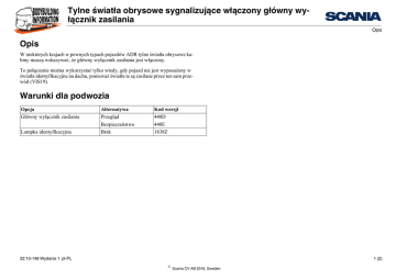Tylne światła obrysowe sygnalizujące włączony główny wyłącznik zasilania Opis Opis W niektórych krajach w pewnych typach pojazdów ADR tylne światła obrysowe kabiny muszą wskazywać, że główny wyłącznik zasilania jest włączony. To połączenie można wykorzystać tylko wtedy, gdy pojazd nie jest wyposażony w światła identyfikacyjne na dachu, ponieważ światła te są zasilane przez ten sam przewód (VIS19). Warunki dla podwozia Opcja Główny wyłącznik zasilania Lampka identyfikacyjna Alternatywa Przegląd Bezpieczeństwo Brak Kod wersji 440D 440E 1838Z 22:10-148 Wydanie 1 pl-PL 1 (2) © Scania CV AB 2016, Sweden Tylne światła obrysowe sygnalizujące włączony główny wyłącznik zasilania Instrukcja podłączenia Instrukcja podłączenia 3 • Przetnij przewód 1 oznaczony VIS19 i zaizoluj koniec przewodu wychodzący z bezpiecznika. • Podłącz luźny przewód 2 do nowego bezpiecznika (5 A) zamontowanego w gnieździe bezpiecznika w strefie 2 centralki elektrycznej, patrz punkt Centralka elektryczna w tym rozdziale. • Doprowadź zasilanie nowego bezpiecznika z bezpiecznika nr 30 w centralce elektrycznej. +24 V 30 54 1 330 499 Tylne światła obrysowe są podłączone do bezpiecznika nr 54 w centralce elektrycznej. 2 Informacje o częściach i położeniu połączeń 1 Izolacja 2 Izolacja 3 Bezpiecznik, 5 A Montowana przez producenta nadwozia Istniejący przewód elektryczny VIS19 Montowany tu przez producenta nadwozia we wskazanym miejscu w centralce elektrycznej, patrz punkty Instrukcja instalacji i Centralka elektryczna w tym rozdziale 22:10-148 Wydanie 1 pl-PL 2 (2) © Scania CV AB 2016, Sweden