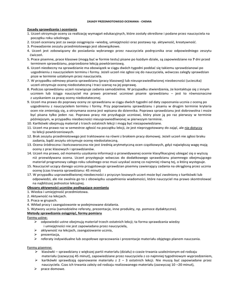 ZASADY PRZEDMIOTOWEGO OCENIANIA - CHEMIA Zasady sprawdzania i oceniania 1. Uczeń otrzymuje oceny za realizację wymagań edukacyjnych, które zostały określone i podane przez nauczyciela na początku roku szkolnego. 2. Uczeń oceniany jest za swoje osiągnięcia –wiedzę, umiejętności oraz postawy np. aktywność, kreatywność. 3. Prowadzenie zeszytu przedmiotowego jest obowiązkowe. 4. Uczeń jest zobowiązany do posiadania wybranego przez nauczyciela podręcznika oraz odpowiedniego zeszytu ćwiczeń. 5. Prace pisemne, prace klasowe (mogą być w formie testu) pisane po każdym dziale, są zapowiedziane na 7 dni przed terminem sprawdzianu, poprzedzone lekcją powtórzeniową. 6. Uczeń nieobecny na sprawdzianie ma obowiązek w ciągu dwóch tygodni poddać się takiemu sprawdzianowi po uzgodnieniu z nauczycielem terminu i formy. Jeżeli uczeń nie zgłosi się do nauczyciela, wówczas zaległy sprawdzian pisze w terminie ustalonym przez nauczyciela. 7. W przypadku odmowy pisania sprawdzianu (pracy klasowej) lub nieusprawiedliwionej nieobecności (ucieczka) uczeń otrzymuje ocenę niedostateczną i traci szansę na jej poprawę. 8. Podczas sprawdzianu uczeń rozwiązuje zadania samodzielnie. W przypadku stwierdzenia, że kontaktuje się z innym uczniem lub ściąga nauczyciel ma prawo przerwać uczniowi pisanie sprawdzianu – jest to równoznaczne z uzyskaniem za pracę oceny niedostatecznej. 9. Uczeń ma prawo do poprawy oceny ze sprawdzianu w ciągu dwóch tygodni od daty zapoznania ucznia z oceną po uzgodnieniu z nauczycielem terminu i formy. Przy poprawianiu sprawdzianu i pisaniu w drugim terminie kryteria ocen nie zmieniają się, a otrzymana ocena jest wpisana do dziennika. Poprawa sprawdzianu jest dobrowolna i może być pisana tylko jeden raz. Poprawa pracy nie przysługuje uczniowi, który pisze ją po raz pierwszy w terminie późniejszym, w przypadku nieobecności nieusprawiedliwionej w pierwszym terminie. 10. Kartkówki obejmują materiał z trzech ostatnich lekcji i mogą być niezapowiedziane. 11. Uczeń ma prawo raz w semestrze zgłosić na początku lekcji, że jest nieprzygotowany do zająć, ale nie dotyczy to lekcji powtórzeniowych. 12. Brak zeszytu przedmiotowego jest traktowane na równi z brakiem pracy domowej. Jeżeli uczeń nie zgłosi braku zadania, bądź zeszytu otrzymuje ocenę niedostateczną. 13. Ocena śródroczna i końcoworoczna nie jest średnią arytmetyczną ocen cząstkowych, gdyż największą wagę mają oceny z prac klasowych i sprawdzianów. 14. Uczeń ma prawo, od momentu uzyskania informacji o przewidywanej ocenie klasyfikacyjnej ubiegać się o wyższą niż przewidywana ocena. Uczeń przystępuje wówczas do dodatkowego sprawdzianu pisemnego obejmującego materiał programowy całego roku szkolnego oraz musi uzyskać ocenę co najmniej równą tej, o którą występuje. 15. Nauczyciel uczący danego ucznia przygotowuje sprawdzian pisemny zawierający zadania na okrągloną przez ucznia ocenę (czas trwania sprawdzianu: 45 minut) 17. W przypadku usprawiedliwionej nieobecności z przyczyn losowych uczeń może być zwolniony z kartkówki lub odpowiedzi, ale nie zwalnia go to z obowiązku uzupełnienia wiadomości, które nauczyciel ma prawo skontrolować na najbliższej jednostce lekcyjnej. Obszary aktywności uczniów podlegające ocenianiu 1. Wiedza i umiejętność przedmiotowa. 2. Aktywność na lekcjach. 3. Praca w grupach. 4. Wkład pracy i zaangażowanie w podejmowane działania. 5. Wytwory ucznia (samodzielne referaty, prezentacje, inne produkty, np. pomoce dydaktyczne). Metody sprawdzania osiągnięć, formy pomiaru Formy ustne: odpowiedzi ustne obejmują materiał trzech ostatnich lekcji; ta forma sprawdzania wiedzy i umiejętności nie jest zapowiadana przez nauczyciela, aktywność na lekcjach, zaangażowanie ucznia, prezentacja, referaty indywidualne lub zespołowe opracowania i prezentacje materiału objętego planem nauczania. Formy pisemne: klasówki – sprawdziany z większej partii materiału (działu) o czasie trwania uzależnionym od rodzaju materiału (zazwyczaj 45 minut), zapowiedziane przez nauczyciela z co najmniej tygodniowym wyprzedzeniem, kartkówki sprawdzają opanowanie materiału z 2 – 3 ostatnich lekcji. Nie muszą być zapowiadane przez nauczyciela. Czas ich trwania zależy od rodzaju realizowanego materiału (zazwyczaj 10 –20 minut), prace domowe. Nadobowiązkowe: zadania dodatkowe np. praca domowa, zazwyczaj w formie pisemnej obejmująca większy zakres materiału związanego z przedmiotem; często wykracza poza materiał programowy. Narzędzia oceniania Pisemne prace klasowe (sprawdziany) oceniane są według następującej skali procentowej; stopień celujący 96 – 100% stopień bardzo dobry 86 – 95% stopień dobry 71 – 85% stopień dostateczny 56 – 70% stopień dopuszczający 41 – 55% stopień niedostateczny 0 – 40% Kryteria ocen wypowiedzi ustnej: poprawność merytoryczna, uzasadnianie odpowiedzi, stosowanie prawidłowej terminologii związanej z przedmiotem, sposób prezentacji – umiejętność formułowania myśli. Kryteria oceny pracy w grupie: organizacja pracy w grupie, komunikacja w grupie, aktywność, układ pracy własnej, współdziałanie, prezentowanie rezultatów pracy. Kryteria oceny zeszytu przedmiotowego: kompletność i systematyczność prowadzenia notatek, poprawność i estetyka wykonywania rysunków, schematów, szkiców. Kryteria oceny pracy domowej: prawidłowe wykonanie, zawartość merytoryczna, wykorzystanie źródła informacji, estetyka wykonania, wkład pracy, oceny uzyskane z zadań domowych mogą ulec weryfikacji poprzez sprawdzenie umiejętności w wypowiedzi ustnej lub pisemnej podczas lekcji. Konkursy mają charakter motywacyjny, uczeń może otrzymać dodatkową ocenę za rozwiązywanie nadobowiązkowych zadań, ocena śródroczna lub roczna może zostać podniesiona o jeden stopień za osiągniecie czołowych lokat w olimpiadach i konkursach 