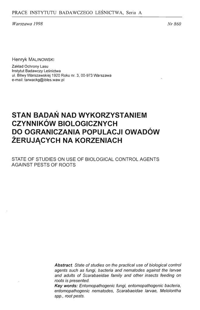PRACE INSTYTUTU BADA WCZEGO LEŚNICTWA, Seria A Warszawa 1998 Nr 860 Henryk MALINOWSKI Zakład Ochrony Lasu Instytut Badawczy Leśnictwa ul. Bitwy Warszawskiej 1920 Roku nr. 3, 00-973 Warszawa e-mail: tarwackg@ibles .waw.pl STAN BADAŃ NAD WYKORZYSTANIEM CZYNNIKÓW BIOLOGICZNYCH DO OGRANICZANIA POPULACJI OWADÓW • ZERUJĄCYCH NA KORZENIACH STATE OF STUDIES ON USE OF BIOlOGICAl CONTROl AGENTS AGAINST PESTS OF ROOTS Abstraet. State of studies on the practical use of biological control agents such as fungi, bacteria and nematodes against the larvae and adults of Scarabaeidae family and other insects feeding on roots is presented. Key words: Entomopathogenic fungi, entomopathogenic bacteria, entomopathogenic nematodes, Scarabaeidae larvae, Melolontha spp., root pests. 1. WPROWADZENIE W ostatnich latach obserwuje się wzrost zagrożenia szkółek oraz upraw leśnych i rolniczych (sadowniczych, warzywniczych itp.) przez latwy owadów z rodziny żukowatych (Coleoptera: Scarabaeidae) zwane pędrakami oraz przez gąsienice motyli (Lepidoptera: Noctuidae), larwy sprężykowatych (Col.: Elaterida e) i inne owady żerujące na korzeniach w Polsce, innych krajach europejskich (Szwajcaria, NielTIcy, Włochy, Francja, Holandia), a także w Ameryce i Japonii. W Polsce największy problem stanowią przejmowane do zalesienia nieuprawiane od kilku lat grunty porolne, gdzie pędraki znalazły doskonałe warunki rozwoju. Najczęściej dotychczas stosowaną w naszym kraju metodą ograniczania liczebności pędraków było używanie środków chemicznych. Ostatnio zaczęto wykorzystywać w większym stopniu zabiegi profilaktyczne i metody mechaniczno-uprawowe opisane uprzednio (MALINOWSKI 1998). Wymienione zabiegi niechemiczne są stosowane w krajach zachodniej Europy jako podstawowe, istotnie ograniczające populacje pędraków. Środki chemiczne przeciwko pędrakom nie są tam używane, co wynika ze sprzeciwu administracji leśnej oraz z przekonania, że wpływają one ujemnie na środowisko, są kosztowne, pracochłonne i nie zawsze dają pożądany efekt. Oprócz zabiegów mechanicznych, w krajach zachodniej Europy wprowadza się do stosowania przeciwko pędrakom biopreparaty oparte na entomopatogenicznych grzybach, nicieniach i bakteriach. W Polsce nie prowadzono dotychczas szerszych badań nad wykorzystaniem wymienionych czynników biologicznych do ograniczania populacji pędraków chrabąszczy i innych owadów żerujących na korzeniach. Mając na uwadze celowość podjęcia prac nad wdrożeniem metod biologicznych w ochronie szkółek i upraw przed pędrakami również w naszym kraju, przedstawiono w niniejszym opracowaniu dotychczasowy stan badań nad wykorzystaniem czynników biologicznej kontroli owadów żerujących na korzeniach. 2. ENTOMOPATOGENICZNE GRZYBY Z przeprowadzonych dotychczas badań * wynika, że spośród entomopatogenicznych grzybów na szczególną uwagę zasługuje Beauveria brongniartii (Sacc.) Petch jako potencjalny czynnik praktycznej kontroli pędraków różnych gatunków owadów. * Niniejsza praca została wykonana głównie w ramach projektu badawczego Naukowych nr 828/P06/96/11. Komitetu Badań Stan badań nad wykorzystaniem czynników biologicznych 105 Możliwości wykorzystania grzyba B. brongniartii do ograniczania populacji chrabąszczy ( Melolontha sp.) jako pierwszy zauważył Leopold le Moult około roku 1880. Zaobserwował on, że wymieniony grzyb może porażać wszystkie stadia rozwojowe chrabąszczy. Niektóre przeprowadzone we Francji na szeroką skalę próby terenowe dały obiecujące wyniki. Pozytywne wyniki tych prób zadecydowały o podjęciu podobnych badań w innych krajach (Szwajcaria, Austria), w tym również w Polsce. Przeprowadzone w tym okresie w naszym kraju próby ograniczania populacji pędraków chrabąszczy za pomocąB. brongniartii nie były " pozytywne (WOSPIEL 1895; JANECZKO 1906). Ponownie przeprowadzono w Polsce badania nad użyciem grzyba B:-brongniartii (określanego mianeln B. densa) przeciwko pędrakom i owadom doskonałym chrabąszczy w latach 1934-1935 na terenie Nadl. Pożarzyn (KARPIŃSKI 1950). Obserwacje wykonano w laboratorium, gdzie zarodnikami grzyba zakażono pędraki, poczwarki i owady doskonałe chrabąszczy majowego i kasztanowca oraz w terenie, opylając owady w czasie rójki sproszkowanymi kulturalni grzyba. Badania te nie dały jednak jednoznacznej odpowiedzi odnośnie możli wości wykorzystania B. brongniartii w praktyce leśnej . Skutki zastosowania grzyba przeciw pędrakom były niezadowalające, a w przypadku postaci doskonałych chrabąszczy redukcja wynosiła 20% (KARPIŃSKI 1937). W wielu przypadkach obserwowano jednak w warunkach naturalnych wyraźną redukcję populacji chrabąszczy (Melolontha spp.) przez omawiany gatunek grzyba. W Polsce występowanie grzyba B. brongniartii w warunkach naturalnych stwierdzono w Nadl. Rudka na Białostocczyźnie w 1936 roku (BAJER 1937). Grzyb ten masowo porażał pędraki chrabąszcza kasztanowca, w wyniku czego uzyskano istotne zmniejszenie liczebności owadów doskonałych i osłabie nie ich rójki. Powyższy przykład może świadczyć o tym, że w warunkach Polski jest możliwe ograniczanie populacji chrabąszczy za pomocą zabiegów przeprowadzonych przy użyciu grzyba B. brongniartii. Na udane przeprowadzenie zabiegów ma wpływ szereg czynników decydujących o możliwościach i przebiegu zakażenia, rozwoju choroby oraz szybkości zamierania owadów. Do tych czynników można zaliczyć między innymi: tennin zabiegu, dawkę i formę użytkową preparatu, rodzaj składnika biologicznego (strzępki grzybni, zarodniki konidialne, blastospory), sposób stosowania i trwałość biopreparatu w środowisku. 2.1. Charakterystyka grzyba Beauveria brongniartii (Sacc.) Petch Gatunek Beauveria brongniartii (Sacc.) Petch należy do grzybów niedoskonałych Deuteromycetes (Fungi Imperfecti) . Jest to sztucznie utworzona grupa, u której nie wykryto dotychczas rozmnażania płcio