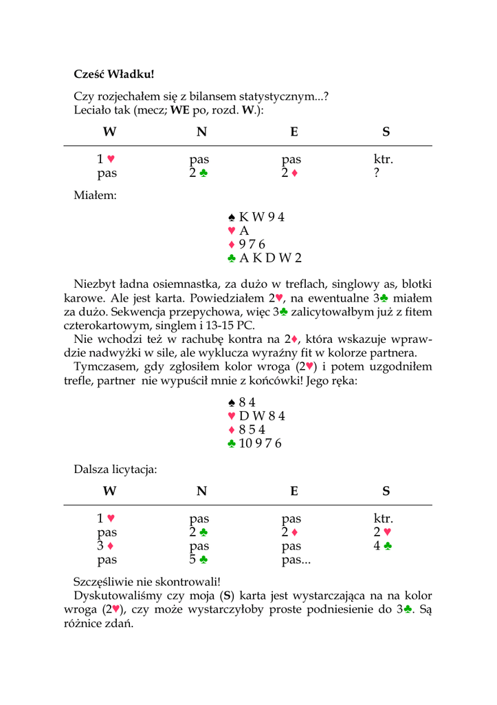 Cześć Władku! Czy rozjechałem się z bilansem statystycznym...? Leciało tak (mecz; WE po, rozd. W.): W N E S 1♥ pas pas 2♣ pas 2♦ ktr. ? Miałem: ♠KW94 ♥A ♦ 976 ♣AKDW2 Niezbyt ładna osiemnastka, za dużo w treflach, singlowy as, blotki karowe. Ale jest karta. Powiedziałem 2 ♥, na ewentualne 3♣ miałem za dużo. Sekwencja przepychowa, więc 3♣ zalicytowałbym już z fitem czterokartowym, singlem i 13-15 PC. Nie wchodzi też w rachubę kontra na 2 ♦, która wskazuje wprawdzie nadwyżki w sile, ale wyklucza wyraźny fit w kolorze partnera. Tymczasem, gdy zgłosiłem kolor wroga (2 ♥) i potem uzgodniłem trefle, partner nie wypuścił mnie z końcówki! Jego ręka: ♠84 ♥DW84 ♦ 854 ♣ 10 9 7 6 Dalsza licytacja: W N E S 1♥ pas 3♦ pas pas 2♣ pas 5♣ pas 2♦ pas pas... ktr. 2♥ 4♣ Szczęśliwie nie skontrowali! Dyskutowaliśmy czy moja (S) karta jest wystarczająca na na kolor wroga (2♥), czy może wystarczyłoby proste podniesienie do 3 ♣. Są różnice zdań. Mnie się wydaje, że bez wejścia 2♦, 3♣ jeszcze jakoś trzyma parametry, choć nadal wydaje mi się zbyt asekuracyjne. Co o tym wszystkim sądzisz? Włodek Odpowiedź Włodku, By wprowadzić w temat brydżystów mniej zaawansowanych, przypomnijmy pewne zasady postępowania związane z bilansem statystycznym. 1) W N E S — pas — 1♥ 1♦ pas ktr. 2♥ Kontra S zgłaszana jest już z 13 pkt i zawiera statystyczną nadzieję na zastanie dwóch lew u partnera. Kolejna akcja S te wymagania względem partnera obniża do jednej lewy. Tak więc 2 ♥ zgłoszone przez S obiecuje jedną lewę nadwyżki, czyli około 16 pkt. Tak zalicytuje np. z taką kartą: a) S: ♠ A 7 6 3 ♥KD82 ♦ 10 3 ♣AD6 a także z taką: b) ♠ A W 10 3 ♥KW94 ♦ 43 ♣ A W 10 Ta ręka zawiera tylko 14 miltonów. Ma jednak wspaniałe podwiązania (dziesiątki i dziewiątki), które ją wyraźnie wzmacniają. Biorąc to pod uwagę, warta jest około 16 punktów. Wszystkie figury pracują, więc jesteś upoważniony do lekkiego przelicytowania i podniesienia do 2♥. Oczywiście podniesienie wymaga czterech atutów. W N E S — pas — 1♥ 1♦ 2♦ ktr. ? ♠ A K 10 ♥ D 10 8 4 ♦ 54 ♣AW72 2♥. Gdyby nie 2♦, spasowałbyś na 1♥. Znalazłeś się jednak pod presją i w takich sytuacjach swe wymagania względem partnera należy nieco obniżyć, a więc na 2♥ wystarczy urodziwa karta, oczywiście z czterema kierami. Ten motyw jeszcze wyraźniej występuje w tego typu sekwencjach: W N 1♥ 3♣ E S ? E posiada: ♠ A9 ♥ D 10 4 ♦ K654 ♣8742 Z którą, gdyby nie interwencja 3 ♣, zgłosiłby tylko 2♥. Teraz jednak poprawną odzywką jest 3♥. Kolejna tego typu sekwencja: W N 1♣ 1♠ ? * kontra sputnik, 4 kiery W z ręką: W: ♠ A 9 ♥ D 10 9 4 ♦ K6 ♣ A 10 9 2 E ktr.* S 2♠ Bilans statystyczny która posiada nadwyżki jedynie w urodzie karty, powinien wznieść się do 3♥. Wydawać by się mogło, że odzywka 3♥ jest błędem, gdyż karta W nie zapewnia bilansu na 9 lew. Jednakowoż w licytacjach dwustronnych opis ręki (wskazanie fitu!) tak znacznie ułatwia dalsze decyzje licytacyjne, że warto go wykonać nawet, gdy zawyża on bilans. Z tego wynika, że w licytacji dwustronnej nasz bilans naciągamy, wierząc że partner nie ma zupełnego minimum, a więc spodziewamy się u niego statystycznej nadwyżki ponadto to, co obiecał swą wcześniejszą zapowiedzią. Zapamiętaj Najważniejszy moment na uzgodnienie koloru partnera przypada wówczas, gdy w licytacji aktywnie uczestniczą przeciwnicy. Powód twej większej niż zwykle aktywności jest taki, że partner powinien wiedzieć, iż naprawdę podoba ci się jego kolor. Natomiast gdy przeciwnicy pasują, nie musisz być agresywny – licytuj precyzyjnie, zgodnie z bilansem. Wznowienie licytacji Pomału kierujemy się ku problemowi, który przesłał Włodek, ale tytułem wstępu nieco teorii. W N E S 1♥ pas pas ? pas ktr. O ile kontra N na 1♥ byłaby bilansowana przy założeniu dwóch statystycznych lew u S , to kontra S na wznowieniu może być o lewę słabsza, skontrujemy np. już z taką kartą: S: ♠ KW93 ♥94 ♦ A 10 6 ♣ W 10 9 2 Wynika to znowu z bilansu statystycznego. Gdy dobiegają do nas pasy, rośnie szansa na zastanie u partnera znaczącej siły. Jednak N mając na uwadze, iż kontra wznawiająca może być słabsza, powinien zachowywać się zachowawczo i nawet z ręką, z którą miałby ochotę skoczyć na 3♣, np. taką: N: ♠ A8 ♥ 10 7 5 2 ♦ 94 ♣KD765 powinien zgłosić jedynie 2♣. Z powyższego wynika, że zgłoszone przez N 2♣ ma stosunkowo szeroki przedział siły. Teraz już na dobre wracamy do naszej problemowej ręki: W N E S 1♥ pas pas 2♣ pas 2♦ ktr. ? S: ♠ K W 9 4 ♥A ♦ 976 ♣AKDW2 S, w kontekście tego co obiecał swą kontrą, ma potężne nadwyżki i powinien je zaakcentować w sposób wyraźny, zwykłe 3♣ tu na pewno nie wystarczy. 3♣ zgłosilibyśmy już np. z taką ręką: S2: ♠ K D 10 8 ♥A2 ♦ 976 ♣AW87 wskazując pełnowartościowy charakter kontry, czterokartowy fit i urodziwą kartę. Wszystko to odbywa się w kontekście bilansu statystycznego, z uwzględnieniem licytacji przeciwników. Nasze oczekiwania względem partnera zmalały – licytujemy do około dwóch lew partnera. Może się zdarzyć, że się zawiedziemy i spotkamy słabszą kartę, z którą przegramy 3♣, ale wtedy będzie to zapewne w obronie wychodzącej częściówki przeciwników. Ważne jest, by stworzyć sobie pewien układ odniesienia. Parter powinien wiedzieć ile lew od niego oczekujemy, czy jego karta jest warta jest więcej niż oczekiwania, mniej, czy w sam raz. Co ma więc zalicytować S z autentyczną kartą? Mamy do wyboru 2♥ oraz 3♥. Zapytałem o zdanie w tej sprawie Krzysztofa Martensa. Oto jego odpowiedź: Władku, Ta karta warta jest dużo więcej niż 3 ♣. Spróbujmy sobie wyobrazić kartę partnera. Ma on 4-5 kierów, 2-3 piki (jak ma trzy piki, to zap