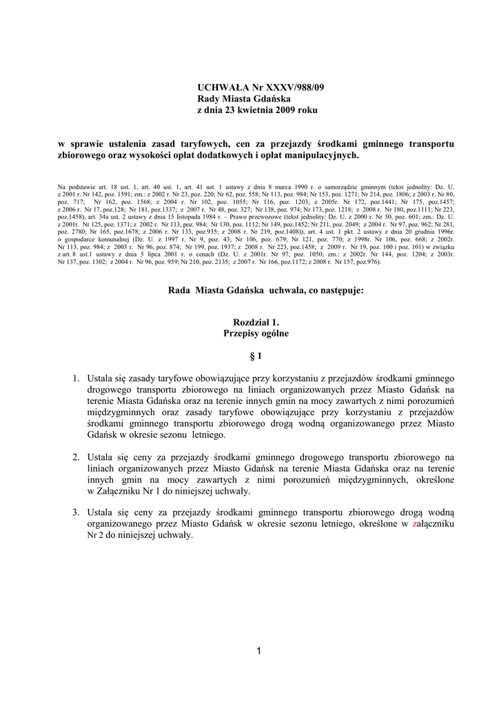 UCHWAŁA Nr XXXV/988/09 Rady Miasta Gdańska z dnia 23 kwietnia 2009 roku w sprawie ustalenia zasad taryfowych, cen za przejazdy środkami gminnego transportu zbiorowego oraz wysokości opłat dodatkowych i opłat manipulacyjnych. Na podstawie art. 18 ust. 1, art. 40 ust. 1, art. 41 ust. 1 ustawy z dnia 8 marca 1990 r. o samorządzie gminnym (tekst jednolity: Dz. U. z 2001 r. Nr 142, poz. 1591; zm.: z 2002 r. Nr 23, poz. 220; Nr 62, poz. 558; Nr 113, poz. 984; Nr 153, poz. 1271; Nr 214, poz. 1806; z 2003 r. Nr 80, poz. 717; Nr 162, poz. 1568; z 2004 r. Nr 102, poz. 1055; Nr 116, poz. 1203; z 2005r. Nr 172, poz.1441; Nr 175, poz.1457; z 2006 r. Nr 17, poz.128; Nr 181, poz.1337; z 2007 r. Nr 48, poz. 327; Nr 138, poz. 974; Nr 173, poz. 1218; z 2008 r. Nr 180, poz.1111; Nr 223, poz.1458), art. 34a ust. 2 ustawy z dnia 15 listopada 1984 r. – Prawo przewozowe (tekst jednolity: Dz. U. z 2000 r. Nr 50, poz. 601; zm.: Dz. U. z 2001r. Nr 125, poz. 1371; z 2002 r. Nr 113, poz. 984; Nr 130, poz. 1112; Nr 149, poz.1452; Nr 211, poz. 2049; z 2004 r. Nr 97, poz. 962; Nr 281, poz. 2780; Nr 165, poz.1678; z 2006 r. Nr 133, poz.935; z 2008 r. Nr 219, poz.1408)), art. 4 ust. 1 pkt. 2 ustawy z dnia 20 grudnia 1996r. o gospodarce komunalnej (Dz. U. z 1997 r. Nr 9, poz. 43; Nr 106, poz. 679; Nr 121, poz. 770; z 1998r. Nr 106, poz. 668; z 2002r. Nr 113, poz. 984; z 2003 r. Nr 96, poz. 874; Nr 199, poz. 1937; z 2008 r. Nr 223, poz.1458; z 2009 r. Nr 19, poz. 100 i poz. 101) w związku z art. 8 ust.1 ustawy z dnia 5 lipca 2001 r. o cenach (Dz. U. z 2001r. Nr 97, poz. 1050; zm.: z 2002r. Nr 144, poz. 1204; z 2003r. Nr 137, poz. 1302; z 2004 r. Nr 96, poz. 959; Nr 210, poz. 2135; z 2007 r. Nr 166, poz.1172; z 2008 r. Nr 157, poz.976). Rada Miasta Gdańska uchwala, co następuje: Rozdział 1. Przepisy ogólne §1 1. Ustala się zasady taryfowe obowiązujące przy korzystaniu z przejazdów środkami gminnego drogowego transportu zbiorowego na liniach organizowanych przez Miasto Gdańsk na terenie Miasta Gdańska oraz na terenie innych gmin na mocy zawartych z nimi porozumień międzygminnych oraz zasady taryfowe obowiązujące przy korzystaniu z przejazdów środkami gminnego transportu zbiorowego drogą wodną organizowanego przez Miasto Gdańsk w okresie sezonu letniego. 2. Ustala się ceny za przejazdy środkami gminnego drogowego transportu zbiorowego na liniach organizowanych przez Miasto Gdańsk na terenie Miasta Gdańska oraz na terenie innych gmin na mocy zawartych z nimi porozumień międzygminnych, określone w Załączniku Nr 1 do niniejszej uchwały. 3. Ustala się ceny za przejazdy środkami gminnego transportu zbiorowego drogą wodną organizowanego przez Miasto Gdańsk w okresie sezonu letniego, określone w załączniku Nr 2 do niniejszej uchwały. 1 Rozdział 2. Zasady taryfowe obowiązujące przy korzystaniu z przejazdów środkami gminnego drogowego transportu zbiorowego §2 1. Ceny za przejazd środkami gminnego drogowego transportu zbiorowego są jednolite przy przewozach tramwajami i autobusami. 2. Podmiotem uprawnionym do emisji biletów jednorazowych i okresowych jest Zarząd Transportu Miejskiego w Gdańsku, zwany dalej „ZTM”. 3. Bilety emitowane przez ZTM obowiązują na liniach organizowanych przez Miasto Gdańsk na terenie Miasta Gdańska oraz na terenie innych gmin, na mocy zawartych porozumień międzygminnych. 4. Do korzystania z gminnego transportu zbiorowego organizowanego przez Miasto Gdańsk uprawniają bilety jednorazowe papierowe, elektroniczne oraz zakupione za pomocą telefonu komórkowego, bilety okresowe oraz dokumenty uprawniające do przejazdu bezpłatnego pod warunkiem, że podmiot kontrolujący ma możliwość sprawdzenia ważności uiszczonej opłaty lub uprawnienia. 5. Bilety innych organizatorów komunalnej komunikacji miejskiej obowiązują na liniach organizowanych przez Miasto Gdańsk na mocy porozumień międzygminnych. 6. Bilety metropolitalne emitowane przez Metropolitalny Związek Komunikacyjny Zatoki Gdańskiej, w którym uczestniczy Miasto Gdańsk, obowiązują na liniach organizowanych przez Miasto Gdańsk na mocy uchwał tego Związku. 7. Podmiotem uprawnionym do dokonywania kontroli biletowej i nakładania opłat dodatkowych jest ZTM lub okresowo inny podmiot wskazany przez ZTM. 8. Taryfa na linie zwykłe, z rodzajami biletów określonymi w Załączniku Nr 1, obowiązuje na: 1) liniach podstawowych, oznaczonych: a) dla autobusów - numerem trzycyfrowym rozpoczynającym się od cyfry - 1**, 3**, 5**, b) dla tramwajów - numerem jedno lub dwucyfrowym od 1 do 19, 2) liniach o ograniczonej liczbie przystanków - oznaczonych numerem trzycyfrowym rozpoczynającym się od cyfry - 2**, 3) liniach sezonowych i okolicznościowych – oznaczonych: a) dla autobusów numerem trzycyfrowym rozpoczynającym się od cyfry - 6**, b) dla tramwajów numerem dwucyfrowym rozpoczynającym się od cyfry - 6*, 4) liniach zjazdowych i dojazdowych - oznaczonych numerem trzycyfrowym rozpoczynającym się od cyfry - 7**, 2 5) liniach tymczasowych - oznaczonych numerem trzycyfrowym rozpoczynającym się od cyfry - 9**, 6) liniach autobusowych za tramwaj - oznaczonych dwucyfrowym - T * lub T**. literą T i numerem jedno lub 9. Taryfa na linie pospieszne o ograniczonej liczbie przystanków z rodzajami biletów określonymi w Załączniku Nr 1, obowiązuje na liniach autobusowych oznaczonych literami. 10. Taryfa na linie nocne z rodzajami biletów określonymi w Załączniku Nr 1, obowiązuje na linie autobusowe i tramwajowe oznaczone literą N oraz numerem jedno lub dwucyfrowym lub literą N*, N**. 11. Taryfa na linie specjalne z rodzajami biletów określonymi w Załączniku Nr 1, obowiązuje na linie autobusowe i tramwajowe oznaczone indywidualnie w stosunku do potrzeb. §3 1. Wprowadza się następujące rodzaje biletów jednorazowych: 1) na jeden przejazd – pełnopłatne i ulgowe, upoważniające do przejazdu jednym pojazdem autobusowym lub tramwajowym od chwili skasowania d