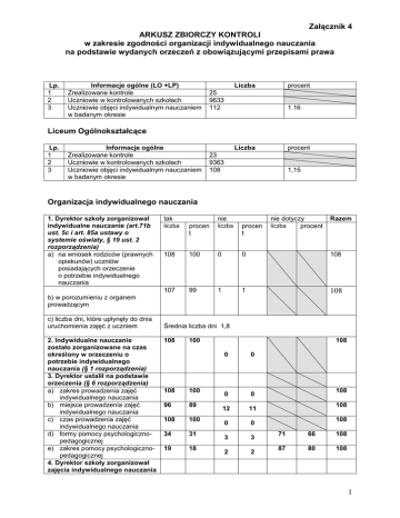 Załącznik 4 ARKUSZ ZBIORCZY KONTROLI w zakresie zgodności organizacji indywidualnego nauczania na podstawie wydanych orzeczeń z obowiązującymi przepisami prawa Lp. 1 2 3 Informacje ogólne (LO +LP) Zrealizowane kontrole Uczniowie w kontrolowanych szkołach Uczniowie objęci indywidualnym nauczaniem w badanym okresie Liczba procent 25 9633 112 1.16 Liceum Ogólnokształcące Lp. 1 2 3 Informacje ogólne Zrealizowane kontrole Uczniowie w kontrolowanych szkołach Uczniowie objęci indywidualnym nauczaniem w badanym okresie Liczba procent 23 9363 108 1,15 Organizacja indywidualnego nauczania 1. Dyrektor szkoły zorganizował indywidualne nauczanie (art.71b ust. 5c i art. 85a ustawy o systemie oświaty, § 19 ust. 2 rozporządzenia) a) na wniosek rodziców (prawnych opiekunów) uczniów posiadających orzeczenie o potrzebie indywidualnego nauczania tak nie nie dotyczy liczba procent Razem liczba procen t liczba procen t 108 100 0 0 108 107 99 1 1 108 b) w porozumieniu z organem prowadzącym c) liczba dni, które upłynęły do dnia uruchomienia zajęć z uczniem 2. Indywidualne nauczanie zostało zorganizowane na czas określony w orzeczeniu o potrzebie indywidualnego nauczania (§ 1 rozporządzenia) 3. Dyrektor ustalił na podstawie orzeczenia (§ 6 rozporządzenia) a) zakres prowadzenia zajęć indywidualnego nauczania b) miejsce prowadzenia zajęć indywidualnego nauczania c) czas prowadzenia zajęć indywidualnego nauczania d) formy pomocy psychologicznopedagogicznej e) zakres pomocy psychologicznopedagogicznej 4. Dyrektor szkoły zorganizował zajęcia indywidualnego nauczania Średnia liczba dni 1,8 108 100 108 100 96 89 108 100 34 31 19 18 108 0 0 0 0 12 11 0 0 3 3 2 2 108 108 108 71 66 108 87 80 108 1 (§ 3 ust. 4 i 5 pkt 2 rozporządzenia): a) w miejscu pobytu ucznia 0 0 b) w domu rodzinnym 53 49 c) indywidualnie w odrębnym pomieszczeniu w szkole 5. Dyrektor powierzył prowadzenie zajęć indywidualnego nauczania w liceum ogólnokształcącym, w liceum profilowanym (§ 3 ust. 2 rozporządzenia): a) jednemu nauczycielowi 54 50 0 0 b) kilku nauczycielom 108 100 6. Dyrektor powierzył prowadzenie zajęć indywidualnego nauczania nauczycielowi zatrudnionemu w innej szkole (§ 3 ust. 3 rozporządzenia): 16 17 0 0 0 0 0 0 108 100 0 0 91 84 108 100 108 55 51 108 54 50 108 0 0 108 0 0 108 0 0 108 Średnia liczba godzin 16 7. Tygodniowy wymiar godzin (od 12 do 16 godzin) zajęć indywidualnego nauczania realizowanych bezpośrednio z uczniem szkoły ponadgimnazjalnej (§ 8 ust.1 rozporządzenia): Liczba udzielonych odpowiedzi Treść odpowiedzi zgodnie z kwalifikacjami niezgodnie z kwalifikacjami Procent 108 100 0 0 108 Razem 100% 9. Tygodniowy wymiar godzin (od 12 do 16 godzin) zajęć indywidualnego nauczania realizowanych bezpośrednio z uczniem szkoły ponadgimnazjalnej (§ 8 ust.1 rozporządzenia): Liczba udzielonych odpowiedzi Treść odpowiedzi zgodny niezgodny Procent 108 100 0 0 108 Razem 100% 2 10. Tygodniowy wymiar godzin zajęć indywidualnego nauczania dla uczniów szkoły ponadgimnazjalnej realizowany jest w ciągu (§ 8 ust. 2 rozporządzenia) Uczniowie, którym indywidualne nauczanie zorganizowano w ciągu 1 2 dni 2 3 dni 3 4-5 dni Razem Średnia liczba dni, w których realizowane jest indywidualne nauczanie dla poszczególnych uczniów. Lp. Liczba Procent 1 4 103 108 4,40 1 4 95 100 11. Organizacja indywidualnego nauczania obejmuje wszystkie obowiązkowe zajęcia edukacyjne wynikające ze szkolnego planu nauczania oddziału, do którego uczęszcza uczeń posiadający orzeczenie o potrzebie indywidualnego nauczania (§ 5 ust.1 rozporządzenia). Liczba udzielonych odpowiedzi Treść odpowiedzi Procent zgodny 68 63 niezgodny 40 37 108 Razem 100% 11a. Nazwy przedmiotów, z obowiązkowych w ramach indywidualnego nauczania. Lp . 1. 2. 3. 4. 5. 6. 7. zajęć edukacyjnych, nie realizowanych Nazwa przedmiotu Liczba wskazań Procent wskazań Wychowanie fizyczne Przysposobienie obronne informatyka Technologia informacyjna Wiedza o społeczeństwie Podstawy przedsiębiorczości Wiedza o kulturze 6 2 1 1 1 1 1 5,55 1,85 0,92 0,92 0,92 0,92 0,92 12. Dyrektor szkoły, w miarę posiadanych możliwości, uwzględniając zalecenia zawarte w orzeczeniu oraz aktualny stan zdrowia, umożliwia uczniom udział (§ 3 ust. 5 pkt 1, § 9 rozporządzenia) a) w zajęciach pozalekcyjnych tak liczba nie dotyczy liczba procent Razem procent 32 30 76 70 108 b) w uroczystościach 60 55,6 48 44,4 108 c) w imprezach szkolnych 61 56,5 47 43,5 108 d) w zajęciach z oddziałem w szkole 47 43,5 61 56,5 108 3 12.1. Udział ucznia w roku szkolnym 2010/2011, w okresie w którym miał zorganizowane indywidualne nauczanie w: Liczba a) zajęciach pozalekcyjnych 32 60 b) uroczystościach 61 c) imprezach szkolnych 47 d) zajęciach z oddziałem w szkole 13. Szkoła prowadzi dziennik indywidualnego nauczania odrębnie dla zakwalifikowanego do indywidualnego nauczania (§ 11 ust. 3 rozporządzenia): Liczba udzielonych odpowiedzi Treść odpowiedzi każdego ucznia Procent tak 108 100 nie 0 0 108 Razem 100% Wyjaśnienia dyrektorów szkół dotyczące stwierdzonych nieprawidłowości: Ad. 1. Dyrektor nie potrafił wyjaśnić przyczyny nieprawidłowości (braku porozumienia z organem prowadzącym), ponieważ organizację nauczania indywidualnego przygotowywał poprzedni dyrektor. Ad. 3. Pani dyrektor nie ustaliła miejsca prowadzenia zajęć w swojej decyzji, ponieważ było ono ustalone w orzeczeniu poradni. W decyzji nie zostały określone formy i zakres pomocy psychologicznopedagogicznej, ale jest możliwość korzystania z tej pomocy na terenie szkoły lub w razie potrzeby kontaktu domowego. Ad. 4. W związku z odległym miejscem zamieszkania i utrudnionym dojazdem nauczycieli uczennica w porozumieniu z rodzicami była dowożona do szkoły. Ad. 10. Na prośbę rodziców ustalono realizację zajęć przez 2 dni w tygodniu, aby zmniejszyć częstotliwość dojazdów do szkoły. 4 Ad. 11. Zarówno rodzice jak i uczniowie