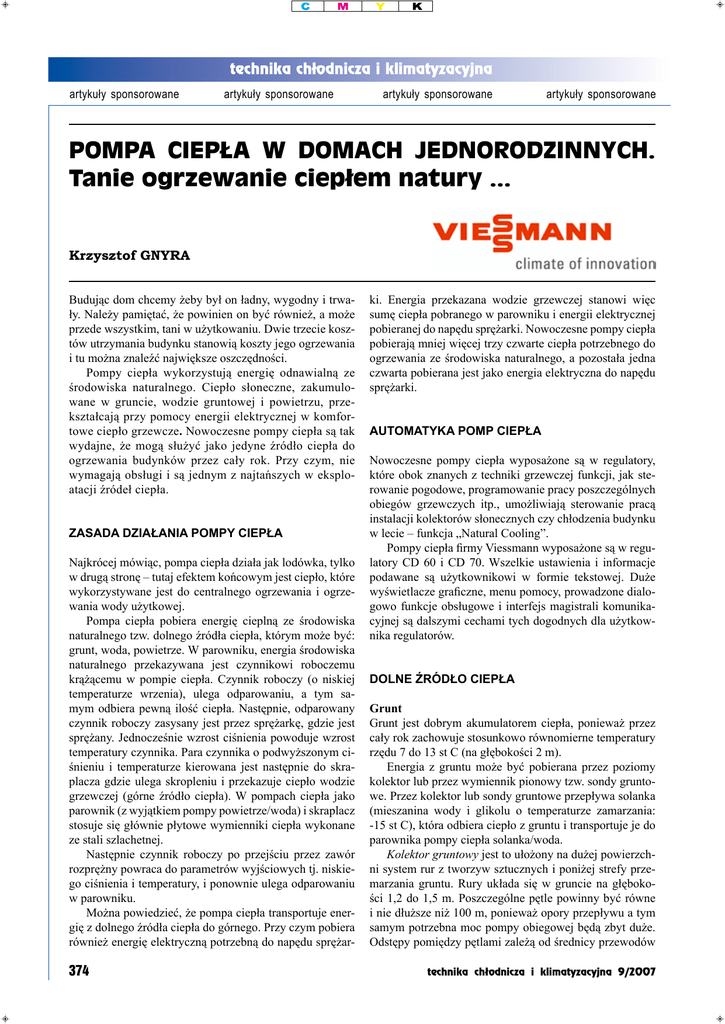 artykuły sponsorowane artykuły sponsorowane artykuły sponsorowane artykuły sponsorowane Pompa ciepła w domach jednorodzinnych. Tanie ogrzewanie ciepłem natury ... Krzysztof GNYRA Budując dom chcemy żeby był on ładny, wygodny i trwały. Należy pamiętać, że powinien on być również, a może przede wszystkim, tani w użytkowaniu. Dwie trzecie kosztów utrzymania budynku stanowią koszty jego ogrzewania i tu można znaleźć największe oszczędności. Pompy ciepła wykorzystują energię odnawialną ze środowiska naturalnego. Ciepło słoneczne, zakumulowane w gruncie, wodzie gruntowej i powietrzu, przekształcają przy pomocy energii elektrycznej w komfortowe ciepło grzewcze. Nowoczesne pompy ciepła są tak wydajne, że mogą służyć jako jedyne źródło ciepła do ogrzewania budynków przez cały rok. Przy czym, nie wymagają obsługi i są jednym z najtańszych w eksploatacji źródeł ciepła. Zasada działania pompy ciepła Najkrócej mówiąc, pompa ciepła działa jak lodówka, tylko w drugą stronę – tutaj efektem końcowym jest ciepło, które wykorzystywane jest do centralnego ogrzewania i ogrzewania wody użytkowej. Pompa ciepła pobiera energię cieplną ze środowiska naturalnego tzw. dolnego źródła ciepła, którym może być: grunt, woda, powietrze. W parowniku, energia środowiska naturalnego przekazywana jest czynnikowi roboczemu krążącemu w pompie ciepła. Czynnik roboczy (o niskiej temperaturze wrzenia), ulega odparowaniu, a tym samym odbiera pewną ilość ciepła. Następnie, odparowany czynnik roboczy zasysany jest przez sprężarkę, gdzie jest sprężany. Jednocześnie wzrost ciśnienia powoduje wzrost temperatury czynnika. Para czynnika o podwyższonym ciśnieniu i temperaturze kierowana jest następnie do skraplacza gdzie ulega skropleniu i przekazuje ciepło wodzie grzewczej (górne źródło ciepła). W pompach ciepła jako parownik (z wyjątkiem pompy powietrze/woda) i skraplacz stosuje się głównie płytowe wymienniki ciepła wykonane ze stali szlachetnej. Następnie czynnik roboczy po przejściu przez zawór rozprężny powraca do parametrów wyjściowych tj. niskiego ciśnienia i temperatury, i ponownie ulega odparowaniu w parowniku. Można powiedzieć, że pompa ciepła transportuje energię z dolnego źródła ciepła do górnego. Przy czym pobiera również energię elektryczną potrzebną do napędu sprężar- 374 ki. Energia przekazana wodzie grzewczej stanowi więc sumę ciepła pobranego w parowniku i energii elektrycznej pobieranej do napędu sprężarki. Nowoczesne pompy ciepła pobierają mniej więcej trzy czwarte ciepła potrzebnego do ogrzewania ze środowiska naturalnego, a pozostała jedna czwarta pobierana jest jako energia elektryczna do napędu sprężarki. Automatyka pomp ciepła Nowoczesne pompy ciepła wyposażone są w regulatory, które obok znanych z techniki grzewczej funkcji, jak sterowanie pogodowe, programowanie pracy poszczególnych obiegów grzewczych itp., umożliwiają sterowanie pracą instalacji kolektorów słonecznych czy chłodzenia budynku w lecie – funkcja „Natural Cooling”. Pompy ciepła firmy Viessmann wyposażone są w regulatory CD 60 i CD 70. Wszelkie ustawienia i informacje podawane są użytkownikowi w formie tekstowej. Duże wyświetlacze graficzne, menu pomocy, prowadzone dialogowo funkcje obsługowe i interfejs magistrali komunikacyjnej są dalszymi cechami tych dogodnych dla użytkownika regulatorów. Dolne źródło ciepła Grunt Grunt jest dobrym akumulatorem ciepła, ponieważ przez cały rok zachowuje stosunkowo równomierne temperatury rzędu 7 do 13 st C (na głębokości 2 m). Energia z gruntu może być pobierana przez poziomy kolektor lub przez wymiennik pionowy tzw. sondy gruntowe. Przez kolektor lub sondy gruntowe przepływa solanka (mieszanina wody i glikolu o temperaturze zamarzania: -15 st C), która odbiera ciepło z gruntu i transportuje je do parownika pompy ciepła solanka/woda. Kolektor gruntowy jest to ułożony na dużej powierzchni system rur z tworzyw sztucznych i poniżej strefy przemarzania gruntu. Rury układa się w gruncie na głębokości 1,2 do 1,5 m. Poszczególne pętle powinny być równe i nie dłuższe niż 100 m, ponieważ opory przepływu a tym samym potrzebna moc pompy obiegowej będą zbyt duże. Odstępy pomiędzy pętlami zależą od średnicy przewodów technika chłodnicza i klimatyzacyjna 9/2007 artykuły sponsorowane artykuły sponsorowane i wynoszą zazwyczaj od 50 do 70 cm. Z kolektora gruntowego najintensywniej pobierane jest ciepło w okresie zimowym, natomiast regeneruje się on przede wszystkim w okresach cieplejszych, tj. wiosną i latem. Regeneracja gruntu następuje przede wszystkim dzięki promieniowaniu słonecznemu oraz opadom atmosferycznym, co zapewnia że grunt zakumuluje znowu ciepło na następny sezon grzewczy. Właściwości akumulacyjne i przewodność cieplna są tym większe im bardziej grunt jest nasycony wodą, im więcej jest składników mineralnych i im mniejsza jest jego porowatość. Możliwe do pobrania z gruntu moce jednostkowe mieszczą się w zakresie od ok. 10 do 35 W/m2 powierzchni gruntu (grunt piaszczysty, suchy: 10 do 15 W/m2; piaszczysty, wilgotny: 15 do 20 W/m2; grunt ilasty, suchy: 20 do 25 W/m2; ilasty, wilgotny: 25 do 30 W/m2; grunt wodonośny: 30 do 35 W/m2). Sondy gruntowe nie wymagają dużej powierzchni, ponieważ rury wprowadzane są pionowo w głąb gruntu, zwykle na głębokość od 50 do 100 metrów. W odwiert wpuszcza się prefabrykowaną sondę, a następnie wolna przestrzeń zasypywana jest materiałem wypełniającym. Sondy wykonuje się w formie pojedynczej lub podwójnej U-rury (rury PE). Podwójna U-rura jest o tyle pewniejsza, że w przypadku uszkodzenia jednej pętli, nie dyskwalifikuje to całego odwiertu. Przy normalnych warunkach hydrogeologicznych można przyjąć orientacyjną średnią moc jednostkową sondy gruntowej 50 W/m długości sondy. Woda gruntowa Woda g