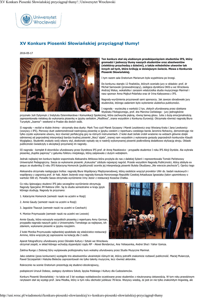 XV Konkurs Piosenki Słowiańskiej przyciągnął tłumy! | Uniwersytet Wrocławski XV Konkurs Piosenki Słowiańskiej przyciągnął tłumy! 2016-05-17 Ten konkurs stał się ulubionym przedsięwzięciem studentów IFS, który gromadzi i jednoczy tłumy naszych studentów oraz absolwentów (niektórzy przychodzą z dziećmi), a także miłośników utworów tak innych od tych, które królują w dzisiejszym świecie. Mowa o Konkursie Piosenki Słowiańskiej. I tym razem sala Oratorium Marianum była wypełniona po brzegi. Do konkursu stanęło 12 finalistów, których oceniało jury w składzie: prof. dr Michał Sarnowski (przewodniczący), zastępca dyrektora OKiS-u we Wrocławiu Andrzej Walus, wokalistka i zarazem właścicielka studia muzycznego Marimal i nasz sponsor Anna Majkut-Polańska oraz dr Irina Kabyszewa z IFS. Nagrody-wyróżnienia przyznawali sami sponsorzy. Jak zawsze obradowało jury studenckie, którego zadaniem było wyłonienie ulubieńca publiczności. I nagrodę - wycieczkę o wartości 2 tys. złotych ufundowaną przez dziekana Wydziału Filologicznego, prof. dra Marcina Cieńskiego - jury jednogłośnie przyznało Julii Dytynnyk z Instytutu Dziennikarstwa i Komunikacji Społecznej, która zachwyciła piękną, równą barwą głosu. Julia z dużą emocjonalnością zaprezentowała niełatwą do wykonania piosenkę w języku serbskim „Modlitwa”, znana wszystkim z Konkursu Eurowizji. Otrzymała również nagrodę Biura Turystyki „Joanna”- weekend w Pradze dla dwóch osób. II nagrodę – recital w klubie Anima - otrzymały dwa duety: Mark Two czyli Marek Szczęsny i Marek Leszkiewicz oraz Wiwianą Krata i Jana Lewkowicz (wszyscy z IFS). Pierwszy duet zademonstrował nastrojową piosenkę w języku czeskim z repertuaru czeskiego barda Jaromira Nohavicy, demonstrując nie tylko czyste wykonanie utworu, lecz również perfekcyjną grę na różnych instrumentach. Z kolei duet żeński zrobił wrażenie na widzach głównie dzięki odmiennej od poprzedniej interpretacji bardzo trudnej piosenki „Nocz’ sijała”, znanej nam wszystkim z wykonania gwiazdy poprzednich konkursów Klaudii Wyglądacz. Studentki znalazły swój własny styl, doskonale wpisały się w nastrój wykonywanej piosenki podkreśloną dodatkowo stylizacją stroju. Oklaski publiczności świadczyły o akceptacji przyznanej im nagrody. III nagroda - komplet 8 słowników ufundowany przez Dyrektora IFS prof. dr Annę Paszkiewicz - przypadła studentce I roku IFS Alicji Dyrdzie. Ala wybrała piosenkę „Kupitie papirosy” z gatunku folkloru miejskiego, którą zaśpiewała z dużym wdziękiem. Jednak najlepiej ten konkurs będzie wspominała Aleksandra Attikowa która przybyła do nas z dalekiej Syberii i reprezentowała Tomski Państwowy Uniwersytet Pedagogiczny. Sasza za wykonanie piosenki „Kukuszka” zdobyła najwięcej nagród. Przede wszystkim Nagrodę Publiczności, którą zdobyła ex aequo ze studentką II roku IFS Katarzyną Homoncik (publiczność oceniła jej interpretację piosenki Bułata Okudżawy „Nie wierzcie piechocie”). Oprócz tego Aleksandra otrzymała następujące trofea: nagrodę Biura Współpracy Międzynarodowej, którą osobiście wręczył prorektor UWr ds. badań naukowych i współpracy z zagranicą prof. dr hab. Adam Jezierski oraz nagrodę Konsula Honorowego Republiki Czeskiej Arkadiusza Ignasiaka (talon upominkowy o wartości 500 zł). Ponadto Sasza otrzymała wyróżnienie Iriny Jezior z restauracji Kozacka Chatka. Co roku śpiewający studenci IFS jako szczególne wyróżnienie otrzymują Nagrody Specjalne JM Rektora UWr. Są to studia semestralne w kraju język którego studiują. Nagrody te przyznano: 1. Katarzynie Homoncik (semestr nauki na uczelni w Rosji) 2. Annie Gaudy (semestr nauki na uczelni w Rosji) 3. Jagodzie Tkaczyk (semestr nauki na uczelni w Czechach) 4. Monice Przymuszale (semestr nauki na uczelni we Lwowie) Annie Gaudy, która wzruszyła wszystkich piosenką z repertuaru Anny German, przypadła nagroda naszych gości z Uniwersytetu Tomskiego za najlepsze, ich zdaniem, wykonanie piosenki w języku rosyjskim. Z kolei Monika Przymuszała najbardziej spodobała się właścicielce restauracji Armine, która wręczyła jej zaproszenie na kolację dla 2 osób. Aparat fotograficzny ufundowany przez Ośrodek Kultury i Sztuki we Wrocławiu otrzymał zespół, w skład którego wchodzą stypendyści rządu RP - Alexei Bondarciuc, Ana Yeliseyenka, Andrei Shut i Yahor Gomza. Żaklina Runge z Zielonej Góry wyśpiewała profesjonalny kurs wokalny ufundowany przez Studio Muzyczne Marimal. Jako ostatnie (poza konkursem) wystąpiło trio absolwentów ukrainistyki różnych lat, którzy potrafili znakomicie rozbawić publiczność. Maciej Mularczyk, Paweł Szczepański i Halszka Bielecka zaprezentowali nie tylko talenty muzyczne, lecz również aktorskie. Rokrocznie na scenie Oratorium prezentują się studenci-obcokrajowcy, podopieczni Urszuli Dobesz, zastępcy dyrektora Szkoły Języka Polskiego i Kultury dla Cudzoziemców. Konkurs Piosenki Słowiańskiej – to także od 3 lat występy wykładowców oczekiwane przez studentów z nieukrywaną ciekawością. W tym roku prawdziwym rarytasem stał się występ prof. Jana Miodka, który w tym roku obchodzi jubileusz 70-lecia. Wszyscy wiedzą, że jest on nie tylko znakomitym lingwistą, ale http://uni.wroc.pl/wiadomości/konkurs-piosenki-slowianskiej/xv-konkurs-piosenki-słowiańskiej-przyciągnął-tłumy XV Konkurs Piosenki Słowiańskiej przyciągnął tłumy! | Uniwersytet Wrocławski również znakomitym śpiewakiem. Po wykonaniu „Starzyka”, Pan Profesor został zmuszony do bisowania. Publiczność żegnała go burzliwymi oklaskami na stojąco śpiewając Mu „Sto lat”. Nasz Instytut ma swoje gwiazdy nie tylko wśród studentów, lecz i wykładowców. Nie zawiodła i tym razem dr Monika Jasińska-Okulewicz, która wraz ze swoimi studentami w radosny, energetyczny sposób promowała Uniwersy