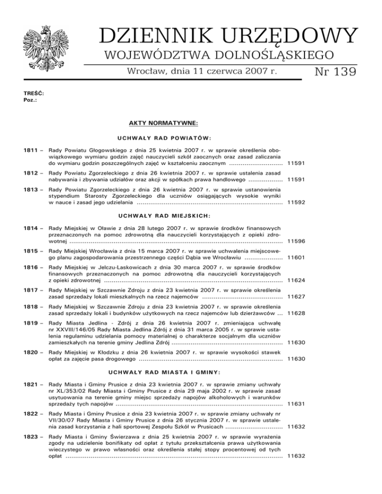WOJEWÓDZTWA DOLNOŚLĄSKIEGO Wrocław, dnia 11 czerwca 2007 r. Nr 139 TREŚĆ: Poz.: AKTY NORMATYWNE: UCHWAŁY RAD POWIATÓW: 1811 – Rady Powiatu Głogowskiego z dnia 25 kwietnia 2007 r. w sprawie określenia obowiązkowego wymiaru godzin zajęć nauczycieli szkół zaocznych oraz zasad zaliczania do wymiaru godzin poszczególnych zajęć w kształceniu zaocznym ................................ 11591 1812 – Rady Powiatu Zgorzeleckiego z dnia 26 kwietnia 2007 r. w sprawie ustalenia zasad nabywania i zbywania udziałów oraz akcji w spółkach prawa handlowego .............................. 11591 1813 – Rady Powiatu Zgorzeleckiego z dnia 26 kwietnia 2007 r. w sprawie ustanowienia stypendium Starosty Zgorzeleckiego dla uczniów osiągających wysokie wyniki w nauce i zasad jego udzielania ........................................................................................ 11592 UCHWAŁY RAD MIEJSKICH: 1814 – Rady Miejskiej w Oławie z dnia 28 lutego 2007 r. w sprawie środków finansowych przeznaczonych na pomoc zdrowotną dla nauczycieli korzystających z opieki zdrowotnej ........................................................................................................................... 11596 1815 – Rady Miejskiej Wrocławia z dnia 15 marca 2007 r. w sprawie uchwalenia miejscowego planu zagospodarowania przestrzennego części Dąbia we Wrocławiu ................................ 11601 1816 – Rady Miejskiej w Relczu-Laskowicach z dnia 30 marca 2007 r. w sprawie środków finansowych przeznaczonych na pomoc zdrowotną dla nauczycieli korzystających z opieki zdrowotnej ................................................................................................11624 1817 – Rady Miejskiej w Szczawnie Zdroju z dnia 23 kwietnia 2007 r. w sprawie określenia zasad sprzedaży lokali mieszkalnych na rzecz najemców ...................................................... 11627 1818 – Rady Miejskiej w Szczawnie Zdroju z dnia 23 kwietnia 2007 r. w sprawie określenia zasad sprzedaży lokali i budynków użytkowych na rzecz najemców lub dzierżawców ............... 11628 1819 – Rady Miasta Redlina - Zdrój z dnia 26 kwietnia 2007 r. zmieniająca uchwałę nr XXVIII/146/05 Rady Miasta Redlina Zdrój z dnia 31 marca 2005 r. w sprawie ustalenia regulaminu udzielania pomocy materialnej o charakterze socjalnym dla uczniów zamieszkałych na terenie gminy Redlina Zdrój ................................................................ 11630 1820 – Rady Miejskiej w Rłodzku z dnia 26 kwietnia 2007 r. w sprawie wysokości stawek opłat za zajęcie pasa drogowego ....................................................................................... 11630 UCHWAŁY RAD MIASTA I GMINY: 1821 – Rady Miasta i Gminy Prusice z dnia 23 kwietnia 2007 r. w sprawie zmiany uchwały nr XL/353/02 Rady Miasta i Gminy Prusice z dnia 29 maja 2002 r. w sprawie zasad usytuowania na terenie gminy miejsc sprzedaży napojów alkoholowych i warunków sprzedaży tych napojów ................................................................................................ 11631 1822 – Rady Miasta i Gminy Prusice z dnia 23 kwietnia 2007 r. w sprawie zmiany uchwały nr VII/30/07 Rady Miasta i Gminy Prusice z dnia 26 stycznia 2007 r. w sprawie ustalenia zasad korzystania z hali sportowej Zespołu Szkół w Prusicach ................................ 11632 1823 – Rady Miasta i Gminy Świerzawa z dnia 25 kwietnia 2007 r. w sprawie wyrażenia zgody na udzielenie bonifikaty od opłat z tytułu przekształcenia prawa użytkowania wieczystego w prawo własności oraz określenia stałej stopy procentowej od tych opłat ............................................................................................................................. 11632 Dziennik Urzędowy Województwa Dolnośląskiego Nr 139 – 11590 – UCHWAŁY RAD GMIN: 1824 – Rady Gminy w Wińsku z dnia 28 marca 2007 r. w sprawie przekształcenia Samodzielnego Zespołu Publicznych Zakładów Lecznictwa Ambulatoryjnego w Rrzelowie ................ 11633 1825 – Rady Gminy w Miłkowicach z dnia 20 kwietnia 2007 r. w sprawie zasad gospodarowania nieruchomościami stanowiącymi własność Gminy Miłkowice ................................ 11634 1826 – Rady Gminy w Ranowicach Wielkich z dnia 26 kwietnia 2007 r. w sprawie regulaminu utrzymania czystości i porządku na terenie Gminy Ranowice Wielkie ................................ 11640 1827 – Rady Gminy Zagrodno z dnia 26 kwietnia 2007 r. w sprawie regulaminu dodatków i innych składników wynagradzania nauczycieli oraz warunków ich obliczania i wypłacania, obowiązującego w 2007 roku .................................................................................. 11644 INNE AKTY PRAWNE: ZARZĄDZENIA: 1828 – Burmistrza Miasta i Gminy Relcza - Laskowic z dnia 30 kwietnia 2007 r. w sprawie wymagań, jakie powinien spełniać przedsiębiorca ubiegający się o uzyskanie zezwolenia na odbiór odpadów komunalnych od właścicieli nieruchomości na terenie gminy Relcz – Laskowice oraz opróżniania zbiorników bezodpływowych i transportu nieczystości ciekłych z terenu gminy Relcz – Laskowice ................................................................ 11647 1829 – Burmistrza Miasta i Gminy Bierutów z dnia 28 maja 2007 r. w sprawie wymagań, jakie powinien spełniać przedsiębiorca ubiegający się o uzyskanie zezwolenia na odebranie odpadów komunalnych od właścicieli nieruchomości oraz opróżnianie zbiorników bezodpływowych i transport nieczystości ciekłych, ochrony przed bezdomnymi zwierzętami, prowadzenia schronisk dla bezdomnych zwierząt oraz grzebowisk i spalarni zwłok zwierzęcych i ich części ................................................................................... 11649 0BWIESZCZENIA: 1830 – Romisarza Wyborczego w Releniej Górze z dnia 28 maja 2007 r. o wynikach wyborów uzupełniających do Rady Miejskiej Gminy Lubomierz przeprowa