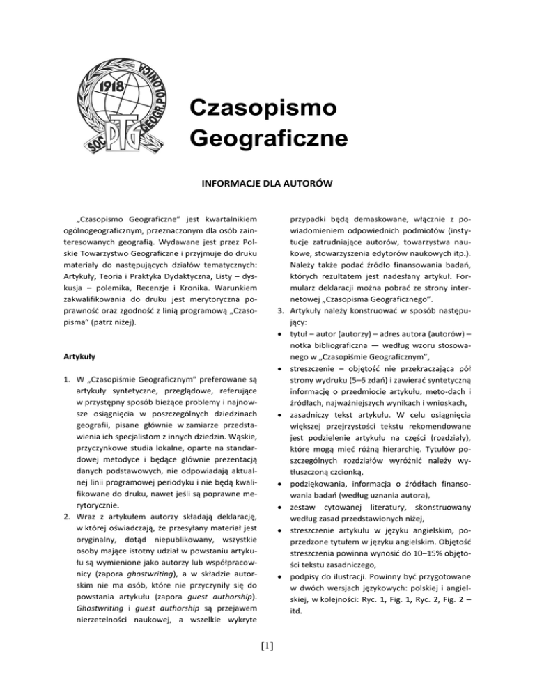Czasopismo Geograficzne INFORMACJE DLA AUTORÓW „Czasopismo Geograficzne” jest kwartalnikiem ogólnogeograficznym, przeznaczonym dla osób zainteresowanych geografią. Wydawane jest przez Polskie Towarzystwo Geograficzne i przyjmuje do druku materiały do następujących działów tematycznych: Artykuły, Teoria i Praktyka Dydaktyczna, Listy – dyskusja – polemika, Recenzje i Kronika. Warunkiem zakwalifikowania do druku jest merytoryczna poprawność oraz zgodność z linią programową „Czasopisma” (patrz niżej). 3. Artykuły 1. W „Czasopiśmie Geograficznym” preferowane są artykuły syntetyczne, przeglądowe, referujące w przystępny sposób bieżące problemy i najnowsze osiągnięcia w poszczególnych dziedzinach geografii, pisane głównie w zamiarze przedstawienia ich specjalistom z innych dziedzin. Wąskie, przyczynkowe studia lokalne, oparte na standardowej metodyce i będące głównie prezentacją danych podstawowych, nie odpowiadają aktualnej linii programowej periodyku i nie będą kwalifikowane do druku, nawet jeśli są poprawne merytorycznie. 2. Wraz z artykułem autorzy składają deklarację, w której oświadczają, że przesyłany materiał jest oryginalny, dotąd niepublikowany, wszystkie osoby mające istotny udział w powstaniu artykułu są wymienione jako autorzy lub współpracownicy (zapora ghostwriting), a w składzie autorskim nie ma osób, które nie przyczyniły się do powstania artykułu (zapora guest authorship). Ghostwriting i guest authorship są przejawem nierzetelności naukowej, a wszelkie wykryte [1] przypadki będą demaskowane, włącznie z powiadomieniem odpowiednich podmiotów (instytucje zatrudniające autorów, towarzystwa naukowe, stowarzyszenia edytorów naukowych itp.). Należy także podać źródło finansowania badań, których rezultatem jest nadesłany artykuł. Formularz deklaracji można pobrać ze strony internetowej „Czasopisma Geograficznego”. Artykuły należy konstruować w sposób następujący: tytuł – autor (autorzy) – adres autora (autorów) – notka bibliograficzna — według wzoru stosowanego w „Czasopiśmie Geograficznym”, streszczenie – objętość nie przekraczająca pół strony wydruku (5–6 zdań) i zawierać syntetyczną informację o przedmiocie artykułu, meto-dach i źródłach, najważniejszych wynikach i wnioskach, zasadniczy tekst artykułu. W celu osiągnięcia większej przejrzystości tekstu rekomendowane jest podzielenie artykułu na części (rozdziały), które mogą mieć różną hierarchię. Tytułów poszczególnych rozdziałów wyróżnić należy wytłuszczoną czcionką, podziękowania, informacja o źródłach finansowania badań (według uznania autora), zestaw cytowanej literatury, skonstruowany według zasad przedstawionych niżej, streszczenie artykułu w języku angielskim, poprzedzone tytułem w języku angielskim. Objętość streszczenia powinna wynosić do 10–15% objętości tekstu zasadniczego, podpisy do ilustracji. Powinny być przygotowane w dwóch wersjach językowych: polskiej i angielskiej, w kolejności: Ryc. 1, Fig. 1, Ryc. 2, Fig. 2 – itd. Zestaw cytowanej literatury, streszczenie angielskie i podpisy do ilustracji powinny być zamieszczone na osobnych kartkach. 4. Objętość nadsyłanych artykułów nie powinna przekraczać 20 stron wydruku, wliczając zestaw literatury i streszczenie angielskie. Jeśli objętość planowanego artykułu jest większa, prosimy o wcześniejszy kontakt z Redakcją. 5. Artykuły należy nadsyłać do redakcji w następującej formie: wydruk jednostronny, format A4, z odstępem pomiędzy wierszami 1,5 (33–34 wiersze na stronie), preferowany krój czcionki Times New Roman 12 punktów, ze standardowymi marginesami o szerokości 2,5 cm, strony wydruku kolejno ponumerowane. Dopuszczalne jest użycie na wydruku czcionki pochyłej dla wyróżnienia dłuższych cytatów, terminów obcojęzycznych i tytułów w opisach bibliograficznych; natomiast podkreślenia należy zaznaczać ołówkiem. Artykuły należy nadsyłać w trzech egzemplarzach. 6. Niezależnie od wydruków pełen tekst należy przesłać na dyskietce lub płycie CD. Tabele i ryciny należy zapisywać jako osobne pliki. Formatowanie należy ograniczyć do minimum i odstępstwa od standardowego kroju czcionki, za wyjątkiem zastosowania czcionki pochyłej, zaznaczać ołówkiem na wydruku. Preferowanym formatem zapisu tekstu jest RTF. 7. Cytowanie w tekście artykułu powinno mieć formę: [Walter 1993] lub: „Walter [1993] wykazał, że...”. Jeśli z danego roku pochodzi więcej niż jedna cytowana praca, należy stosować wyróżnienia [Walter 1994a, b]. W przypadku dwóch autorów cytowanej pracy należy podawać oba nazwiska: [Sosnowski, Jodłowski 1980], w przypadku trzech i więcej: [Sosnowski i in. 1982]. Nie należy podawać inicjałów imion, poza przypadkiem zbieżności nazwisk, a powołania na literaturę umieszczać w nawiasach kwadratowych. W przypadku równoczesnego powoływania się na wiele prac należy je podawać w chronologicznej kolejności ukazywania się, np. [Sosnowski, Jodłowski 1980, Sosnowski i in. 1982, Aronson 1993]. 8. Zestawienie cytowanej literatury po-winno być zatytułowane Literatura i zawierać pełne dane bibliograficzne wszystkich pozycji cytowanych w tekście zasadniczym, przypisach i opisach ilustracji. Nie może ono natomiast zawierać opisów pozycji nie cytowanych w tekście. Literatura powinna być zestawiona według auto-rów w kolejności alfabetycznej, w dalszej kolejności według dat wy-dania artykułów lub książek. Jeśli w tym samym roku ukazało się więcej niż jedna cytowana pozycja, należy stosować zapis np. „1994a”, „1994b”, zgodnie ze sposobem powoływania się na te prace w tekście. W przypadkach prac kilku autorów kolejno zamieszcza się notki prac sygnowanych przez dwóch autorów, trzech itd. W opisach tytuł artykułu, rozdziału z pracy zbiorowej lub książki należ