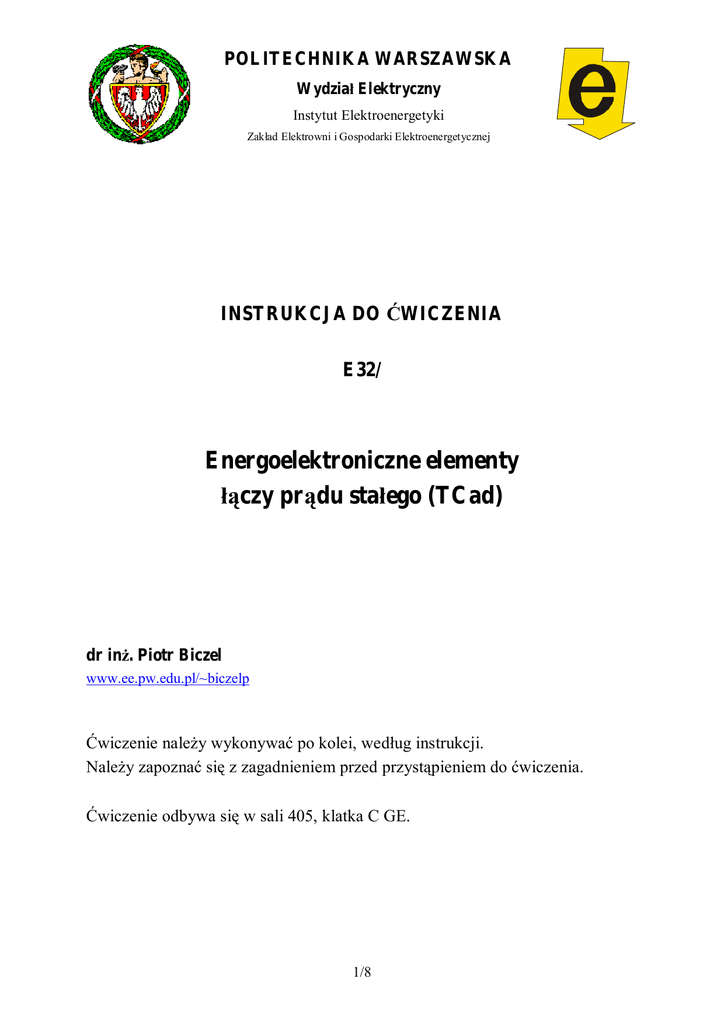POLITECHNIKA WARSZAWSKA Wydział Elektryczny Instytut Elektroenergetyki Zakład Elektrowni i Gospodarki Elektroenergetycznej INSTRUKCJA DO ĆWICZENIA E32/ Energoelektroniczne elementy łączy prądu stałego (TCad) dr inż. Piotr Biczel www.ee.pw.edu.pl/~biczelp Ćwiczenie należy wykonywać po kolei, według instrukcji. Należy zapoznać się z zagadnieniem przed przystąpieniem do ćwiczenia. Ćwiczenie odbywa się w sali 405, klatka C GE. 1/8 Ćwiczenie „Energoelektroniczne elementy łączy prądu stałego (TCad)” Pakiet symulacyjny TCad Program TCad jest polskim programem do symulacji układów energoelektronicznych, szczególnie dużej mocy. Dzięki zastosowaniu prostych, ale dobrze dobranych algorytmów numerycznych oraz modeli elementów obwodu doskonale nadaje się do projektowania złożonych układów przekształtnikowych. Pod wieloma względami przewyższa zagraniczne pakiety tego typu. Opis TCad’a można znaleźć na stronie programu www.tcad.com.pl. Tam też można pobrać wersję demo, co gorąco polecam. Program jest bardzo prosty w obsłudze. Do wykonania ćwiczenia wystarczy znajomość następujących funkcji: uruchomienie i zakończenie symulacji, analiza harmonicznych, zmiana parametru. Aby uruchomić symulację należy kliknąć ikonę . Po zakończeniu obliczeń ikona będzie migać na czerwono i niebiesko. Jej naciśnięcie spowoduje zamknięcie symulacji i wszystkich przebiegów. Nie naciskać przed przeprowadzeniem wszystkich analiz. Rys. 1. Menu kontekstowe TCad’a 2/8 Ćwiczenie „Energoelektroniczne elementy łączy prądu stałego (TCad)” Aby wykonać analizę harmonicznych należy w obszarze okna kliknąć prawym klawiszem myszy i wybrać funkcję „Wyświetl harmoniczne” (rys. 1). Otworzy się okno parametrów analizy, które należy odpowiednio wypełnić (wybrać 40 harmonicznych). Po przeprowadzeniu analizy otrzymane dane zapisać. Aby zmienić parametry elementu należy go kliknąć dwukrotnie. Otworzy się okno dialogowe, w którym należy zmienić odpowiednie dane i kliknąć OK. Łącza prądu stałego Łącze prądu stałego to odcinek linii, w której energia przekazywana jest prądem stałym. Linia prądu stałego po obu stronach zakończona jest urządzeniami do przetwarzania prądu zmiennego na prąd stały i odwrotnie. Uproszczony schemat blokowy takiego układu przedstawia rys. 2. Rys. 2. Uproszczony schemat blokowy łącza prądu stałego Linie prądu stałego przeżywają dziś renesans. Dzieje się tak, ponieważ stało się możliwe budowanie przekształtników energoelektronicznych na moce rzędu megawatów i napięcia setek kilowoltów. W urządzeniach tych królują przekształtniki oparte na diodach, tyrystorach i tyrystorach GTO. Mimo podejmowanych prób wysokonapięciowe układy tranzystorowe wciąż nie dorównują parametrami, niezawodnością, ceną i wielkością układom tyrystorowym [5]. Szczegółowy opis rozwiązań wysoko napięciowych linii prądu stałego można znaleźć w [2]. Oprócz przesyłu kablami po dnie morza na znaczne odległości, linie prądu stałego mają za zadanie łączyć systemy energetyczne, w których stosuje się napięcia o różnych parametrach, a w szczególności o różnej częstotliwości. Obwód prądu stałego uniezależnia wtedy przesył energii od warunków napięciowo-częstotliwościowych w obu łączonych systemach. Możliwym się staje np. przekazywanie energii z sieci 60 Hz do sieci 50 Hz. Łącza prądu stałego znajdują również zastosowanie w dynamicznie rozwijającej się energetyce wiatrowej. Pozwalają one na znaczną poprawę efektywności elektrowni wiatrowych dzięki zastosowaniu generatorów zmienno obrotowych. Przykładem wiodącym są tu elektrownie Enercon [3]. Również łącza te planuje się wykorzystywać do przesyłu energii z farm wiatrowych budowanych w morzu. Oprócz wspomnianych wyżej zastosowań, podobną strukturę wykorzystuje się w zasobnikach energii oraz do przyłączania mikrosieci zawierających znaczny udział odnawialnych, niestabilnych źródeł energii. Chociaż znacznie niższe napięcia pozwalają na stosowanie tu 3/8 Ćwiczenie „Energoelektroniczne elementy łączy prądu stałego (TCad)” przekształtników tranzystorowych, to jednak w warunkach krajowych, w zakresie napięć powyżej 6 kV bardziej opłacalne okazuje się budowanie układów tyrystorowych. Wysokonapięciowe prostowniki i falowniki dużej mocy Dla mocy rzędu megawatów w zasadzie niepodzielnie królują wielopulsowe układy diodowe i tyrystorowe. Wynika to z wielokrotnie wyższych prądów i napięć przewodzonych przez te elementy niż przez tranzystory. Układy wielopulsowe powstają przez równoległe lub szeregowe połączenie mostków sześciopulsowych [5]. Przy czym w układach wysokiego napięcia mostki łączy się szeregowo. Przykład pokazałem na rys. 3. Wysokie napięcia wymuszają również konieczność łączenia szeregowego elementów półprzewodnikowych. Rys. 3. Przykładowy prostownik dwudziestoczteropulsowy 4/8 Ćwiczenie „Energoelektroniczne elementy łączy prądu stałego (TCad)” Rys. 4. Element wysokonapięciowy Oprócz prostowników potrzebne są również falowniki. Falowniki mają strukturę identyczną z tą z rys. 3. Różnica polega na tym, że źródło prądu stałego podłącza się odwrotnie niż to jest pokazane na rys. 3. Oprócz zmiany polaryzacji zmienia się również sposób sterowania tyrystorów. Całość układu ma schemat uproszczony jak na rys. 5. Zmiana kierunku przepływu energii jest realizowana poprzez zmianę polaryzacji obwodu prądu stałego i zmianę sposbu wysterowania tyrystorów. Ponieważ układy tyrystorowe to układy o komutacji sieciowej, potrzebują do pracy napięcia sieci. W wypadku prostownika wydaje się to oczywiste. Jednak falownik też potrzebuje napięcia sieci do wymuszenia komutacji elementów. Musi zatem wspó łpracować z innym źródłem. Szczegó łowy opis falowników tyrystorowych