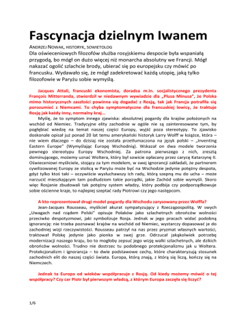 Fascynacja dzielnym Iwanem ANDRZEJ NOWAK, HISTORYK, SOWIETOLOG Dla oświeceniowych filozofów służba rosyjskiemu despocie była wspaniałą przygodą, bo mógł on dużo więcej niż monarcha absolutny we Francji. Mógł nakazać ogolić szlachcie brody, ubierać się po europejsku czy mówić po francusku. Wydawało się, że mógł zadekretować każdą utopię, jaką tylko filozofowie w Paryżu sobie wymyślą. Jacques Attali, francuski ekonomista, doradca m.in. socjalistycznego prezydenta François Mitterranda, stwierdził w niedawnym wywiadzie dla „Plusa Minusa”, że Polska mimo historycznych zaszłości powinna się dogadać z Rosją, tak jak Francja potrafiła się porozumieć z Niemcami. To chyba symptomatyczne dla francuskiej lewicy, że traktuje Rosję jak każdy inny, normalny kraj... Myślę, że to symptom innego zjawiska: absolutnej pogardy dla krajów położonych na wschód od Niemiec. Tradycyjne elity zachodnie w ogóle nie są zainteresowane tym, by pogłębiać wiedzę na temat naszej części Europy, wyjść poza stereotypy. To zjawisko doskonale opisał już ponad 20 lat temu amerykański historyk Larry Wolff w książce, która – nie wiem dlaczego – do dzisiaj nie została przetłumaczona na język polski – „Inventing Eastern Europe” (Wymyślając Europę Wschodnią). Wskazał on dwa modele tworzenia pewnego stereotypu Europy Wschodniej. Za patrona pierwszego z nich, zresztą dominującego, możemy uznać Woltera, który był sowicie opłacany przez carycę Katarzynę II. Oświeceniowi myśliciele, stojący za tym modelem, w swej ignorancji zakładali, że partnerem cywilizowanej Europy ze stolicą w Paryżu może być na Wschodzie jedynie potężny despota, gdyż tylko ktoś taki – oczywiście wysłuchawszy ich rady, którą szepną mu do ucha – może narzucić mieszkającym tam podludziom takie porządki, jakie Zachód sobie wymyśli. Skoro więc Rosjanie zbudowali tak potężny system władzy, który podbija czy podporządkowuje sobie ościenne kraje, to najlepiej szeptać rady Piotrowi czy jego następcom. A kto reprezentował drugi model pogardy dla Wschodu zarysowany przez Wolffa? Jean-Jacques Rousseau, myśliciel akurat sympatyzujący z Rzecząpospolitą. W swych „Uwagach nad rządem Polski” opisuje Polaków jako szlachetnych obrońców wolności przeciwko despotyzmowi, jaki symbolizuje Rosja. Jednak w jego pracach widać podobną ignorancję: nie trzeba poznawać krajów na wschód od Niemiec, wystarczy dopasować je do zachodniej wizji rzeczywistości. Rousseau patrzył na nas przez pryzmat własnych wartości, traktował Polskę jedynie jako pionka w swej grze. Odrzucał jakąkolwiek potrzebę modernizacji naszego kraju, bo to mogłoby zepsuć jego wizję walki szlachetnych, ale dzikich obrońców wolności. Trudno nie dostrzec tu podobnego protekcjonalizmu jak u Woltera. Protekcjonalizm i ignorancja – to dwie podstawowe cechy, które charakteryzują stosunek zachodnich elit do naszej części świata. Europa, którą znają, z którą się liczą, kończy się na Niemczech. Jednak ta Europa od wieków współpracuje z Rosją. Od kiedy możemy mówić o tej współpracy? Czy car Piotr był pierwszym władcą, z którym Europa zaczęła się liczyć? 1/6 Już wcześniej wielcy książęta moskiewscy próbowali nawiązać współpracę z Habsburgami przeciwko wspólnemu wrogowi, którym było imperium jagiellońskie. To było powodem pierwszego zainteresowania dyplomatów europejskich Moskwą, ale nie przerodziło się jeszcze w żadną głębszą fascynację kulturową tym wielkim, ale mało znanym krajem gdzieś na dalekiej północy, bo tak lokowano Rosję na mentalnej mapie Europy przed końcem XVIII w. Moskwą zainteresowana była też protestancka Anglia, zwłaszcza od czasów królowej Elżbiety. Prawosławną Rosję traktowano tam jako partnera w krucjacie przeciwko „papistom”. Jednak prawdziwa fascynacja Rosją na Zachodzie zaczęła się dopiero od czasów Piotra. Na czym ona polegała? I w ogóle dlaczego mówimy od razu o fascynacji? Nagle na początku XVIII w. Rosja ujawnia się jako potęga militarna. W ciągu 20 lat skruszyła uznane i dominujące w Europie armie. Przypomnę, że w spisie państw dołączonym do traktatu westfalskiego (1648 r.), kończącego wojnę 30-letnią, Rosja zajmowała przedostatnie miejsce, jedynie przed Siedmiogrodem. Była najniżej w hierarchii, wydawała się zupełnie nieistotnym graczem w polityce europejskiej. A tu nagle, kilkadziesiąt lat później, ta sama Rosja bez problemu miażdży Szwecję, czyli mocarstwo, które trzęsło Europą Środkową przez cały XVII wiek. Do tego bez problemu podporządkowuje sobie uznawaną za potęgę Rzeczpospolitą i stawia czoło Turcji, którą traktowano jako największe mocarstwo ówczesnego świata. Do tego car dwa razy przybywa na Zachód, w tym za drugim razem już jako zwycięzca wojny północnej. Budził oczywiście olbrzymie zainteresowanie, także swoją posturą, bo był mężczyzną niezwykle dużym i silnym. Do tego schlebiało zachodnim elitom, że był skłonny sprowadzać na Wschód setki inżynierów, specjalistów wojskowych itd. Otworzył ogromny „rynek karier” dla poszukiwaczy bogactwa i uznania, którzy nie znajdowali takiej możliwości na Zachodzie. Czy przeprowadzona przez Piotra modernizacja, europeizacja Rosji zmieniła jakoś opinię o niej na Zachodzie? Europejczycy uwierzyli, że ten „barbarzyński” kraj naprawdę się zmienił? W XVIII w. przeważało pozytywne zainteresowanie tymi zmianami, tym kolosem, który przekształca się na zachodnią modłę. To, że potężne despotki na Wschodzie słuchały rad oświeceniowych filozofów, traktowały ich bardzo poważnie, na pewno łechtało ich dumę. W końcu zachodni władcy raczej nie słuchali ich z uwagą. Służba orientalnemu despocie była więc dla nich wspaniałą przygodą, bo mógł on dużo więcej niż nawet monarcha absolutny we Francji. Z dnia