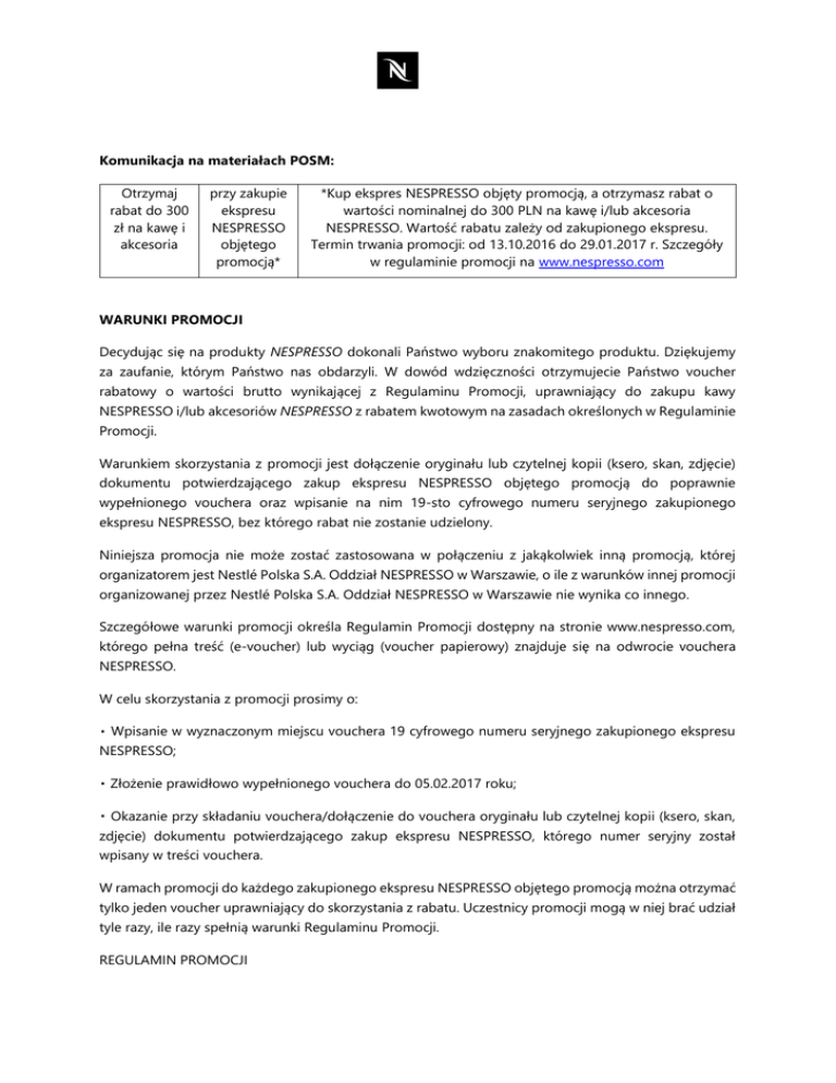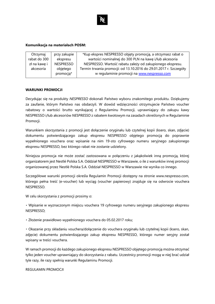 Komunikacja na materiałach POSM: Otrzymaj rabat do 300 zł na kawę i akcesoria przy zakupie ekspresu NESPRESSO objętego promocją* *Kup ekspres NESPRESSO objęty promocją, a otrzymasz rabat o wartości nominalnej do 300 PLN na kawę i/lub akcesoria NESPRESSO. Wartość rabatu zależy od zakupionego ekspresu. Termin trwania promocji: od 13.10.2016 do 29.01.2017 r. Szczegóły w regulaminie promocji na www.nespresso.com WARUNKI PROMOCJI Decydując się na produkty NESPRESSO dokonali Państwo wyboru znakomitego produktu. Dziękujemy za zaufanie, którym Państwo nas obdarzyli. W dowód wdzięczności otrzymujecie Państwo voucher rabatowy o wartości brutto wynikającej z Regulaminu Promocji, uprawniający do zakupu kawy NESPRESSO i/lub akcesoriów NESPRESSO z rabatem kwotowym na zasadach określonych w Regulaminie Promocji. Warunkiem skorzystania z promocji jest dołączenie oryginału lub czytelnej kopii (ksero, skan, zdjęcie) dokumentu potwierdzającego zakup ekspresu NESPRESSO objętego promocją do poprawnie wypełnionego vouchera oraz wpisanie na nim 19-sto cyfrowego numeru seryjnego zakupionego ekspresu NESPRESSO, bez którego rabat nie zostanie udzielony. Niniejsza promocja nie może zostać zastosowana w połączeniu z jakąkolwiek inną promocją, której organizatorem jest Nestlé Polska S.A. Oddział NESPRESSO w Warszawie, o ile z warunków innej promocji organizowanej przez Nestlé Polska S.A. Oddział NESPRESSO w Warszawie nie wynika co innego. Szczegółowe warunki promocji określa Regulamin Promocji dostępny na stronie www.nespresso.com, którego pełna treść (e-voucher) lub wyciąg (voucher papierowy) znajduje się na odwrocie vouchera NESPRESSO. W celu skorzystania z promocji prosimy o: Wpisanie w wyznaczonym miejscu vouchera 19 cyfrowego numeru seryjnego zakupionego ekspresu NESPRESSO; Złożenie prawidłowo wypełnionego vouchera do 05.02.2017 roku; Okazanie przy składaniu vouchera/dołączenie do vouchera oryginału lub czytelnej kopii (ksero, skan, zdjęcie) dokumentu potwierdzającego zakup ekspresu NESPRESSO, którego numer seryjny został wpisany w treści vouchera. W ramach promocji do każdego zakupionego ekspresu NESPRESSO objętego promocją można otrzymać tylko jeden voucher uprawniający do skorzystania z rabatu. Uczestnicy promocji mogą w niej brać udział tyle razy, ile razy spełnią warunki Regulaminu Promocji. REGULAMIN PROMOCJI 1. Organizatorem promocji jest Nestlé Polska S.A. z siedzibą w Warszawie, Oddział Nespresso w Warszawie, adres: 02-672 Warszawa, ul. Domaniewska 32, wpisana do rejestru przedsiębiorców prowadzonego przez Sąd Rejonowy dla m.st. Warszawy w Warszawie, XIII Wydział Gospodarczy Krajowego Rejestru Sądowego, numer KRS 0000025166, kapitał zakładowy 42.800.000 zł, w całości wpłacony, NIP 527-020-39-68 (dalej „Organizator”). 2. Promocja adresowana jest do klientów NESPRESSO, tj. takich konsumentów lub przedsiębiorców, którzy w jej okresie zakupią ekspres NESPRESSO objęty promocją od Organizatora lub innych podmiotów, które w ramach prowadzonej działalności gospodarczej zajmują się odsprzedażą ekspresów NESPRESSO (dalej „Uczestnicy”). Z promocji nie mogą korzystać pracownicy Organizatora ani członkowie ich najbliższej rodziny, jak również podmioty, które w ramach prowadzonej działalności gospodarczej zajmują się odsprzedażą ekspresów NESPRESSO i ich pracownicy. Lista Butików NESPRESSO w Polsce (dalej „Butiki NESPRESSO”) oraz przykładowa lista podmiotów, które w ramach prowadzonej działalności gospodarczej zajmują się odsprzedażą ekspresów NESPRESSO dostępna będzie na stronie internetowej www.nespresso.com. 3. Promocją objęte są wyłącznie następujące ekspresy NESPRESSO producentów Krups i DeLonghi typu IN-HOME: Essenza auto, Inissia, Inissia w zestawie ze spieniaczem Aeroccino3, Pixie, Pixie Clips, U, Umat, CitiZ, CitiZ&milk Umilk, Prodigio, Prodigio&Milk, Expert, Expert&milk, Lattissima+, Lattissima Touch, Lattissima Pro, Maestria i Gran Maestria. 4. Promocja rozpoczyna się 13 października 2016 i będzie trwać do 29 stycznia 2017 roku (pod uwagę brana będzie data zamówienia ekspresu NESPRESSO objętego promocją), przy czym, w przypadku zamówienia ekspresu NESPRESSO przez Internet, promocja obowiązuje: od 13 października 2016 do 29 stycznia 2017 roku, do godziny 23.59 - decyduje data i godzina wysłania zamówienia ekspresu NESPRESSO na serwer danego sklepu internetowego. 5. Promocja polega na możliwości otrzymania przez Uczestnika vouchera rabatowego o wartości nominalnej, która zależy od rodzaju zamówionego ekspresu NESPRESSO i który uprawnia Uczestnika do zakupu z rabatem kwotowym kawy NESPRESSO i/lub akcesoriów NESPRESSO dostępnych w aktualnej ofercie NESPRESSO w danym punkcie sprzedaży, z wyłączeniem zestawów promocyjnych (produkty wskazane w voucherze są przykładowe – pełna oferta w Butikach NESPRESSO oraz na www.nespresso.com/pl); w celu uzyskania informacji o pełnej ofercie można też kontaktować się z Klubem NESPRESSO pod numerem bezpłatnej infolinii 800 51 52 53), zgodnie z poniższymi zasadami oraz zasadami określonymi w punkcie 11: za zakup jednego ekspresu bez rozwiązania mlecznego, tj.: Essenza auto, Inissia, Pixie, Pixie Clips, U, Umat, Citiz, Prodigio, Uczestnik otrzymuje voucher rabatowy o wartości nominalnej 100 zł brutto, który uprawnia go do zakupu kawy NESPRESSO i/lub akcesoriów NESPRESSO z rabatem kwotowym 100 zł brutto; za zakup jednego ekspresu z rozwiązaniem mlecznym: Inissia w zestawie ze spieniaczem Aeroccino3, CitiZ&Milk, Umilk, Prodigio&Milk, Lattissima+, Lattissima Touch, Lattissima Pro, Maestria, lub Gran Maestria, Inissia w zestawie ze spieniaczem Aeroccino3, Uczestnik otrzymuje voucher rabatowy o wartości nominalnej 200 zł brutto, który uprawnia go do zakupu kawy NESPRESSO i/lub akcesoriów NESPRESSO z rabatem kwotowym 200 zł brutto. Za zakup jednego ekspresu Expert lub Exper