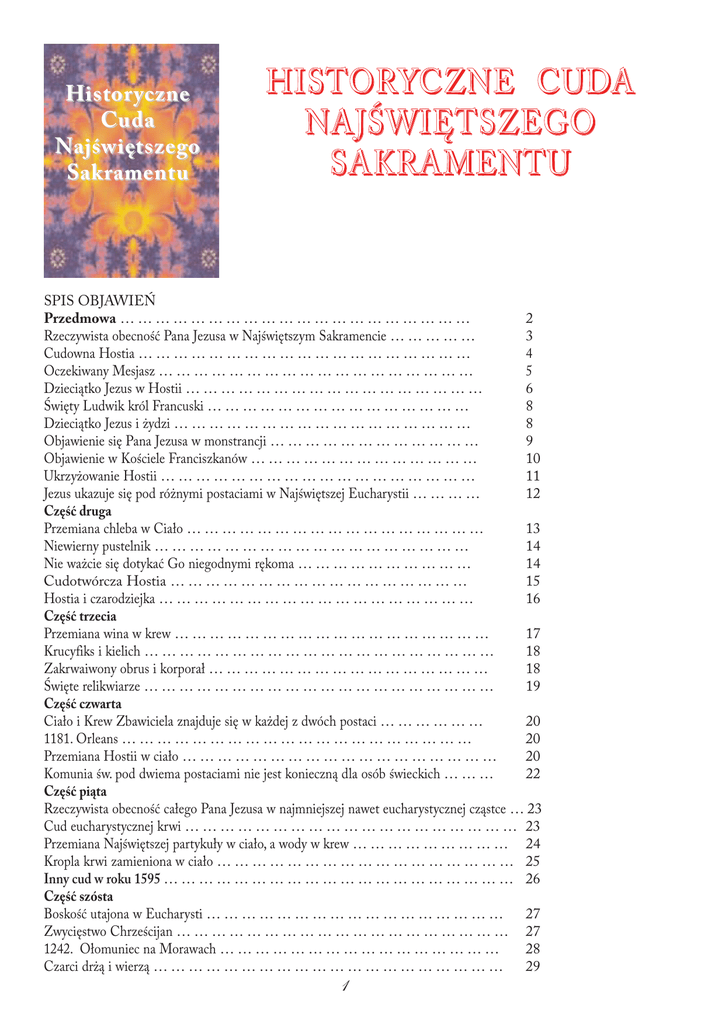 Historyczne Cuda Najświętszego Sakramentu H I S T O R Y C Z N E C U DA NA J Ś W I Ę T SZ E G O S A KR A M EN T U SPIS OBJAWIEŃ Przedmowa … … … … … … … … … … … … … … … … … … … … 2 Rzeczywista obecność Pana Jezusa w Najświętszym Sakramencie … … … … … 3 Cudowna Hostia … … … … … … … … … … … … … … … … … … … 4 5 Oczekiwany Mesjasz … … … … … … … … … … … … … … … … … … 6 Dzieciątko Jezus w Hostii … … … … … … … … … … … … … … … … … Święty Ludwik król Francuski … … … … … … … … … … … … … … … 8 Dzieciątko Jezus i żydzi … … … … … … … … … … … … … … … … … 8 Objawienie się Pana Jezusa w monstrancji … … … … … … … … … … … … 9 Objawienie w Kościele Franciszkanów … … … … … … … … … … … … … 10 Ukrzyżowanie Hostii … … … … … … … … … … … … … … … … … … 11 Jezus ukazuje się pod różnymi postaciami w Najświętszej Eucharystii … … … … 12 Część druga 13 Przemiana chleba w Ciało … … … … … … … … … … … … … … … … … Niewierny pustelnik … … … … … … … … … … … … … … … … … … 14 Nie ważcie się dotykać Go niegodnymi rękoma … … … … … … … … … … 14 Cudotwórcza Hostia … … … … … … … … … … … … … … … … … 15 Hostia i czarodziejka … … … … … … … … … … … … … … … … … … 16 Część trzecia Przemiana wina w krew … … … … … … … … … … … … … … … … … … 17 Krucyfiks i kielich … … … … … … … … … … … … … … … … … … … … 18 Zakrwaiwony obrus i korporał … … … … … … … … … … … … … … … … 18 Święte relikwiarze … … … … … … … … … … … … … … … … … … … … 19 Część czwarta 20 Ciało i Krew Zbawiciela znajduje się w każdej z dwóch postaci … … … … … … 1181. Orleans … … … … … … … … … … … … … … … … … … … … 20 Przemiana Hostii w ciało … … … … … … … … … … … … … … … … … … 20 Komunia św. pod dwiema postaciami nie jest konieczną dla osób świeckich … … … 22 Część piąta Rzeczywista obecność całego Pana Jezusa w najmniejszej nawet eucharystycznej cząstce … 23 Cud eucharystycznej krwi … … … … … … … … … … … … … … … … … … … 23 Przemiana Najświętszej partykuły w ciało, a wody w krew … … … … … … … … … 24 Kropla krwi zamieniona w ciało … … … … … … … … … … … … … … … … … 25 Inny cud w roku 1595 … … … … … … … … … … … … … … … … … … … … 26 Część szósta 27 Boskość utajona w Eucharysti … … … … … … … … … … … … … … … … … Zwycięstwo Chrześcijan … … … … … … … … … … … … … … … … … … … 27 1242. Ołomuniec na Morawach … … … … … … … … … … … … … … … … 28 Czarci drżą i wierzą … … … … … … … … … … … … … … … … … … … … 29 1 Św. Piotr z Werony … … … … … … … … … … … … … … … … … … Ukaranie świętokradzców … … … … … … … … … … … … … … … … 1790. Viuzla Chiesaz … … … … … … … … … … … … … … … … … 1793. Wioska we Włoszech … … … … … … … … … … … … … … … 1834. Charlestown w Ameryce … … … … … … … … … … … … … … Najświętsza Hostia w gorejącym krzaku … … … … … … … … … … … Ocalenie Hostii z płomieni … … … … … … … … … … … … … … Umiejscowienie pożaru … … … … … … … … … … … … … … … Przyjdź Dziecię Jezus! … … … … … … … … … … … … … … … 30 31 31 31 32 32 33 35 36 Przedmowa Boska Eucharystia sama w sobie jest największym cudem, mówi doktor anielski św. Tomasz, a według wyrażenia Gerków, jest ona cudem nad cudami, albowiem Przenajświętszy Sakrament, sam w sobie rozważany, każe dopuszczać cały szereg cudów, mianowicie: przemiany jednej istoty w drugą (substancja) – bytowanie zewnętrznych postaci bez ich właściwej osnowy, przy zachowaniu mimo to prawdziwej istoty rzeczy – Obecność Pana Jezusa w wielu miejscach na raz, w niebie, na ziemi, na wszystkich punktach kuli ziemskiej oraz we wszystkich cząstkach sakramentalnych postaci. Nauka katolickiej wiary, czyli teologia zagłębia i naukowo uzasadnia oddzielnie, wszystkie te cuda zawarte w eucharystycznym przeistoczeniu, czyniącym rzeczywiście z każdej poświęconej Hostii uwielbione miejsce, gdzie Bóg dokonuje cudów swej wszechpotęgi „officina miraculirium” jak się pięknie wyraża św. Jan Domasceński. Lecz w chwili konsekracji, czyli poświęcenia Hostii na ołtarzu wszystko dokonuje się w największej ciszy i tajemnicy; jedna wiara objawia i powiada nam o tych cudownych sprawach, przechodzącą rozum i wszelką moc materialną stworzoną. Podobało się jednak Bogu w nieograniczonej miłości innymi cudownymi znakami jawnie i zewnętrznie stwierdzić to, co się dzieje na ołtarzu zgodnie z tym jak głosi wiara. Dzieje Kościoła pełne są tych cudownych znaków, z natury rzeczy przeznaczonych albo na obudzenie wiary wiernego ludu, zawstydzenie bezbożności i karę hardej świętokradzkiej ręki, lub też na wynagrodzenie ufności i gorącości ducha wiernych. Tymi zewnętrznymi znakami są cuda Najświętszego Sakramentu. Nimi też pragniemy zająć uwagę czytelnika w niniejszej pracy, wyłanczając naturalnie te, które maj