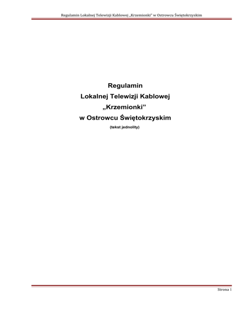 Regulamin Lokalnej Telewizji Kablowej „Krzemionki” w Ostrowcu Świętokrzyskim Regulamin Lokalnej Telewizji Kablowej „Krzemionki” w Ostrowcu Świętokrzyskim (tekst jednolity) Strona 1 Regulamin Lokalnej Telewizji Kablowej „Krzemionki” w Ostrowcu Świętokrzyskim 1. Postanowienia ogólne 1.1. Podstawa prawna Lokalna Telewizja Kablowa „Krzemionki” w Ostrowcu Św. funkcjonuje w oparciu o przepisy prawa: • Ustawa z dnia 15 grudnia 2000 r. o spółdzielniach mieszkaniowych /t.j. (Dz.U. z 2003 r. Nr 119 poz. 1116 z późn. zm.) /usm/ • Ustawa z dnia 16 lipca 2004 r. Prawo telekomunikacyjne (Dz.U. Nr 171 poz. 1800 z późn. zm.) /upt/ • Ustawa z dnia 29 grudnia 1992 r. o radiofonii i telewizji (Dz.U. z 2004 r. Nr 253 poz. 2531 z późn. zm.) /urt/ oraz: • Statut Spółdzielni • Wpis do rejestru przedsiębiorców telekomunikacyjnych pod numerem 1306. • Koncesję KRRiTv 1.2. Zasady prowadzenia Lokalnej Telewizji Kablowej (LTVK) 1. Operatorem Lokalnej Telewizji Kablowej „Krzemionki” jest Spółdzielnia Mieszkaniowa „Krzemionki” z siedzibą w Ostrowcu Św. Osiedle Stawki 47. 2. Spółdzielnia prowadzi LTVK dla zaspokojenia potrzeb swoich członków i ich rodzin oraz osób niebędących jej członkami zamieszkałych w zasobach przez nią zarządzanych, z zastrzeżeniem pkt 6 ust 1.” 3. Podłączenie sygnału następuje na pisemny wniosek członka Spółdzielni lub innej osoby, której przysługuje tytuł prawny do lokalu. W przypadku posiadania przez wnioskodawcę tytułu prawnego innego niż prawo własności lub spółdzielcze prawo do lokalu wymagane jest przedstawienie zgody odpowiednio właściciela, posiadacza prawa spółdzielczego lub członka Spółdzielni. 4. LTVK dostarcza sygnał w zasięgu swojej sieci i w zakresie istniejących możliwości techniczno-ekonomicznych. Zasięgiem obejmuje zasoby zarządzane przez Operatora, a w szczególności osiedla mieszkaniowe: Stawki, Rosochy oraz Patronackie, położone w Gminie Ostrowiec. 5. LTVK produkuje i emituje własny program lokalny oraz reemituje programy innych nadawców zgodnie z obowiązującymi przepisami oraz zawartymi umowami i porozumieniami. 6. Zasady dostarczania sygnału Lokalnej Telewizji Kablowej dla odbiorców spoza Spółdzielni uregulowane są w pkt. 6 Regulaminu. 2. Sieć i instalacja 1. Podłączenie sygnału LTVK w budynkach z czynnymi instalacjami przyłączonymi do sieci LTVK „Krzemionki”, następuje w ciągu 5 dni roboczych, po złożeniu pisemnego wniosku przez osobę zainteresowaną i uiszczeniu aktualnego kosztu podłączenia do sieci, z zastrzeżeniem pkt. 1.2. ust. 4 oraz z zastrzeżeniem pkt 2. ust. 1¹. Strona 2 Regulamin Lokalnej Telewizji Kablowej „Krzemionki” w Ostrowcu Świętokrzyskim 1¹. Użytkownik jest zwolniony z wnoszenia opłaty za przyłączenie do sieci, o której mowa w pkt. II.1. Cennika stanowiącego załącznik do Regulaminu, jeżeli podpisze z Operatorem umowę na okres minimum 2 lat. 1². W razie rozwiązania umowy przed upływem okresu, o którym mowa w ust. 1¹ Użytkownik zobowiązany jest do uiszczenia opłaty za przyłączenie w terminie wskazanym przez Operatora. 2. Operator gwarantuje prawidłową, zgodną z Polską Normą i wymaganiami technicznymi, jakość sygnału dostarczanego do lokalu odbiorcy, pod warunkiem zastosowania przez użytkownika do odbioru sygnału właściwie dostrojonego odbiornika TV, odbierającego odpowiednie pasma częstotliwości. 3. Operator ma prawo i obowiązek konserwacji oraz remontu sieci, co może spowodować przerwy w dostawie sygnału, jednak nie dłużej niż jednorazowo 10 godzin lub łącznie nie dłużej niż 30 godzin miesięcznie. Za czas trwania przerwy przysługuje użytkownikom obniżenie opłaty o 1/60 za każdy dzień pozbawienia sygnału. Obniżka zostanie dokonana przez uznanie salda użytkownika. Użytkownik ma prawo dokonać wpłaty niższej o kwotę obniżenia opłaty w okresie płatności następującym po okresie, w którym nastąpiły ww. zdarzenia. 4. O zamiarze przeprowadzenia prac o których mowa w punkcie 3, Operator powiadomi w programie lokalnym LTVK, telegazecie oraz dodatkowo przez wywieszenie informacji na tablicach ogłoszeń w budynkach znajdujących się na obszarze, na którym dokonywane są prace. 5. Jeżeli przerwy w dostawie sygnału lub pogorszenie jego jakości są spowodowane awarią w sieci lub stacji czołowej, opłata zostanie obniżona o 1/30 za każdy dzień pozbawienia sygnału lub o 1/60 za każdy dzień pogorszenia jego jakości. Obniżka zostanie dokonana przez uznanie salda użytkownika. Użytkownik ma prawo dokonać wpłaty niższej o kwotę obniżenia opłaty w okresie płatności następującym po okresie, w którym nastąpiły ww. zdarzenia, potwierdzone przez Operatora. 6. Wszelkiego rodzaju usterki w funkcjonowaniu LTVK należy zgłaszać w administracji danego osiedla lub bezpośrednio w siedzibie LTVK. 7. Operator zobowiązany jest do usunięcia usterek w pracy stacji czołowej i sieci magistralnej najpóźniej w dniu następnym po zgłoszeniu, natomiast w instalacjach domowych w ciągu dwóch dni. Terminy te nie są wiążące w przypadku konieczności naprawienia lub wymiany zdewastowanych elementów sieci. 8. Operator prowadzi konserwację stacji czołowej, sieci i instalacji budynkowych, a w tym gniazd telewizji kablowej wraz ze sznurem przyłączeniowym. 9. W przypadku uszkodzenia mechanicznego gniazd i instalacji wewnętrznej w lokalu oraz wymiany lub uszkodzenia sznura przyłączeniowego, koszty usunięcia uszkodzeń ponosi użytkownik. 10. Zabrania się samowolnego dokonywania przeróbek w instalacji telewizji kablowej, oraz udostępniania sygnału osobom trzecim. 11. Dokonywanie wszelkiego rodzaju przeróbek jest dopuszczalne pod warunkiem uzyskania wcześniejszej zgody Operatora i wykonania prac przez upoważnionego pracownika. Koszty przeróbki pokrywa użytkownik. 12. W przypadku stwierdzenia nielegalnego podłączenia do instalacji telewiz