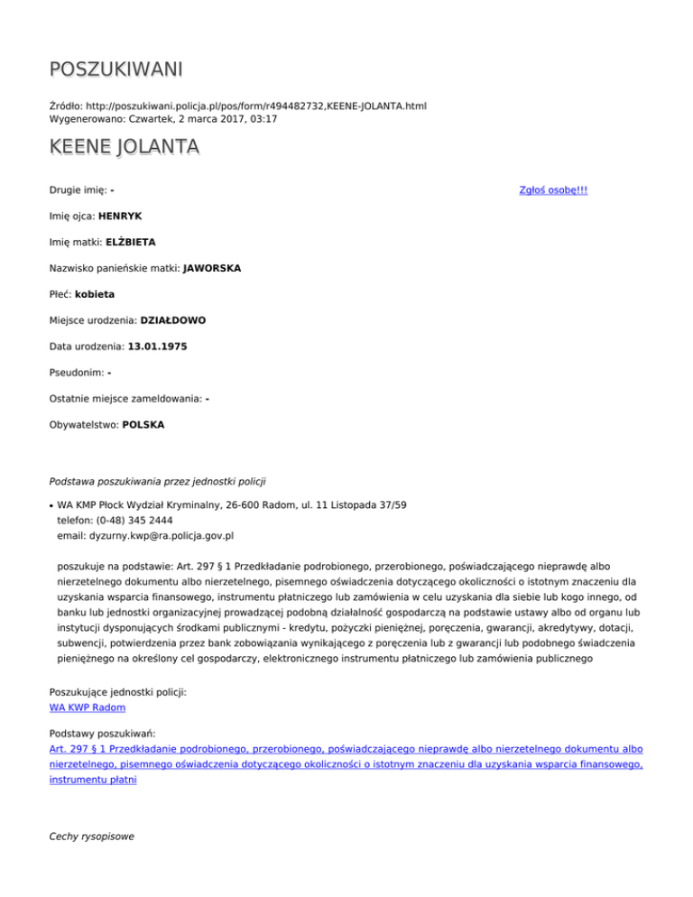 POSZUKIWANI Źródło: http://poszukiwani.policja.pl/pos/form/r494482732,KEENE-JOLANTA.html Wygenerowano: Czwartek, 2 marca 2017, 03:17 KEENE JOLANTA Drugie imię: - Zgłoś osobę!!! Imię ojca: HENRYK Imię matki: ELŻBIETA Nazwisko panieńskie matki: JAWORSKA Płeć: kobieta Miejsce urodzenia: DZIAŁDOWO Data urodzenia: 13.01.1975 Pseudonim: Ostatnie miejsce zameldowania: Obywatelstwo: POLSKA Podstawa poszukiwania przez jednostki policji ● WA KMP Płock Wydział Kryminalny, 26-600 Radom, ul. 11 Listopada 37/59 telefon: (0-48) 345 2444 email: [email protected] poszukuje na podstawie: Art. 297 § 1 Przedkładanie podrobionego, przerobionego, poświadczającego nieprawdę albo nierzetelnego dokumentu albo nierzetelnego, pisemnego oświadczenia dotyczącego okoliczności o istotnym znaczeniu dla uzyskania wsparcia finansowego, instrumentu płatniczego lub zamówienia w celu uzyskania dla siebie lub kogo innego, od banku lub jednostki organizacyjnej prowadzącej podobną działalność gospodarczą na podstawie ustawy albo od organu lub instytucji dysponujących środkami publicznymi - kredytu, pożyczki pieniężnej, poręczenia, gwarancji, akredytywy, dotacji, subwencji, potwierdzenia przez bank zobowiązania wynikającego z poręczenia lub z gwarancji lub podobnego świadczenia pieniężnego na określony cel gospodarczy, elektronicznego instrumentu płatniczego lub zamówienia publicznego Poszukujące jednostki policji: WA KWP Radom Podstawy poszukiwań: Art. 297 § 1 Przedkładanie podrobionego, przerobionego, poświadczającego nieprawdę albo nierzetelnego dokumentu albo nierzetelnego, pisemnego oświadczenia dotyczącego okoliczności o istotnym znaczeniu dla uzyskania wsparcia finansowego, instrumentu płatni Cechy rysopisowe Wzrost: Kolor oczu: - Tweetnij