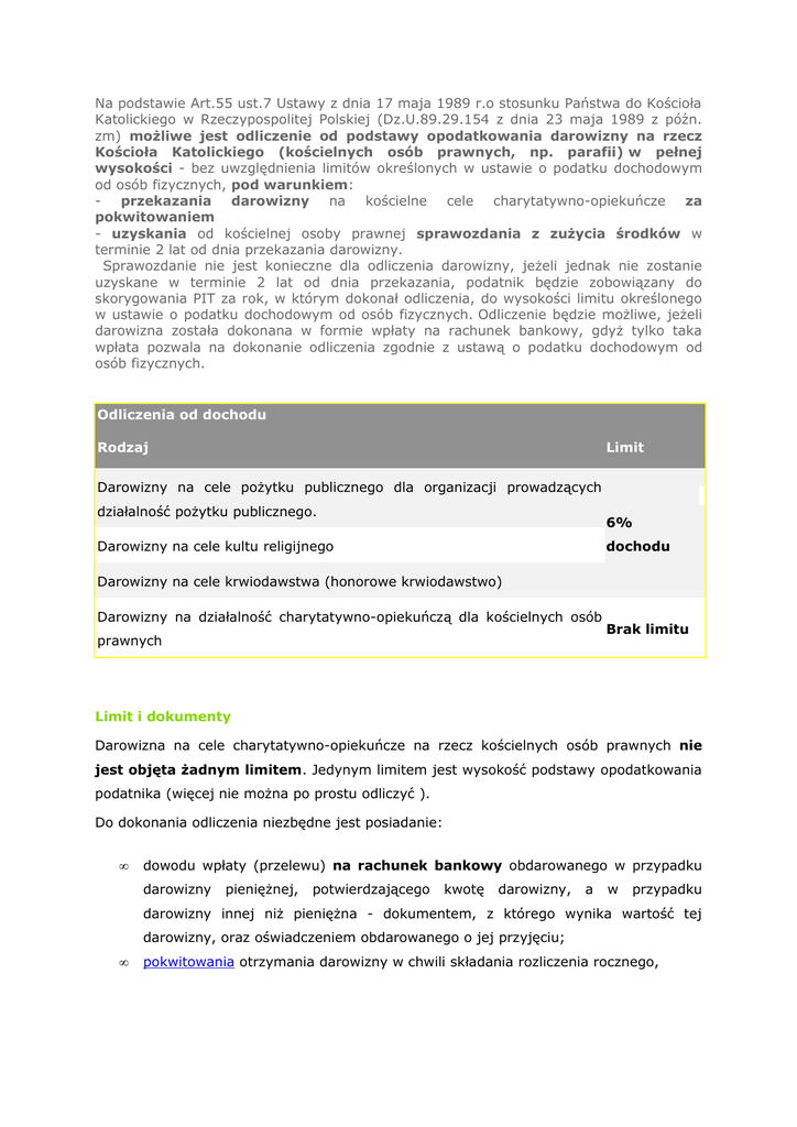 Na podstawie Art.55 ust.7 Ustawy z dnia 17 maja 1989 r.o stosunku Państwa do Kościoła Katolickiego w Rzeczypospolitej Polskiej (Dz.U.89.29.154 z dnia 23 maja 1989 z późn. zm) możliwe jest odliczenie od podstawy opodatkowania darowizny na rzecz Kościoła Katolickiego (kościelnych osób prawnych, np. parafii) w pełnej wysokości - bez uwzględnienia limitów określonych w ustawie o podatku dochodowym od osób fizycznych, pod warunkiem: - przekazania darowizny na kościelne cele charytatywno-opiekuńcze za pokwitowaniem - uzyskania od kościelnej osoby prawnej sprawozdania z zużycia środków w terminie 2 lat od dnia przekazania darowizny. Sprawozdanie nie jest konieczne dla odliczenia darowizny, jeżeli jednak nie zostanie uzyskane w terminie 2 lat od dnia przekazania, podatnik będzie zobowiązany do skorygowania PIT za rok, w którym dokonał odliczenia, do wysokości limitu określonego w ustawie o podatku dochodowym od osób fizycznych. Odliczenie będzie możliwe, jeżeli darowizna została dokonana w formie wpłaty na rachunek bankowy, gdyż tylko taka wpłata pozwala na dokonanie odliczenia zgodnie z ustawą o podatku dochodowym od osób fizycznych. Odliczenia od dochodu Rodzaj Limit Darowizny na cele pożytku publicznego dla organizacji prowadzących działalność pożytku publicznego. 6% Darowizny na cele kultu religijnego dochodu Darowizny na cele krwiodawstwa (honorowe krwiodawstwo) Darowizny na działalność charytatywno-opiekuńczą dla kościelnych osób prawnych Brak limitu Limit i dokumenty Darowizna na cele charytatywno-opiekuńcze na rzecz kościelnych osób prawnych nie jest objęta żadnym limitem. Jedynym limitem jest wysokość podstawy opodatkowania podatnika (więcej nie można po prostu odliczyć ). Do dokonania odliczenia niezbędne jest posiadanie: • dowodu wpłaty (przelewu) na rachunek bankowy obdarowanego w przypadku darowizny pieniężnej, potwierdzającego kwotę darowizny, a w przypadku darowizny innej niż pieniężna - dokumentem, z którego wynika wartość tej darowizny, oraz oświadczeniem obdarowanego o jej przyjęciu; • pokwitowania otrzymania darowizny w chwili składania rozliczenia rocznego, • sprawozdania z wykonania darowizny, tzn. z przekazania kwoty darowizny na cele charytatywno-opiekuńcze - w terminie do 2 lat od dnia spełnienia darowizny (dokonania przelewu, wpłaty). W zeznaniu wykazujemy komu i ile przekazaliśmy tytułem darowizny. Uwaga: Osoby pobierające emeryturę lub rentę mogą również dokonać wpłaty 1%, ale muszą rozliczać się same - nie przez ZUS. Powinni złożyć PIT-37, wypełnić go w szczególności w rubrykach 124-126 i oczywiście złożyć nie później niż do 30 kwietnia 2008 r. Wniosek o przekazanie 1% podatku znajduje się na końcu każdego zeznania rocznego PIT-28, PIT-36, PIT-36L, PIT-37 czy PIT-38. 1% przekazują więc w tym roku również podatnicy podatku liniowego, ryczałtowcy oraz podatnicy grający na giełdzie. Nie można przekazać 1% karty podatkowej. Wniosek taki można również złożyć na piśmie, w postaci odrębnego podania, wystarczy jednak - i jest to o wiele prostsze - w zeznaniu rocznym wskazać nazwę i numer wpisu do KRS (Krajowego Rejestru Sądowego). Nie można pomylić się w nazwie czy numerze KRS. Pomyłka w numerze KRS może prowadzić do wskazania zupełnie innej organizacji. Warunkiem skutecznego skorzystania z ulgi jest złożenie zeznania w terminie. Zeznania złożone po terminie nie dają prawa przekazania 1%, nawet jeżeli wniosek został odrębnie złożony wcześniej.