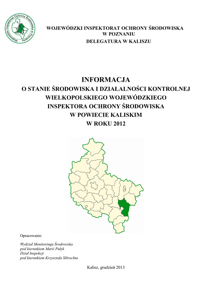 WOJEWÓDZKI INSPEKTORAT OCHRONY ŚRODOWISKA W POZNANIU DELEGATURA W KALISZU INFORMACJA O STANIE ŚRODOWISKA I DZIAŁALNOŚCI KONTROLNEJ WIELKOPOLSKIEGO WOJEWÓDZKIEGO INSPEKTORA OCHRONY ŚRODOWISKA W POWIECIE KALISKIM W ROKU 2012 Opracowanie: Wydział Monitoringu Środowiska pod kierunkiem Marii Pułyk Dział Inspekcji pod kierunkiem Krzysztofa Sibrechta Kalisz, grudzień 2013 2 SPIS TREŚCI 1. 2. 3. WPROWADZENIE ..................................................................................................................... 4 WYBRANE CECHY POWIATU ............................................................................................... 5 STAN ŚRODOWISKA................................................................................................................ 7 3.1. Monitoring jakości powietrza ................................................................................................ 7 3.2. Monitoring jakości wód......................................................................................................... 8 3.2.1. Monitoring jakości wód powierzchniowych .................................................................. 8 3.2.2. Monitoring jakości wód podziemnych ......................................................................... 11 3.3. Monitoring jakości gleby i ziemi......................................................................................... 11 3.4. Monitoring hałasu................................................................................................................ 12 3.5. Monitoring pól elektromagnetycznych ............................................................................... 14 3.6. Monitoring gospodarki odpadami ....................................................................................... 15 3.7. Podsumowanie i wnioski ..................................................................................................... 19 4. DZIAŁALNOŚĆ KONTROLNA .............................................................................................. 21 5. POWAŻNE AWARIE ............................................................................................................... 21 3 1. WPROWADZENIE Opracowanie ma na celu przedstawienie stanu środowiska oraz wyników działalności kontrolnej Wielkopolskiego Wojewódzkiego Inspektora Ochrony Środowiska na terenie powiatu kaliskiego w roku 2012. Do jego przygotowania wykorzystano badania własne WIOŚ w Poznaniu, wyniki badań będące w posiadaniu WIOŚ oraz ustalenia z kontroli użytkowników środowiska, prowadzonych przez inspektorów WIOŚ. Ocena stanu środowiska w 2012 roku po weryfikacji przez GIOŚ została opublikowana w formie „Raportu o stanie środowiska w Wielkopolsce w roku 2012”. Bieżące informacje dotyczące stanu środowiska na terenie całego wielkopolskiego znaleźć można na stronie internetowej www.poznan.wios.gov.pl. województwa Zadania w zakresie ochrony przyrody, w tym ustanawianie form ochrony przyrody oraz sprawowanie nadzoru nad przestrzeganiem określonych ustawą zakazów w stosunku do tych form, realizuje Regionalny Konserwator Przyrody. 4 2. WYBRANE CECHY POWIATU Powiat kaliski położony jest w południowo-wschodniej części województwa wielkopolskiego, obejmuje obszar o powierzchni 1160 km2, a zamieszkuje go 82440 osób (stan na dzień 31 grudnia 2012 r., dane wg GUS). Według podziału fizyczno-geograficznego J. Kondrackiego powiat ten położony jest w makroregionie Nizina Południowowielkopolska, w mezoregionach Wysoczyzna Kaliska, Równina Rychwalska, Wysoczyzna Turecka, Kotlina Grabowska. Gospodarka powiatu ma charakter rolniczo-przemysłowy, użytki rolne zajmują około 71% jego powierzchni. Administracyjnie powiat podzielony jest na: ▪ jedną gminę miejsko-wiejską: Stawiszyn, ▪ dziesięć gmin wiejskich: Blizanów, Brzeziny, Ceków Kolonia, Godziesze Wielkie, Koźminek, Lisków, Mycielin, Opatówek, Szczytniki, Żelazków. Powiat jest zwodociągowany w 83,2 %, a skanalizowany w 27,4 % (stan na dzień 31 grudnia 2012 r., dane wg GUS) W ewidencji WIOŚ w Poznaniu znajduje się 16 mechaniczno-biologicznych oczyszczalni ścieków eksploatowanych na terenie powiatu kaliskiego. Dane o ilości ścieków pochodzą z Wykazów zawierających zbiorcze zestawienia informacji o zakresie korzystania ze środowiska oraz o wysokości należnych opłat. Lp. 1 Gmina Blizanów Miejscowość/Eksploatujący Janków Przedsiębiorstwo Usług Komunalnych w Blizanowie 2 Blizanów 3 Brzeziny 4 Ceków Kolonia 5 Ceków Kolonia Zagorzyn Przedsiębiorstwo Usług Komunalnych w Blizanowie Brzeziny Zakład Obsługi Komunalnej w Brzezinach Ceków Kolonia Urząd Gminy Ceków Kolonia Kamień Urząd Gminy Ceków Kolonia 6 Godziesze Wielkie Saczyn Urząd Gminy Godziesze Wielkie 7 Koźminek 8 Lisków 9 Mycielin 10 Opatówek 11 Stawiszyn 12 Stawiszyn Koźminek Zakład Gospodarki Komunalnej i Mieszkaniowej w Koźminku Lisków Urząd Gminy Lisków Mycielin Gmina Mycielin Opatówek Urząd Gminy Opatówek Długa Wieś Druga Samorządowy Zakład Gospodarki Komunalnej i Mieszkaniowej Stawiszyn Zbiersk PHP Wawrzyniak Obszar obsługiwany Blizanów, Blizanów Drugi, Janków Pierwszy i Blizanówek oraz ścieki dowożone z terenu całej gminy Zagorzyn, Piotrów, Dębniałki Kaliskie oraz ścieki dowożone z terenu całej gminy Ilość ścieków w 2012 r. /m3/ 58630 105203,90 Brzeziny, Jagodziniec, Aleksandria 72765 Cała gmina 31034 Cała gmina 56393 Godziesze Wielkie, Godziesze Małe, Skrzatki oraz ścieki dowożone z terenu całej gminy Koźminek, Dębsko, Tymianek, Słowik oraz ścieki dowożone z terenu całej gminy 46072 78164 Cała gmina 138650 Cała gmina 14269,9 Cała gmina 99303,8 Zbiersk, Zbiersk Cukrownia, Kiączyn Nowy, Stawiszyn, Długa Wieś Druga 77550 Zakład 28100 5 Lp. Gmina 13 Szczytniki 14 Żelazków 15 Żelazków 16 Żelazków Miejscowość/Eksploatujący Popów Urząd Gminy Szczytniki Skarszew Zakład Komunalny Gmin