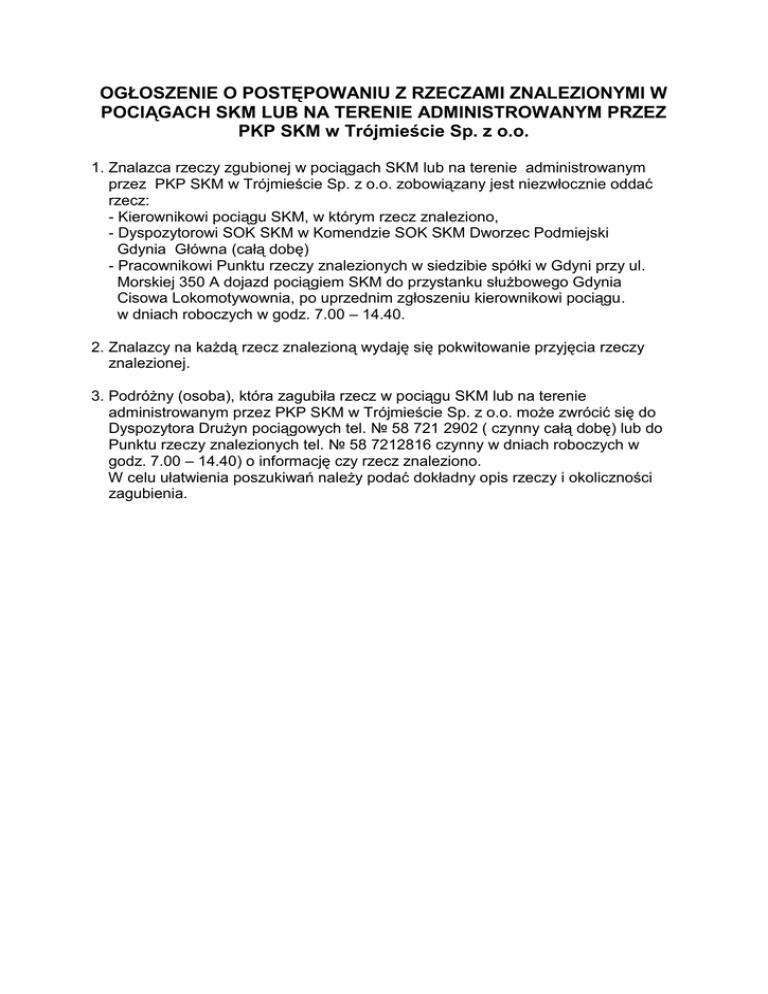 OGŁOSZENIE O POSTĘPOWANIU Z RZECZAMI ZNALEZIONYMI W POCIĄGACH SKM LUB NA TERENIE ADMINISTROWANYM PRZEZ PKP SKM w Trójmieście Sp. z o.o. 1. Znalazca rzeczy zgubionej w pociągach SKM lub na terenie administrowanym przez PKP SKM w Trójmieście Sp. z o.o. zobowiązany jest niezwłocznie oddać rzecz: - Kierownikowi pociągu SKM, w którym rzecz znaleziono, - Dyspozytorowi SOK SKM w Komendzie SOK SKM Dworzec Podmiejski Gdynia Główna (całą dobę) - Pracownikowi Punktu rzeczy znalezionych w siedzibie spółki w Gdyni przy ul. Morskiej 350 A dojazd pociągiem SKM do przystanku służbowego Gdynia Cisowa Lokomotywownia, po uprzednim zgłoszeniu kierownikowi pociągu. w dniach roboczych w godz. 7.00 – 14.40. 2. Znalazcy na każdą rzecz znalezioną wydaję się pokwitowanie przyjęcia rzeczy znalezionej. 3. Podróżny (osoba), która zagubiła rzecz w pociągu SKM lub na terenie administrowanym przez PKP SKM w Trójmieście Sp. z o.o. może zwrócić się do Dyspozytora Drużyn pociągowych tel. № 58 721 2902 ( czynny całą dobę) lub do Punktu rzeczy znalezionych tel. № 58 7212816 czynny w dniach roboczych w godz. 7.00 – 14.40) o informację czy rzecz znaleziono. W celu ułatwienia poszukiwań należy podać dokładny opis rzeczy i okoliczności zagubienia.