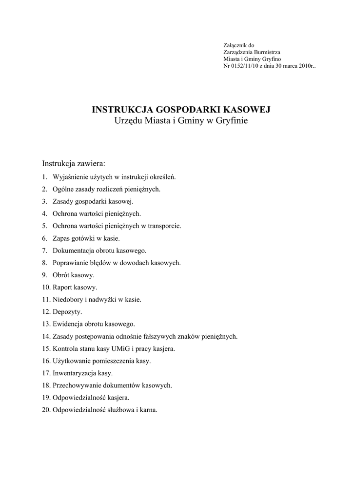 Załącznik do Zarządzenia Burmistrza Miasta i Gminy Gryfino Nr 0152/11/10 z dnia 30 marca 2010r.. INSTRUKCJA GOSPODARKI KASOWEJ Urzędu Miasta i Gminy w Gryfinie Instrukcja zawiera: 1. Wyjaśnienie użytych w instrukcji określeń. 2. Ogólne zasady rozliczeń pieniężnych. 3. Zasady gospodarki kasowej. 4. Ochrona wartości pieniężnych. 5. Ochrona wartości pieniężnych w transporcie. 6. Zapas gotówki w kasie. 7. Dokumentacja obrotu kasowego. 8. Poprawianie błędów w dowodach kasowych. 9. Obrót kasowy. 10. Raport kasowy. 11. Niedobory i nadwyżki w kasie. 12. Depozyty. 13. Ewidencja obrotu kasowego. 14. Zasady postępowania odnośnie fałszywych znaków pieniężnych. 15. Kontrola stanu kasy UMiG i pracy kasjera. 16. Użytkowanie pomieszczenia kasy. 17. Inwentaryzacja kasy. 18. Przechowywanie dokumentów kasowych. 19. Odpowiedzialność kasjera. 20. Odpowiedzialność służbowa i karna. 1. Wyjaśnienie użytych w instrukcji określeń. Ilekroć w instrukcji mowa o: 1) środkach pieniężnych rozumie się przez to środki pieniężne i inne aktywa pieniężne zaliczane do inwestycji krótkoterminowych w bilansie. Zalicza się tu krajowe środki płatnicze, waluty obce i dewizy: a) krajowe środki płatnicze są to pieniądze będące w kraju prawnym środkiem (waluta polska), a także pełniące funkcję środka płatniczego: weksle, czeki, czeki podróżne, akredytywy, polecenia wypłat, przekazy i inne dokumenty bankowe i finansowe płatne w walucie polskiej, b) waluty obce są to pieniądze (banknoty i monety) będące poza krajem prawnym środkiem płatniczym oraz międzynarodowe jednostki rozrachunkowe, c) dewizami są pełniące funkcję środka płatniczego weksle, czeki, czeki podróżne, akredytywy, polecenia wypłat, przekazy i inne dokumenty bankowe i finansowe płatne w walutach obcych. Aktywa pieniężne składają się ze: a) środków pieniężnych w kasie, banku i środków pieniężnych w drodze, b) innych aktywów pieniężnych, gdzie zalicza się odsetki od lokat, odsetki od dłużnych papierów wartościowych, c) innych środków pieniężnych, przez które rozumie się czeki obce, weksle obce, czeki podróżne, o ile są płatne lub wymagalne w ciągu 3 miesięcy od daty ich wystawienia, nabycia, założenia, d) innych krótkoterminowych aktywów finansowych, przez które rozumie się czeki obce, weksle obce, czeki podróżne, o ile są płatne w terminie powyżej 3 miesięcy do roku od daty ich wystawienia, nabycia, założenia lub od dnia bilansowego. 2) czeku gotówkowym – rozumie się przez to dyspozycję wystawcy czeku (dłużnika) udzieloną trasatowi do obciążenia jego rachunku kwotą, na którą czek został wystawiony, oraz wypłaty tej kwoty okazicielowi czeku (czek na okaziciela) lub osobie wskazanej na czeku (czek imienny), 3) poleceniu przelewu – rozumie się przez to udzieloną bankowi dyspozycję dłużnika obciążenia jego rachunku określoną kwotą i uznania tą kwotą rachunku wierzyciela, 4) poleceniu zapłaty – rozumie się przez to udzieloną bankowi dyspozycję wierzyciela obciążenia określoną kwotą rachunku bankowego dłużnika i uznania tą kwotą rachunku wierzyciela, 5) rozliczeniach gotówkowych – rozumie się przez to rozliczenia przeprowadzone czekiem gotówkowym lub przez wpłatę gotówki na rachunek wierzyciela, 6) rozliczeniach bezgotówkowych – rozumie się przez to regulowanie zobowiązań między podmiotami gospodarczymi za pośrednictwem i pod kontrolą banku w postaci zapisów na kontach bankowych rozliczających się podmiotów, 7) wartościach pieniężnych – rozumie się przez to: a) krajowe i zagraniczne znaki pieniężne, b) czeki, z wyjątkiem czeków zakreślonych, skasowanych lub opatrzonych indosem pełnomocniczym, zawierającym wzmiankę „wartość do inkasa”, „należność do inkasa” lub inną o podobnym charakterze, c) weksle, z wyjątkiem weksli opatrzonych indosem pełnomocniczym, zawierającym wzmiankę „wartość do inkasa” lub inną o podobnym charakterze, d) inne dokumenty zastępujące w obrocie gotówką, e) złoto, srebro i wyroby z tych metali, kamienie szlachetne i perły, a także platynę i inne metale z grupy platynowców, 8) przechowywania wartości pieniężnych – rozumie się przez to magazynowanie wartości pieniężnych w pomieszczeniach służących do przechowywania wartości pieniężnych, wyposażonych w odpowiednie urządzenia techniczne, zwanych dalej „pomieszczeniami”, lub w urządzeniach służących do przechowywania wartości pieniężnych, zwanych dalej „urządzeniami”, 9) transporcie wartości pieniężnych – rozumie się przez to przewożenie lub przenoszenie wartości pieniężnych poza obrębem jednostki organizacyjnej, 10) kierowniku jednostki – rozumie się przez to burmistrza Miasta i gminy Gryfino, który – zgodnie z obowiązującymi jednostkę przepisami prawa, statutem, umową lub na mocy prawa własności – 2 uprawniony jest do zarządzania jednostką, z wyłączeniem pełnomocników ustanowionych przez jednostkę, 11) jednostka obliczeniowa (JO) równoważna 120-krotności przeciętnego wynagrodzenia miesięcznego w gospodarce uspołecznionej za poprzedni kwartał, określanego w obwieszczeniach Prezesa Głównego Urzędu Statystycznego, 12) UMiG – Urząd Miasta i Gminy w Gryfinie. 2. Ogólne zasady rozliczeń pieniężnych 1) Przedsiębiorcy dokonują rozliczeń pieniężnych, które przeprowadza się w formie gotówkowej lub bezgotówkowej. 2) Rozliczenia gotówkowe dokonywane są: a) za pośrednictwem kasy, b) za pośrednictwem banku – czekiem gotówkowym lub przez wpłatę gotówki na rachunek wierzyciela. 3) Formę rozliczeń gotówkowych należy stosować w tych przypadkach, gdy nie jest możliwe stosowanie rozliczeń w formie bezgotówkowej. 4) Rozliczenia bezgotówkowe przeprowadza się w jednej z następujących form: a) polecenia przelewu, b) polecenia zapłaty. 3. Zasady gospodarki kasowej 1) W obrocie