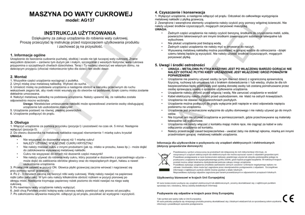 MASZYNA DO WATY CUKROWEJ model: AG137 INSTRUKCJA UŻYTKOWANIA Dziękujemy za zakup urządzenia do robienia waty cukrowej. Proszę przeczytać tę instrukcję przed rozpoczęciem użytkowania produktu i zachować ją na przyszłość. 1. Informacje ogólne Urządzenie do tworzenia cudownie puchatej, słodkiej i wcale nie tak tuczącej waty cukrowej. Znane wszystkim dzieciom – zarówno tym dużym jak i małym, szczególnie z wesołych festynów, wata cukrowa przypomina o szczęśliwych chwilach dzieciństwa. Teraz i Ty możesz stworzyć we własnym domu, na dziecięcym przyjęciu (chociaż niekoniecznie tylko dla dzieci) ten słodki deser. 2. Montaż 1. Wszystkie części urządzenia wyciągnąć z pudełka. 2. Umyć miskę oraz metalową nakładkę. Wytrzeć do sucha. 3. Umieścić miskę na podstawie urządzenia a następnie obrócić w kierunku przeciwnym do ruchu wskazówek zegara tak, aby rowki miski wsunęły się do otworów na podstawie, dzięki czemu miska zostanie dokładnie umocowana. 4. Nałożyć metalową nakładkę na podstawie urządzenia. Należy upewnić się, że nakładka została odpowiednio mocno wciśnięta. Uwaga: Niewłaściwe umieszczenie nakładki może spowodować zranienie osoby obsługującej urządzenie lub uszkodzenie maszynki! 5. Urządzenie postawić na równej, płaskiej powierzchni. 6. Urządzenie podłączyć do prądu. 4. Czyszczenie i konserwacja 1. Wyłączyć urządzenie, a następnie odłączyć od prądu. Odczekać do całkowitego wystygnięcia metalowej nakładki z płytką grzewczą. 2. Zewnętrzne i wewnętrzne elementy urządzenia należy czyścić przy pomocy wilgotnej ściereczki. Nie należy używać środków czyszczących, mogących zarysować maszynkę. UWAGA: • Żadnych części urządzenia nie należy czyścić benzyną, środkami do czyszczenia mebli, szkła, powierzchni lakierowanych ani innymi środkami zawierającymi substancje łatwopalne lub wybuchowe. • Nie płukać urządzenia pod bieżącą wodą. • Żadnych części urządzenia nie należy myć w zmywarce do naczyń. • Wysuwaną metalową nakładkę można pozostawić w gorącej wodzie do odmoczenia - dzięki czemu łatwiej będzie ją wyczyścić. Nie należy używać środków czyszczących, mogących porysować płytkę. 5. Uwagi i środki ostrożności • • • • • • • • 3. Obsługa 1. Włączyć urządzenie za pomocą przycisku (pozycja l) i pozostawić na czas ok. 5 minut. Następnie wyłączyć (pozycja 0). 2. Do otworu dozownika na metalowej nakładce nasypać równomiernie 1 miarkę cukru kryształ UWAGA: • Nie wsypywać do dozownika więcej niż 1 miarkę cukru! • NALEŻY UŻYWAĆ WYŁĄCZNIE CUKRU KRYSZTAŁ! • Nie należy mieszać cukru z innymi produktami (jak np. mleko w proszku, kawa itp.) - może dojść do zablokowania wysuwanej metalowej nakładki. • Cukru nie wsypywać do innych niż dozownik części maszynki! • Nie należy używać do robienia waty cukru, który pozostał w dozowniku z poprzedniego użycia – może dojść do zakłócenia obrotów głowicy oraz do niepożądanych drgań, hałasu a nawet uszkodzenia urządzenia. 3. Przełącznik ustawić w pozycji ON. Głowica płytki grzewczej zacznie wirować i nagrzewać się przy pomocy spirali grzewczej. 4. Po 2 - 3 minutach zaczną się tworzyć nitki waty cukrowej. Watę należy nawijać na papierowe rożki (albo patyczek). W tym celu należy kilkakrotnie obrócić rożkiem w pozycji pionowej po okręgu miski, Następnie trzymając papierowy rożek poziomo do miski nawijać na niego watę cukrową. 5. Po nawinięciu waty urządzenie należy wyłączyć. 6. Jeśli chcą Państwo zrobić kolejną watę cukrową należy powtórzyć cały proces od początku. 7. Po zakończeniu używania maszynki. odłączyć ją od prądu, poczekać aż wystygnie i wyczyścić. • • UWAGA – METALOWA PŁYTKA MASZYNKI JEST PO WŁĄCZENIU BARDZO GORĄCA! NIE NALEŻY DOTKAĆ PŁYTKI KIEDY URZĄDZENIE JEST WŁĄCZONE! GROZI POWAŻNYM POPARZENIEM! Urządzenie nie powinny używać osoby (w tym również dzieci) z ograniczoną sprawnością fizyczną, ruchową lub umysłową lub z brakiem doświadczenia i / lub wiedzy, chyba że dla ich bezpieczeństwa będą przebywały pod opieką dorosłej osoby lub zostaną poinstruowane przez osobę sprawującą opiekę o sposobie użytkowania urządzenia. Urządzenie należy chronić przed wilgocią i wodą. Nie zanurzać urządzenia w wodzie! Kabel elektryczny należy chronić przed uszkodzeniem, nie kłaść na ostrych krawędziach. Urządzenia nie stawiać na powierzchniach pochyłych. Urządzenie można podłączyć do prądu wyłącznie jeśli napięcie w sieci odpowiada napięciu podanemu na urządzeniu. Urządzenie jest przeznaczone wyłącznie do użytku domowego i nie należy używać go do innych celów. Nie trzymać ani nie używać urządzenia w pomieszczeniach, gdzie przechowywane są materiały łatwopalne lub wybuchowe. Urządzenia nie należy włączać z kontaktu mając mokre ręce, nie ciągnąć za kabel w celu odłączenia urządzenia od kontaktu. Należy przestrzegać zasad bezpieczeństwa - uważać żeby nie dotknąć rękoma, miarką ani innymi przedmiotami gorącej metalowej nakładki urządzenia.