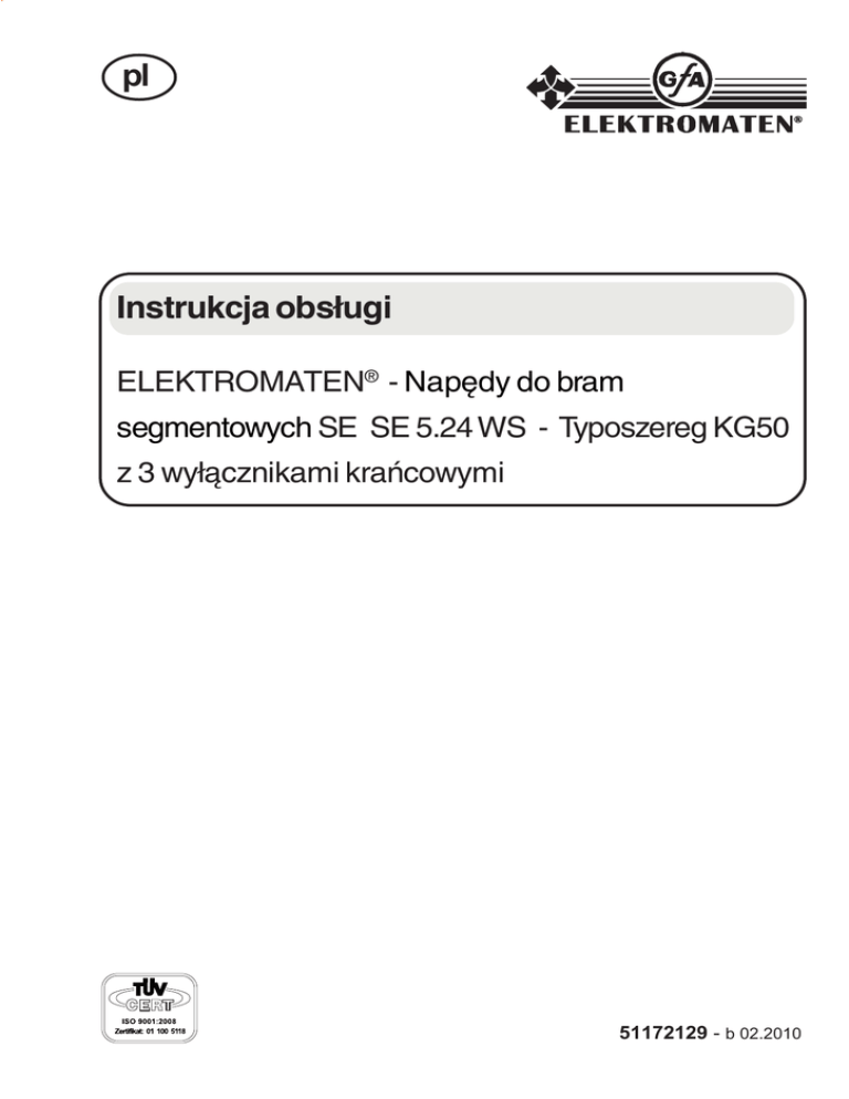 pl Instrukcja obsługi ELEKTROMATEN® - Napędy do bram segmentowych SE SE 5.24 WS - Typoszereg KG50 z 3 wyłącznikami krańcowymi 51172129 - b 02.2010 2 INSTRUKCJA OBSŁUGI 56010116 Strona WSKAZÓWKI BEZPIECZEŃSTWA .............................................................................. 4 DANE TECHNICZNE .................................................................................................... 6 WYMIARY MONTAŻOWE ............................................................................................. 7 WSKAZÓWKI MONTAŻOWE / MOCOWANIE PRZEKŁADNI ...................................... 8 AWARYJNE URUCHAMIANIE RĘCZNE ..................................................................... 9 PODŁĄCZENIE ELEKTRYCZNE ................................................................................. 11 Obwód bezpieczeństwa ............................................................................................. 11 Zestawienie płytek ...................................................................................................... 12 USTAWIENIA ................................................................................................................ 13 Robocze wyłączniki krańcowe OTW / ZAM ................................................................ 13 COROCZNE PRZEGLĄDY ........................................................................................... 14 TRANSPORT / SKŁADOWANIE / USUWANIE ............................................................ 15 OŚWIADCZENIE .......................................................................................................... 16 WSKAZÓWKI OGÓLNE Automat napędowy ELEKTROMAT® do bram segmentowych jest przeznaczony do stosowania jako napęd bram segmentowych z pełnym wyrównoważeniem sprężynami skrętnymi lub ciężarem. Wszelkie inne zastosowania napędu ELEKTROMAT® wymagają uzgodnienia z producentem. W przypadku dokonywanie przeróbek w napędzie ELEKTROMAT® (jak np. zmiana okablowania) deklaracja producenta traci ważność. 3 WSKAZÓWKI BEZPIECZEŃSTWA Podstawowe wskazówki Niniejszy napęd wyprodukowano zgodnie z normami EN 12453 Bramy. Bezpieczeństwo użytkowania bram z napędem. Wymagania. oraz EN 12604 Bramy. Aspekty mechaniczne. Wymagania. Napęd następnie sprawdzono i wydano z zakładu w stanie pełnej sprawności technicznej. Aby utrzymać urządzenie w takim stanie i zagwarantować bezpieczną eksploatację, użytkownik musi przestrzegać wszystkich wskazówek i ostrzeżeń zawartych w niniejszej instrukcji obsługi. Zasadniczo przy instalacji elektrycznej wolno pracować wyłącznie wykwalifikowanym elektrykom. Muszą oni potrafić ocenić powierzone im prace, dostrzec potencjalne źródła zagrożeń i podjąć odpowiednie środki bezpieczeństwa. Dokonywanie przeróbek i zmian w napędach ELEKTROMAT® dopuszcza się wyłącznie po uprzednim uzgodnieniu z producentem. Stosowanie oryginalnych części zamiennych oraz zatwierdzonych akcesoriów służy zapewnieniu bezpieczeństwa. W przypadku stosowania innych części wygasa gwarancja. Bezpieczeństwo pracy napędów ELEKTROMAT® gwarantuje się wyłącznie przy eksploatacji zgodnej z ich przeznaczeniem. Pod żadnym pozorem nie wolno przekraczać wartości granicznych, określonych w danych technicznych (patrz odpowiednie rozdziały instrukcji obsługi). Istotne przepisy bezpieczeństwa Podczas instalacji, uruchamiania, konserwacji i kontroli napędów ELEKTROMAT® należy bezwzględnie przestrzegać odpowiednich przepisów BHP. W szczególności należy przestrzegać następujących przepisów (nie gwarantuje się kompletności zestawienia): Normy Europejskie EN 12453 Bramy. Bezpieczeństwo użytkowania bram z napędem. Wymagania. EN 12604 Bramy. Aspekty mechaniczne. Wymagania. dodatkowo należy przestrzegać ewentualnych odnośników normatywnych do wyżej wymienionych norm. Przepisy VDE (Związku Elektrotechników Niemieckich) VDE 0100 Przepisy dot. montażu instalacji elektroenergetycznych o napięciu znamionowym do 1000 V VDE 0105 Eksploatacja instalacji elektroenergetycznych EN 60204-1 / VDE 0113-1 Urządzenia elektryczne z napędami elektrycznymi EN 60335-1 / VDE 0700-1 Bezpieczeństwo urządzeń elektrycznych przeznaczonych do stosowania w gospodarstwach domowych i podobnych celów Przepisy przeciwpożarowe Przepisy o zapobieganiu nieszczęśliwym wypadkom Uwaga! Należy przestrzegać norm i przepisów, obowiązujących w Państwa kraju! 4 WSKAZÓWKI BEZPIECZEŃSTWA Wyjaśnienie symboli zagrożenia W niniejszej instrukcji obsługi znajdują się wskazówki ważne dla prawidłowej i bezpiecznej obsługi napędów ELEKTROMAT®. Poszczególne wskazówki mają następujące znaczenie: NIEBEZPIECZEŃSTWO Oznacza, że istnieje zagrożenie dla życia i zdrowia użytkownika, jeżeli nie zostaną zachowane odpowiednie środki ostrożności. UWAGA Oznacza ostrzeżenie przed możliwymi uszkodzeniami ELEKTROMATU lub innych wartości trwałych w przypadku niepodjęcia odpowiednich środków ostrożności. Ogólne uwagi o zagrożeniach i środkach bezpieczeństwa Poniższe wskazówki na temat zagrożeń należy rozumieć jako ogólne wytyczne, obowiązujące przy obchodzeniu się z ELEKTROMATEM w połączeniu z innymi urządzeniami. Wskazówki te muszą być koniecznie przestrzegane podczas instalacji i eksploatacji. Należy przestrzegać przepisów bezpieczeństwa i zapobiegania nieszczęśliwym wypadkom, obowiązujących dla danego zastosowania. Zabudowa ELEKTROMATU oraz otwieranie pokryw lub osłon i wykonywanie przyłącza elektrycznego muszą być wykonywane w stanie bez napięcia. ELEKTROMAT musi zostać zainstalowany razem z pokrywami i zabezpieczeniami, zgodnymi z przeznaczeniem urządzenia. Należy przy tym zwrócić uwagę na prawidłowe osadzenie ewentualnych uszczelek i właściwe dociągnięcie złączy gwintowych. W przypadku ELEKTROMATÓW, podłączonych lokalnie na stałe do sieci, należy zabudować wyłąc