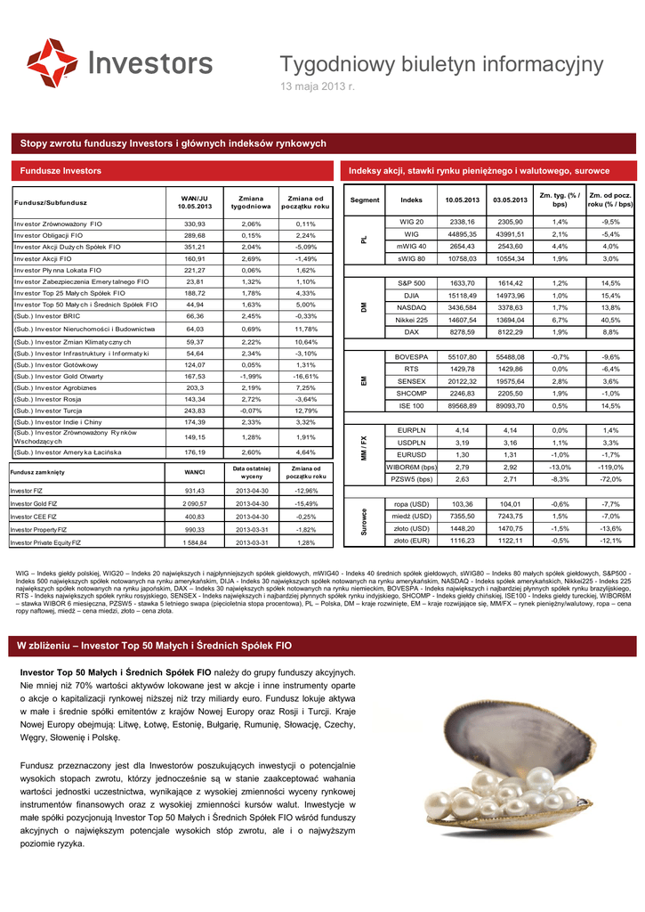 Tygodniowy biuletyn informacyjny 13 maja 2013 r. Stopy zwrotu funduszy Investors i głównych indeksów rynkowych Indeksy akcji, stawki rynku pieniężnego i walutowego, surowce Fundusze Investors WAN/JU 10.05.2013 Zmiana tygodniowa Zmiana od początku roku Inv estor Zrównoważony FIO 330,93 2,06% 0,11% WIG 20 Inv estor Obligacji FIO 289,68 0,15% 2,24% WIG Inv estor Akcji Duży ch Spółek FIO 351,21 2,04% -5,09% mWIG 40 Inv estor Akcji FIO 160,91 2,69% -1,49% sWIG 80 Inv estor Pły nna Lokata FIO 221,27 0,06% 1,62% Indeks 03.05.2013 Zm. tyg. (% / bps) Zm. od pocz. roku (% / bps) 2338,16 2305,90 1,4% -9,5% 44895,35 43991,51 2,1% -5,4% 2654,43 2543,60 4,4% 4,0% 10758,03 10554,34 1,9% 3,0% 10.05.2013 1,32% 1,10% S&P 500 1633,70 1614,42 1,2% 14,5% 1,78% 4,33% DJIA 15118,49 14973,96 1,0% 15,4% Inv estor Top 50 Mały ch i Średnich Spółek FIO 44,94 1,63% 5,00% NASDAQ 3436,584 3378,63 1,7% 13,8% (Sub.) Inv estor BRIC 66,36 2,45% -0,33% Nikkei 225 14607,54 13694,04 6,7% 40,5% (Sub.) Inv estor Nieruchomości i Budownictwa 64,03 0,69% 11,78% DAX 8278,59 8122,29 1,9% 8,8% (Sub.) Inv estor Zmian Klimaty czny ch 59,37 2,22% 10,64% BOVESPA 55107,80 55488,08 -0,7% -9,6% RTS 1429,78 1429,86 0,0% -6,4% SENSEX 20122,32 19575,64 2,8% 3,6% SHCOMP 2246,83 2205,50 1,9% -1,0% ISE 100 89568,89 89093,70 0,5% 14,5% EURPLN 4,14 4,14 0,0% 1,4% USDPLN 3,19 3,16 1,1% 3,3% EURUSD 1,30 1,31 -1,0% -1,7% WIBOR6M (bps) 2,79 2,92 -13,0% -119,0% PZSW5 (bps) 2,63 2,71 -8,3% -72,0% -7,7% 2,34% -3,10% 124,07 0,05% 1,31% (Sub.) Inv estor Gold Otwarty 167,53 -1,99% -16,61% 203,3 2,19% 7,25% (Sub.) Inv estor Agrobiznes (Sub.) Inv estor Rosja 143,34 2,72% -3,64% (Sub.) Inv estor Turcja 243,83 -0,07% 12,79% (Sub.) Inv estor Indie i Chiny 174,39 2,33% 3,32% (Sub.) Inv estor Zrównoważony Ry nków Wschodzący ch 149,15 1,28% 1,91% (Sub.) Inv estor Amery ka Łacińska 176,19 2,60% 4,64% WAN/CI Data ostatniej w yceny Zm iana od początku roku 931,43 2013-04-30 -12,96% Investor Gold FIZ 2 090,57 2013-04-30 -15,49% Investor CEE FIZ 400,83 2013-04-30 -0,25% Investor Property FIZ 990,33 2013-03-31 -1,82% 1 584,84 2013-03-31 1,28% Fundusz zam knięty Investor FIZ Investor Private Equity FIZ EM 54,64 (Sub.) Inv estor Gotówkowy MM / FX (Sub.) Inv estor Inf rastruktury i Inf ormaty ki DM 23,81 188,72 Inv estor Top 25 Mały ch Spółek FIO Surowce Inv estor Zabezpieczenia Emery talnego FIO Segment PL Fundusz/Subfundusz ropa (USD) 103,36 104,01 -0,6% miedź (USD) 7355,50 7243,75 1,5% -7,0% złoto (USD) 1448,20 1470,75 -1,5% -13,6% złoto (EUR) 1116,23 1122,11 -0,5% -12,1% WIG – Indeks giełdy polskiej, WIG20 – Indeks 20 największych i najpłynniejszych spółek giełdowych, mWIG40 - Indeks 40 średnich spółek giełdowych, sWIG80 – Indeks 80 małych spółek giełdowych, S&P500 Indeks 500 największych spółek notowanych na rynku amerykańskim, DIJA - Indeks 30 największych spółek notowanych na rynku amerykańskim, NASDAQ - Indeks spółek amerykańskich, Nikkei225 - Indeks 225 największych spółek notowanych na rynku japońskim, DAX – Indeks 30 największych spółek notowanych na rynku niemieckim, BOVESPA - Indeks największych i najbardziej płynnych spółek rynku brazylijskiego, RTS - Indeks największych spółek rynku rosyjskiego, SENSEX - Indeks największych i najbardziej płynnych spółek rynku indyjskiego, SHCOMP - Indeks giełdy chińskiej, ISE100 - Indeks giełdy tureckiej, WIBOR6M – stawka WIBOR 6 miesięczna, PZSW5 - stawka 5 letniego swapa (pięcioletnia stopa procentowa), PL – Polska, DM – kraje rozwinięte, EM – kraje rozwijające się, MM/FX – rynek pieniężny/walutowy, ropa – cena ropy naftowej, miedź – cena miedzi, złoto – cena złota. W zbliżeniu – Investor Top 50 Małych i Średnich Spółek FIO Investor Top 50 Małych i Średnich Spółek FIO należy do grupy funduszy akcyjnych. Nie mniej niż 70% wartości aktywów lokowane jest w akcje i inne instrumenty oparte o akcje o kapitalizacji rynkowej niższej niż trzy miliardy euro. Fundusz lokuje aktywa w małe i średnie spółki emitentów z krajów Nowej Europy oraz Rosji i Turcji. Kraje Nowej Europy obejmują: Litwę, Łotwę, Estonię, Bułgarię, Rumunię, Słowację, Czechy, Węgry, Słowenię i Polskę. Fundusz przeznaczony jest dla Inwestorów poszukujących inwestycji o potencjalnie wysokich stopach zwrotu, którzy jednocześnie są w stanie zaakceptować wahania wartości jednostki uczestnictwa, wynikające z wysokiej zmienności wyceny rynkowej instrumentów finansowych oraz z wysokiej zmienności kursów walut. Inwestycje w małe spółki pozycjonują Investor Top 50 Małych i Średnich Spółek FIO wśród funduszy akcyjnych o największym potencjale wysokich stóp zwrotu, ale i o najwyższym poziomie ryzyka. Investor Top 50 Małych i Średnich Spółek FIO został utworzony 29 grudnia 2006 r. Oficjalnym benchmarkiem funduszu jest w 50% Investor MS Index, w 10% indeks RTS2, w 10% indeks ISE i w 30% WIBID 6m. Więcej informacji wraz z bieżącymi notowaniami znajdą Państwo na: www.investors.pl Komentarz rynkowy Ubiegły tydzień upłynął pod znakiem jednoznacznej dominacji rynków rozwiniętych, które znów rosły, ustalając kolejne maksima. Amerykański Standad%Poor’s 500 rósł 1,2%, niemiecki DAX 1,9% i japoński Nikkei 225 ze spektakularną stopą zwrotu 6,7%. Co więcej apetyt na ryzyko amerykańskich inwestorów wzrasta z każdym dniem – kolejne szczyty notuje indeks małych spółek Russell 2000 z tygodniowym zyskiem 2,2%. Euforia na rynkach napędzana jest głównie drukowaniem pieniądza przez japoński bank centralny, które nie znajduje sprzeciwu ze strony innych rządów. Takie posunięcia banku centralnego oczywiście spychają wartość jena w stosunku innych walut w dół (JPY/USD -2,6%), polepszając atrakcyjność japońskiego eksportu. Oczywiście nie wszyscy muszą być zadowoleni z takiego obrotu rzeczy – istotnie traci na tym Korea, której towary stają się relatywnie mniej atrakcyjn