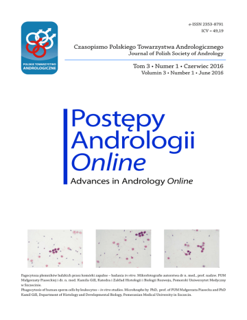e-ISSN 2353-8791 ICV = 49,19 Czasopismo Polskiego Towarzystwa Andrologicznego Journal of Polish Society of Andrology Tom 3 • Numer 1 • Czerwiec 2016 Volumin 3 • Number 1 • June 2016 Postępy Andrologii Online Advances in Andrology Online Fagocytoza plemników ludzkich przez komórki zapalne – badania in vitro. Mikrofotografie autorstwa dr n. med., prof. nadzw. PUM Małgorzaty Piaseckiej i dr. n. med. Kamila Gill, Katedra i Zakład Histologii i Biologii Rozwoju, Pomorski Uniwersytet Medyczny w Szczecinie. Phagocytosis of human sperm cells by leukocytes – in vitro studies. Microhraphs by PhD, prof. of PUM Małgorzata Piasecka and PhD Kamil Gill, Department of Histology and Developmental Biology, Pomeranian Medical University in Szczecin. POST ĘPY A NDROLOGII ONLINE, 2016, 3 (1) Czasopismo Polskiego Towarzystwa Andrologicznego e-ISSN 2353-8791 ICV = 49,19 Czasopismo Polskiego Towarzystwa Andrologicznego Journal of Polish Society of Andrology Tom 3 • Numer 1 • Czerwiec 2016 Volumin 3 • Number 1 • June 2016 Postępy Andrologii Online Postępy Andrologii Online Advances in Andrology Online Advances in Andrology Online http://www.postepyandrologii.pl Fagocytoza plemników ludzkich przez komórki zapalne – badania in vitro. Mikrofotografie autorstwa dr n. med., prof. nadzw. PUM Małgorzaty Piaseckiej i dr. n. med. Kamila Gill, Katedra i Zakład Histologii i Biologii Rozwoju, Pomorski Uniwersytet Medyczny w Szczecinie. Phagocytosis of human sperm cells by leukocytes – in vitro studies. Microhraphs by PhD, prof. of PUM Małgorzata Piasecka and PhD Kamil Gill, Department of Histology and Developmental Biology, Pomeranian Medical University in Szczecin. KOMITET REDAKCYJNY Redaktor naczelny: dr hab. n. med., prof. nadzw. PUM Małgorzata Piasecka, Szczecin Zastępca redaktora naczelnego: prof. dr hab. n. med. Jolanta Słowikowska-Hilczer, Łódź Redaktor pomocniczy: dr n. med. Kamil Gill, Szczecin Sekretarz redakcji: dr n. med. Agnieszka Kolasa-Wołosiuk, Szczecin Skarbnik redakcji: dr n. med. Renata Walczak-Jędrzejowska, Łódź Członkowie komitetu redakcyjnego: dr n. med. Szymon Bakalczuk, Lublin dr n. med. Leszek Bergier, Kraków prof. dr hab. n. biol. Barbara Bilińska, Kraków prof. dr hab. n. med. Barbara Darewicz, Białystok Prof., MD, PhD Aleksander Giwercman, Malmö, Sweden PhD Yvonne Lundberg Giwercman, Malmö, Sweden Prof., PhD (UPE/NMMU) and PhD (US) Gerhard Van der Horst, Republika Południowej Afryki (Bellville, Republic of South Africa) prof. dr hab. n. med. Grzegorz Jakiel, Warszawa prof. dr hab. n. med. Piotr Jędrzejczak, Poznań dr hab. n. med., prof. UMK Roman Kotzbach, Bydgoszcz prof. dr hab. n. med. Krzysztof Kula, Łódź lek. med. Robert Kulik, Warszawa prof. dr hab. n. med. Maria Laszczyńska, Szczecin dr hab. n. med. Grzegorz Ludwikowski, Bydgoszcz prof. dr hab. n. med. Marek Mędraś, Wrocław MD, PhD, DMSc Ewa Rajpert-De Meyts, Kopenhaga, Dania (Copenhagen, Denmark) dr n. med. Aleksandra Robacha, Łódź dr n. med. Maria Szarras-Czapnik, Warszawa Adres redakcji: Katedra i Zakład Histologii i Biologii Rozwoju Wydział Nauk o Zdrowiu Pomorski Uniwersytet Medyczny w Szczecinie 71-210 Szczecin ul. Żołnierska 48 tel. 91 48 00 917, 91 48 00 908 e-mail: [email protected] Projekt graficzny: Agnieszka Hilczer Waldemar Jachimczak Małgorzata Piasecka Jolanta Słowikowska-Hilczer Korekta języka polskiego: Wojciech Markowski Korekta języka angielskiego: Małgorzata Piasecka Jolanta Słowikowska-Hilczer Kamil Gill Skład i łamanie: Waldemar Jachimczak 2 POST ĘPY A NDROLOGII ONLINE, 2016, 3 (1) Czasopismo Polskiego Towarzystwa Andrologicznego e-ISSN 2353-8791 ICV = 49,19 Czasopismo Polskiego Towarzystwa Andrologicznego Journal of Polish Society of Andrology Tom 3 • Numer 1 • Czerwiec 2016 Volumin 3 • Number 1 • June 2016 Postępy Andrologii Online Postępy Andrologii Online Advances in Andrology Online Advances in Andrology Online http://www.postepyandrologii.pl Fagocytoza plemników ludzkich przez komórki zapalne – badania in vitro. Mikrofotografie autorstwa dr n. med., prof. nadzw. PUM Małgorzaty Piaseckiej i dr. n. med. Kamila Gill, Katedra i Zakład Histologii i Biologii Rozwoju, Pomorski Uniwersytet Medyczny w Szczecinie. Phagocytosis of human sperm cells by leukocytes – in vitro studies. Microhraphs by PhD, prof. of PUM Małgorzata Piasecka and PhD Kamil Gill, Department of Histology and Developmental Biology, Pomeranian Medical University in Szczecin. SPIS TREŚCI CONTENTS Tom 3 Volumin 3 Strony 1–83 Pages 1–83 Czerwiec 2016 June 2016 O czasopiśmie / About Journal 4 Artykuły oryginalne / Original article Katarzyna Marchlewska, Emilia Bogołębska, Renata Walczak-Jędrzejowska, Elżbieta Oszukowska, Krzysztof Kula, Jolanta Słowikowska-Hilczer Ocena dojrzałości chromatyny plemnikowej u mężczyzn z niepłodnych par Evaluation of sperm chromatin maturity in men from infertile couples Artur Wdowiak, Anita Wdowiak, Szymon Bakalczuk, Grzegorz Bakalczuk Relationship between alcohol consumption and sperm nuclear DNA fragmentation and pregnancy 6 14 Artykuły poglądowe / Review Jolanta Chanduszko-Salska Znaczenie pomocy psychologicznej i psychoterapii we wspomaganiu leczenia niepłodności The role of psychological help and psychotherapy as a supportive factor in infertility treatment 22 Jan Karol Wolski Palma sabalowa – czy warto zastosować w andrologii? Serenoa repens – is it worth to apply in andrology? 33 Rekomendacje medyczne Medical recommendation – Jolanta Słowikowska-Hilczer 39 K. Hatzimouratidis (Przewodniczący), I. Eardley, F. Giuliano, I. Moncada, A. Salonia Rekomendacje dotyczące zaburzeń seksualnych u mężczyzn: zaburzenia erekcji i przedwczesny wytrysk Guidelines on Male Sexual Dysfunction: erectile dysfunction and premature ejaculation Tłumaczenie i przygotowanie wersji polskiej Translation and elaboration of Polish version: Marta Sochaj, Zuzanna Słowikowska, Jolanta Słowikowska-Hilczer 40 Konferencja 