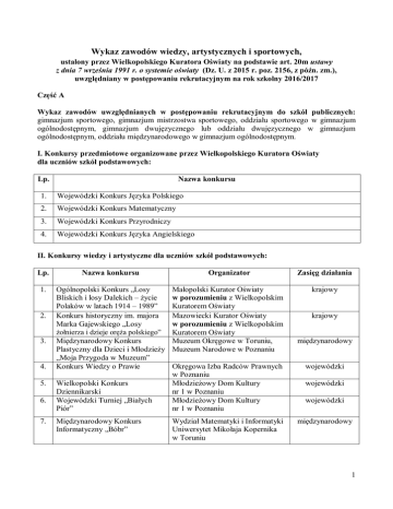 Wykaz zawodów wiedzy, artystycznych i sportowych, ustalony przez Wielkopolskiego Kuratora Oświaty na podstawie art. 20m ustawy z dnia 7 września 1991 r. o systemie oświaty (Dz. U. z 2015 r. poz. 2156, z późn. zm.), uwzględniany w postępowaniu rekrutacyjnym na rok szkolny 2016/2017 Część A Wykaz zawodów uwzględnianych w postępowaniu rekrutacyjnym do szkół publicznych: gimnazjum sportowego, gimnazjum mistrzostwa sportowego, oddziału sportowego w gimnazjum ogólnodostępnym, gimnazjum dwujęzycznego lub oddziału dwujęzycznego w gimnazjum ogólnodostępnym, oddziału międzynarodowego w gimnazjum ogólnodostępnym. I. Konkursy przedmiotowe organizowane przez Wielkopolskiego Kuratora Oświaty dla uczniów szkół podstawowych: Lp. Nazwa konkursu 1. Wojewódzki Konkurs Języka Polskiego 2. Wojewódzki Konkurs Matematyczny 3. Wojewódzki Konkurs Przyrodniczy 4. Wojewódzki Konkurs Języka Angielskiego II. Konkursy wiedzy i artystyczne dla uczniów szkół podstawowych: Lp. Nazwa konkursu Organizator Zasięg działania 1. Ogólnopolski Konkurs „Losy Bliskich i losy Dalekich – życie Polaków w latach 1914 – 1989” Konkurs historyczny im. majora Marka Gajewskiego „Losy żołnierza i dzieje oręża polskiego” Międzynarodowy Konkurs Plastyczny dla Dzieci i Młodzieży „Moja Przygoda w Muzeum” Konkurs Wiedzy o Prawie Małopolski Kurator Oświaty w porozumieniu z Wielkopolskim Kuratorem Oświaty Mazowiecki Kurator Oświaty w porozumieniu z Wielkopolskim Kuratorem Oświaty Muzeum Okręgowe w Toruniu, Muzeum Narodowe w Poznaniu krajowy 2. 3. 4. 5. 6. 7. Wielkopolski Konkurs Dziennikarski Wojewódzki Turniej „Białych Piór” Międzynarodowy Konkurs Informatyczny „Bóbr” krajowy międzynarodowy Okręgowa Izba Radców Prawnych w Poznaniu Młodzieżowy Dom Kultury nr 1 w Poznaniu Młodzieżowy Dom Kultury nr 1 w Poznaniu wojewódzki Wydział Matematyki i Informatyki Uniwersytet Mikołaja Kopernika w Toruniu międzynarodowy wojewódzki wojewódzki 1 8. 9. 10. 11. 12. 13. 14. 15. 16. 17. 18. 19. 20. Ogólnopolski Konkurs Plastyczny Gimnazjum w Sierakowie „Muzyka w szarości” im. Adama Olbrachta PrzyjmyPrzyjemskiego, Muzeum Ziemi Rawickiej, Miejskie Biuro Wystaw Artystycznych w Lesznie Konkurs w Dziedzinie Fundacja Edukacji Społecznej Matematyki oraz w Dziedzinie „EKOS” w Swarzędzu Literatury i Języka Polskiego „Złota Żabka” Konkurs Wiedzy o Powstaniu Ośrodek Doskonalenia Nauczycieli Wielkopolskim „Tobie Polsko w Poznaniu ta kropla krwi wrzącej...” Ogólnopolski „Konkurs Stowarzyszenie Ojczyzny Ojczyzny-Polszczyzny” Polszczyzny we Wrocławiu, Ośrodek Doskonalenia Nauczycieli w Poznaniu Ogólnopolski Festiwal Muzyki Kaliskie Stowarzyszenie Edukacji Dawnej „Schola Cantorum” Dzieci i Młodzieży „Schola Cantorum” w Kaliszu Konkurs Wiedzy o Wielkopolsce Stowarzyszenie Gmin i Powiatów Wielkopolski Konkurs Przyrodniczy Polskie Towarzystwo Ochrony dla Uczniów Gimnazjów i Szkół Przyrody „Salamandra” Podstawowych w Poznaniu Konkurs „Młody Innowator” Federacja Stowarzyszeń NaukowoTechnicznych NOT Towarzystwo Kultury Technicznej Ogólnopolski konkurs „Epizody Biuro Edukacji Publicznej Instytutu z najnowszej historii Polski Pamięci Narodowej w Warszawie w komiksie” Wojewódzki konkurs Szkoła Podstawowa nr 90 gry na flecie podłużnym im. W. Zamoyskiego Poznaniu, dla ogólnokształcących szkół Muzeum Instrumentów podstawowych i gimnazjów Muzycznych w Poznaniu „Tu powstała Polska” Starostwo Powiatowe w Gnieźnie, Centrum Kultury „Scena Dziwna” w Gnieźnie Ogólnopolski Przegląd Zespół Szkół w Nowym Folwarku Twórczości Teatralnej MASKA Międzynarodowy Konkurs Towarzystwo Upowszechniania „Kangur Matematyczny” Wiedzy i Nauk Matematycznych w Toruniu krajowy wojewódzki wojewódzki krajowy krajowy wojewódzki wojewódzki krajowy krajowy wojewódzki wojewódzki krajowy międzynarodowy III. Zawody sportowe: 1. Organizowane przez polskie związki sportowe i jednostki samorządu terytorialnego: - Wojewódzkie i Międzywojewódzkie Mistrzostwa Młodzików, - Mistrzostwa Polski Młodzików, - Ogólnopolska Olimpiada Młodzieży, - Mistrzostwa Polski Juniorów Młodszych. 2 2. Organizowane przez Szkolny Związek Sportowy - Igrzyska Młodzieży Szkolnej. 3. Organizowane przez światowe i europejskie federacje sportowe: - Oficjalne imprezy sportowe o randze Mistrzostw Świata, - Oficjalne imprezy sportowe o randze Mistrzostw Europy. 4. Zawody sportowe wymienione w pkt. 1-3 (ustalone na podstawie wykazu dyscyplin sportu objętych współzawodnictwem sportowym dzieci i młodzieży szkolnej, opracowanym przez Zespół Sportu Młodzieżowego Instytutu Sportu oraz Regulaminu Wielkopolskich Igrzysk Młodzieży Szkolnej) odnoszą się do następujących dyscyplin sportu: aerobik bilard hokej na trawie kajak polo kręglarstwo narciarstwo piłka ręczna pływanie synchroniczne sporty saneczkowe szermierka triathlon zapasy akrobatyka sportowa brydż sportowy jeździectwo karate tradycyjne, WKF, fudokan lekka atletyka, w tym biegi przełajowe orientacja sportowa piłka siatkowa skoki do wody badminton gimnastyka judo kolarstwo baseball hokej na lodzie kajakarstwo koszykówka łucznictwo łyżwiarstwo pięciobój nowoczesny piłka wodna snowboard piłka nożna pływanie sporty motorowe sporty wrotkarskie taekwondo unihokej żeglarstwo sumo tenis warcaby szachy tenis stołowy wioślarstwo IV. Miejsca uznane za wysokie w zawodach sportowych o zasięgu: - międzynarodowym (miejsca 1-8), - krajowym (miejsca 1-6), - wojewódzkim (miejsca 1-3), - powiatowym (miejsca 1-3). V. Miejsca uznane za wysokie w zawodach artystycznych i zawodach wiedzy o zasięgu: - międzynarodowym, - krajowym, - wojewódzkim, - powiatowym, to miejsca nagrodzone lub uhonorowane zwycięskim tytułem, a także wyróżnienia przyznane na podstawie regulaminu zawodów (konkursu), z wyłączeniem wyróżnień i nagród uzyskanych za uczestnictwo w zawodach. 3 Cz
