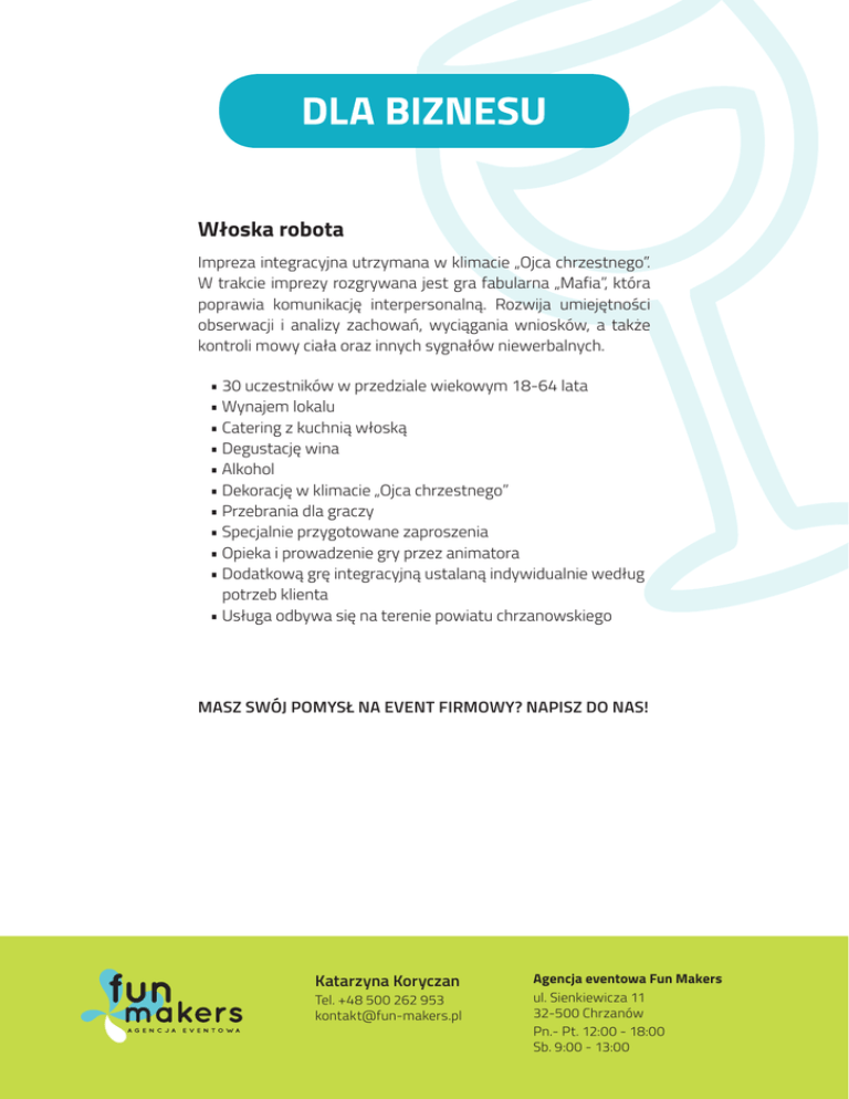 Włoska robota Impreza integracyjna utrzymana w klimacie „Ojca chrzestnego”. W trakcie imprezy rozgrywana jest gra fabularna „Mafia”, która poprawia komunikację interpersonalną. Rozwija umiejętności obserwacji i analizy zachowań, wyciągania wniosków, a także kontroli mowy ciała oraz innych sygnałów niewerbalnych. • 30 uczestników w przedziale wiekowym 18-64 lata • Wynajem lokalu • Catering z kuchnią włoską • Degustację wina • Alkohol • Dekorację w klimacie „Ojca chrzestnego” • Przebrania dla graczy • Specjalnie przygotowane zaproszenia • Opieka i prowadzenie gry przez animatora • Dodatkową grę integracyjną ustalaną indywidualnie według potrzeb klienta • Usługa odbywa się na terenie powiatu chrzanowskiego MASZ SWÓJ POMYSŁ NA EVENT FIRMOWY? NAPISZ DO NAS! Katarzyna Koryczan Tel. +48 500 262 953 [email protected] Agencja eventowa Fun Makers ul. Sienkiewicza 11 32-500 Chrzanów Pn.- Pt. 12:00 - 18:00 Sb. 9:00 - 13:00