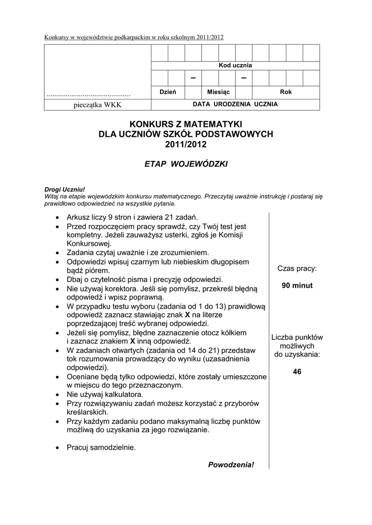 Witaj na etapie wojewódzkim konkursu matematycznego. Przeczytaj uważnie instrukcję i postaraj się
