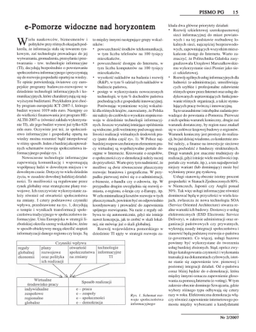 PISMO PG e−Pomorze widoczne nad horyzontem W ielu naukowców, biznesmenów i polityków przy różnych okazjach pod− kreśla, że informacja stała się towarem ryn− kowym, zaś technologie prowadzące do jej wytwarzania, gromadzenia, przesyłania i prze− twarzania – tzw. technologie informacyjne (TI), decydują bezpośrednio o powstawaniu społeczeństwa informacyjnego i przyczyniają się do rozwoju gospodarki opartej na wiedzy. Te opinie potwierdzają światowe czy euro− pejskie programy badawczo−rozwojowe w dziedzinie technologii informacyjnych i ko− munikacyjnych, które charakteryzują się naj− wyższymi budżetami. Przykładem jest choć− by program europejski ICT−2007−1, którego budżet wynosi 1019 mln euro. Następny co do wielkości finansowania jest program HE− ALTH−2007−a (również zakłada wykorzysta− nie TI), ale jego budżet wynosi już tylko 628 mln euro. Oczywiste jest też, że społeczeń− stwo informacyjne i gospodarkę opartą na wiedzy można rozumieć bądź interpolować w różny sposób. Jeden z bardziej akceptowal− nych schematów rozwoju społeczeństwa in− formacyjnego podaje rys. 1. Nowoczesne technologie informacyjne zapewniają komunikację i wspomagają współpracę ludzi w dowolnym miejscu i w dowolnym czasie. Dotyczy to wielu dziedzin życia, w zasadzie dowolnej ludzkiej działal− ności. Te możliwości są regulowane przez rynek globalny oraz strategiczne plany roz− wojowe. Ich rzeczywiste wykorzystanie za− leży również od otwartości społeczeństwa na zmiany. I cztery podstawowe czynniki wpływu, przedstawione na rys. 1, decydują o tempie i wynikach transformacji społe− czeństwa tradycyjnego w społeczeństwo in− formacyjne. Unia Europejska w strategii li− zbońskiej określa szereg wskaźników, które w sposób obiektywny mogą określić stopień informatyzacji danego regionu czy kraju. Są to między innymi następujące grupy wskaź− ników: powszechność środków telekomunikacji, w tym liczba telefonów na 100 tysięcy mieszkańców, powszechność dostępu do Internetu, w tym liczba komputerów na 100 tysięcy mieszkańców, wysokość nakładów na badania i rozwój (R&P), w tym % udział tych nakładów w budżecie państwa, postęp w wykorzystaniu nowoczesnych technologii, w tym % dochodów państwa pochodzących z gospodarki innowacyjnej. Porównując wymienione wyżej wskaźni− ki dla różnych krajów, zauważamy, że Polska nie należy do czołówki o wysokim stopniu roz− woju w dziedzinie technologii informacyj− nych. Jeszcze wyraźniej istniejące opóźnienia są widoczne, jeśli weźmiemy pod uwagę moż− liwości realizacji wirtualnych środowisk pra− cy (patrz dolna część rys. 1). W Polsce naj− bardziej rozpowszechnionym elementem pra− cy wirtualnej są współużywalne portale do− stępne w Internecie. Kreowanie e−zespołów, e−społeczności czy e−demokracji należy raczej do przyszłości. Warto przy tym nadmienić, że możliwe są dwie równoczesne płaszczyzny rozwoju: branżowa i geograficzna. W przy− padku pierwszej mówi się o e−administracji, e−biznesie, e−handlu czy e−zdrowiu, itp. W przypadku drugim uwzględnia się rozwój e− miasta, e−regionu, e−kraju czy e−Europy, itp. W celu minimalizacji kosztów rozwoju w tych płaszczyznach, powinien być on odpowiednio koordynowany i prowadzić do zapewnienia spójnego rozwiązania. Na razie z reguły od− bywa to się autonomicznie, gdyż nie istnieje nawet koncepcja, jak to zrobić w skali lokal− nej, nie mówiąc już o skali globalnej. Rozwój województwa pomorskiego w dziedzinie TI ujęty w strategii rozwoju za− · · · · Rys. 1. Schemat roz− woju społeczeństwa informacyjnego 15 kłada dwa główne priorytety działań: Rozwój szkieletowej szerokopasmowej sieci informacyjnej do miast powiato− wych i na tej podstawie rozbudowę lo− kalnych sieci, najczęściej bezprzewodo− wych, zapewniających wszystkim miesz− kańcom dostęp do Internetu. Warto za− znaczyć, że Politechnika Gdańska zasy− gnalizowała Urzędowi Marszałkowskie− mu wykorzystanie sieci Pionier jako sie− ci szkieletowej. Rozwój ogólnych usług informacyjnych dla ludności (e−administracja), umożliwiają− cych szybkie i profesjonalne załatwienie różnych spraw przez Internet oraz usług de− dykowanych usprawniających funkcjono− wanie różnych organizacji, a także stymu− lujących pracę twórczą i innowacyjną. Są to uzasadnione i niezbędne zadania pro− wadzące do powstania e−Pomorza. Pierwsze z nich spełnia warunek konieczny, drugie zaś warunek dostateczny, by region nasz znalazł się w czołówce krajowej budowy e−regionów. Warunek konieczny jest prostszy do realiza− cji, bo już dzisiaj wiadomo, co konkretnie zro− bić należy, a finanse na inwestycje sieciowe mogą pochodzić z funduszy strukturalnych. Drugi warunek jest znacznie trudniejszy do realizacji, gdyż istnieje wiele możliwości (np. portale czy wortale, itp.), a ten najodpowied− niejszy wariant (lub dominujący) może być wyłoniony przez grę rynkową. Usługi stanowią obecnie istotny procent gospodarki: w Stanach Zjednoczonych 80%, w Niemczech, Japonii czy Anglii ponad 50%. Tak więc usługi informacyjne również dominować będą w przyszłości w wielu kra− jach, zwłaszcza że nowa technologia SOA (Service Oriented Architecture) stwarza re− alne warunki ich budowy. Dostawcy e−usług elektronicznych (ESD Electronic Service Delivery), w zakresie administracji oraz or− ganizacji państwowych czy prywatnych, wykreują zasady integracji społeczeństwa i stanowić będą podstawę rozwoju e−państwa (e−goverment). Co więcej, usługi bazowe powinny być wykorzystane do tworzenia usług bardziej złożonych. Stąd, oprócz zwy− kłego katalogowania czynności i wykonania transakcji na dokumentach cyfrowych, istot− ne stanie się zapewnienie tzw. pionow