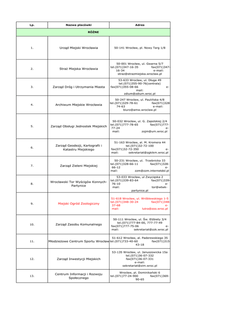 Lp. Nazwa placówki Adres RÓśNE 1. 2. 3. Urząd Miejski Wrocławia 50-141 Wrocław, pl. Nowy Targ 1/8 StraŜ Miejska Wrocławia 50-001 Wrocław, ul. Gwarna 5/7 tel.(071)347-16-35 fax(071)34716-34 e-mail: [email protected] Zarząd Dróg i Utrzymania Miasta 53-633 Wrocław, ul. Długa 49 tel.(071)355-90-76(centrala) fax(071)355-08-66 mail: [email protected] e- Archiwum Miejskie Wrocławia 50-247 Wrocław, ul. Paulińska 4/8 tel.(071)329-78-61 fax(071)32874-63 e-mail: [email protected] 5. Zarząd Obsługi Jednostek Miejskich 50-032 Wrocław, ul. G. Zapolskiej 2/4 tel.(071)777-78-65 fax(071)77777-24 email: [email protected] 6. Zarząd Geodezji, Kartografii i Katastru Miejskiego 51-163 Wrocław, al. M. Kromera 44 tel.(071)32-72-100 fax(071)32-72-350 email: [email protected] Zarząd Zieleni Miejskiej 50-231 Wrocław, ul. Trzebnicka 33 tel.(071)328-66-11 fax(071)32866-12 email: [email protected] Wrocławski Tor Wyścigów KonnychPartynice 53-033 Wrocław, ul Zwycięska 2 tel.(071)339-83-64 fax(071)33976-10 email: [email protected] Miejski Ogród Zoologiczny 51-618 Wrocław, ul. Wróblewskiego 1-5 tel.(071)348-30-24 fax(071)34837-68 email: [email protected] Zarząd Zasobu Komunalnego 50-111 Wrocław, ul. Św. ElŜbiety 3/4 tel.(071)777-84-00, 777-77-49 fax(071)777-75-06 email: [email protected] 4. 7. 8. 9. 10. 11. 51-612 Wrocław, al. Paderewskiego 35 fax(071)315MłodzieŜowe Centrum Sportu Wrocław tel.(071)733-40-60 43-18 12. Zarząd Inwestycji Miejskich 53-135 Wrocław, ul. Januszowicka 15a tel.(071)36-07-332 fax(071)36-07-331 e-mail: [email protected] 13. Centrum Informacji i Rozwoju Społecznego Wrocław, pl. Dominikański 6 tel.(071)77-24-900 fax(071)36990-65 Szkoły i placówki przedszkola Przedszkola 1. Przedszkole nr 1 "Planeta Uśmiechu" 51-151 Wrocław, al. Jana Kasprowicza 89a tel.(071)325-20-51 email: [email protected] 51-690 Wrocław, ul. Sławka 5 tel.(071)348-14-93 e-mail: [email protected] 2. Przedszkole nr 2 3. Przedszkole nr 3 "Wesoła Trójeczka" 50-315 Wrocław, ul. Nowowiejska 78 tel.(071)322-18-87 email: [email protected] Przedszkole nr 4 53-320 Wrocław, ul. Słowicza 3/5 tel.(071)78-459-46 bud.A, 78-15-652 bud.B dyr. mail: [email protected] Przedszkole nr 6 "Nad Odrą" 51-640 Wrocław, ul. Braci Gierymskich 89 tel.(071)347-63-92 email: [email protected] Przedszkole nr 10 54-047 Wrocław, ul. Starogajowa 100 tel.(071)354-38-39 email: [email protected] Przedszkole Integracyjne nr 12 im. Diany, KsięŜnej Walii 50-432 Wrocław, ul. Zgodna 10/14 tel.(071)343-46-74 email: [email protected] Przedszkole nr 13 51-611 Wrocław, ul. Noskowskiego 32 tel.(071)348-16-15 email: [email protected] Przedszkole nr 18 "Wiolinek" 50-348 Wrocław, ul. Sienkiewicza 83/85 tel.(071)322-90-78 e-mail: [email protected] Przedszkole nr 21 50-226 Wrocław, WybrzeŜe Conrada Korzeniowskiego 10 tel.(071)32-93-286, 322-32-86 e-mail: [email protected] Przedszkole nr 22 "Muchoborek" 54- 611 Wrocław, ul. Stanisławowska 90 tel.(071)357-49-59 e-mail: [email protected] Przedszkole nr 25 50-237 Wrocław, ul. Kręta 1/3 tel.(071)322-37-59 email: [email protected] www.przedszkole25wroclaw.republika.pl 4. 5. 6. 7. 8. 9. 10. 11. 12. e- 13. Przedszkole nr 27 "Skrzaty" 51-670 Wrocław, ul. Dembowskiego 37 tel.(071)348-24-61 email: [email protected] 14. Przedszkole nr 28 "Fantazja" 53-143 Wrocław, ul. Orla 5/7 tel.(071)361-18-30 e-mail: [email protected] 15. Przedszkole nr 30 "Bajlandia" 50-035 Wrocław, pl. Muzealny 13a tel.(071)343-28-15 e-mail: [email protected] www.bajlandia.2be.pl 16. Przedszkole nr 31 im. Janiny Porazińskiej 17. Przedszkole nr 33 "Staromiejskie" 50-036 Wrocław, ul. Łąkowa 2 tel.(071)343-47-38 e-mail: [email protected] 18. Przedszkole nr 34 50-344 Wrocław, ul. Gdańska 26 tel.(071)328-39-55 e-mail: [email protected] www.p34.e-wroclaw.info 19. Przedszkole nr 35 "Tęczowy Domek" odziałami integracyjnymi 20. 21. Przedszkole nr 36 im. Wandy Chmielowskiej Przedszkole nr 41 im. Jana Pawła II 53-404 Wrocław, ul. Kolbuszowska 6 tel.(071)361-52-37 email: [email protected] z 50-445 Wrocław, ul. Pułaskiego 20 tel.(071)343-45-27 e-mail: [email protected] 51-617 Wrocław, ul. Witelona 6 tel.(071)348-33-85 e-mail: [email protected] www.przedszkole36.ig.pl 53-678 Wrocław, ul. Dobra 16 tel.(071)355-37-51 mail: [email protected] www.p41.wroc.pl 22. Przedszkole nr 43 50-011 Wrocław, ul. Kościuszki 27a tel.(071)344-24-41 e-mail: [email protected] 23. Przedszkole nr 47 "Leśny Ludek" 51-608 Wrocław, ul. RóŜyckiego 1a tel.(071)348-16-92 e-mail: [email protected] Przedszkole nr 48 51-618 Wrocław, ul. Bartla 3 tel.(071)348-18-51 e-mail: [email protected] 24. 25. 26. Przedszkole nr 49 im. Tysiąclecia Miasta Wrocławia Przedszkole nr 50 "Mały Kolejarz" e- 50-553 Wrocław, ul. Borowska 181-187 tel.(071)367-19-62 e-mail: [email protected] www.przedszkole49.wroclaw.pl 50-228 Wrocław, ul. Dyrekcyjna 15 tel.(071)367-96-43 email: [email protected] www.przedszkole50.prv.pl Przedszkole nr 51 52-114 Wrocław, ul. Warszawska 4 tel.(071)342-33-32 e-mail: [email protected] 28. Przedszkole nr 52 "Gołąbki Pocztowe" 53-330 Wrocław, ul. Łączności 5 - 7 tel.(071)784-70-80 e-mail: [email protected] www.przedszkole52.wroclaw.pl 29. Przedszkole nr 54 "Pod Kasztanami" 50-621 Wrocław, ul. Wittiga 3 tel.(071)348-24-33 e-mail: [email protected] Przedszkole nr 55 50-315 Wrocław, ul. Nowowiejska 36 tel.(071)322-20-77 e-mail: [email protected] www.przedszkole55.wroc.pl 31. Przedszkole nr 56 "Niezapominajka" 52-314 Wrocław, ul. Wałbrzyska 16 tel.(071)361-74-17 e-mail: [email protected] www.przedszkole56wroclaw.prv.pl 32. Przedszkole nr 57 "Mały KsiąŜę" 52-023 Wrocław, ul. Chorzowska 55 tel.(071)340-05-83 email: [email protected] 33. Przedszkole nr 58 54-432 Wrocław, ul. Strzegomska 322 tel.(071)353-92-23 e-mail: [email protected] 34. Przedszkole nr 59 Krasnala pod Narcyzem 27. 30. 35. 36. 37. 38. 39. 40. U 53-225 Wrocław, ul. Narcyzowa 6 tel.(071)363-39-44 e-mail: [email protected] Przedszkole nr 61 53-60