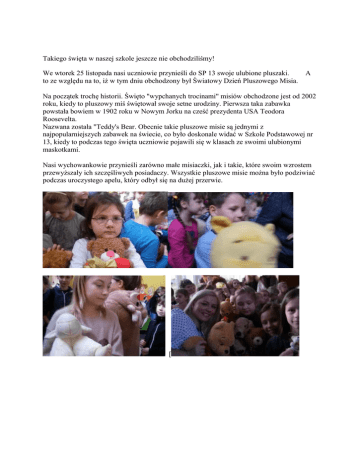 Takiego święta w naszej szkole jeszcze nie obchodziliśmy! We wtorek 25 listopada nasi uczniowie przynieśli do SP 13 swoje ulubione pluszaki. to ze względu na to, iż w tym dniu obchodzony był Światowy Dzień Pluszowego Misia. A Na początek trochę historii. Święto "wypchanych trocinami" misiów obchodzone jest od 2002 roku, kiedy to pluszowy miś świętował swoje setne urodziny. Pierwsza taka zabawka powstała bowiem w 1902 roku w Nowym Jorku na cześć prezydenta USA Teodora Roosevelta. Nazwana została "Teddy's Bear. Obecnie takie pluszowe misie są jednymi z najpopularniejszych zabawek na świecie, co było doskonale widać w Szkole Podstawowej nr 13, kiedy to podczas tego święta uczniowie pojawili się w klasach ze swoimi ulubionymi maskotkami. Nasi wychowankowie przynieśli zarówno małe misiaczki, jak i takie, które swoim wzrostem przewyższały ich szczęśliwych posiadaczy. Wszystkie pluszowe misie można było podziwiać podczas uroczystego apelu, który odbył się na dużej przerwie. [
