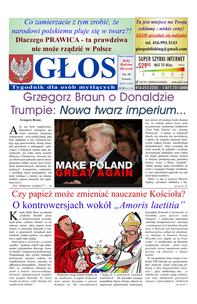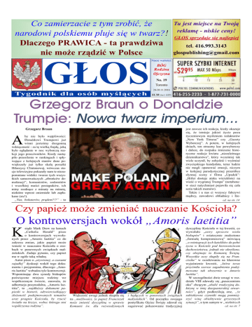 Co zamierzacie z tym zrobić, że narodowi polskiemu pluje się w twarz?! Dlaczego PRAWICA - ta prawdziwa nie może rządzić w Polsce GŁOS Nasze wartości: Tu jest miejsce na Twoją reklamę - niskie ceny! GŁOS sprzedaje się najlepiej tel. 416.993.3143 [email protected] BÓG Rodzina Ojczyzna No. 19 Toronto Grzegorz Braun o Donaldzie Trumpie: Nowa twarz imperium... Tygodnik dla osób myślących A 24-30.11.2016 $1.50 (incl. GST) Grzegorz Braun jest zawsze ich reakcja, kiedy okazuje się, że istnieje jakieś życie poza życzeniowym myśleniem redaktorów „New York Timesa” czy „Gazety Wyborczej”. A potem, w kolejnych dniach, ten straszny kac powyborczy i dalsze, do rozpuku śmieszne histeryczne reakcje kwiatu „niezależnego dziennikarstwa”, który wcześniej tak wiele uczynił, by zohydzić i wyśmiać zwycięskiego kandydata, teraz ludzie nie mogli opanować emocji, niczym w kolejnej parodystycznej przeróbce słynnej sceny z filmu „Upadek”: „Hitler dostaje ataku wściekłości na wieść o wygranej Trumpa” (notabene: w sieci natychmiast pojawiła się cała seria takich memów). Także i u nas ci wszyscy fałszywi mędrcy, zawodowi obłudnicy i łże- by nie było wątpliwości: Donaldowi Trumpowi już winni jesteśmy dozgonną wdzięczność - za tę wielką frajdę, jaką było oglądanie w noc wyborczą reakcji jego przeciwników. Kiedy nastąpiło przesilenie w rankingach i spływające z kolejnych stanów dane powiększały już tylko skalę porażki Hilarzycy Clintonowej, wówczas stacje telewizyjne pokazały nam te niezapomniane widoki: twarze tych wszystkich samozwańczych „obrońców demokracji”, komunistów, sodomitów i wszelkiej maści postępaków, ich miny rzednące z minuty na minutę, niektóre wprost oniemiałe lub zapłakane (sic!). „Nas, bohaterów, prądem?!?” - to Czy papież może zmieniać nauczanie Kościoła? cd. na str. 14 O kontrowersjach wokół „Amoris laetitia” K siądz Mark Drew na łamach „Catholic Herald” pisze o kontrowersjach wywołanych przez „Amoris laetitia” co do zakresu zmian, jakie papież może wnieść w nauczanie Kościoła o osobach w ponownych związkach małżeńskich. Zadaje pytanie, czy papież ma w ogóle taką władzę. Autor pisze o „ożywionej, a czasami zajadłej” dyskusji wokół tego dokumentu i przypomina, dlaczego „Amoris laetitia” wzbudza tyle kontrowersji. Wspominając dwa synody biskupów poświęcone miejscu rodziny we współczesnym świecie, zauważa, że adhortacja posynodalna, „Amoris laetitia”, to „najdłuższy dokument papieski w historii, odzwierciedlający złożoność podejmowanych tematów oraz pragnie Kościoła, by rzucić światło na kryzys, wobec którego stoi współczesna rodzina”. Większość uwagi jednak skupiła się na „możliwości, że papież Franciszek może zmienić dyscyplinę w sprawie Komunii św. dla rozwiedzionych i będących w ponownych związkach małżeńskich”. Od początku swojego pontyfikatu Ojciec Święty zdawał się sugerować poluzowanie tradycyjnej dyscypliny Kościoła w tej kwestii, co wywołało „ostry sprzeciw wielu biskupów” i ostatecznie znaleziono „formułę kompromisową” mówiącą „o reintegracji tych katolików do pełni życia w Kościele pod kierownictwem duchowieństwa, jednak nie określono, czy obejmuje to Komunię Świętą. Wszystkie oczy skupiły się na Franciszku” w oczekiwaniu na klarowne wyjaśnienie kwestii, „która teraz przyćmiła szersze zagadnienia podejmowane tak obszernie w Amoris laetitia”. W szczególności dwie uwagi w rozdziale VIII zdawały się „puszczeniem oka” chcącym „obalić tradycyjną doktrynę w imię duszpasterskiej otwartości”, gdyż podkreślają one, „że subiektywne czynniki mogą pomniejszyć winę obiektywnie grzesznych sytuacji”, a tym samym w „niektórych cd. na str. 7 POLSKA - ŚWIAT Premier Netanjahu chwalił Polskę za „odważną walkę z antysyjonizmem” STRONA 2 Premier Izraela Benjamin Netanjahu, z którym spotkała się we wtorek premier Polski Beata Szydło, wyraził radość, że „Polska podejmuje odważne kroki w walce z antysemityzmem i antysyjonizmem.” Premier Izraela podkreślił, że przyjaźń między Izraelem a Polską jest konkretna, ale ma też głęboki wymiar duchowy. Wspomniał o wspólnej historii obu narodów. – Trzy miliony polskich Żydów zostało zamordowanych przez niemieckich nazistów, była to ogromna tragedia, Polska również przeżyła ogrom cierpienia podczas II wojny światowej – powiedział Benjamin Netanjahu. – Polska ma zdecydowane stanowisko, jeżeli chodzi o pojawiający się antysemityzm w różnych częściach Europy. Doceniamy to – zaznaczył, podkreślając również wkład Polski w walce z antysyjonizmem. – To, co łączy dzisiaj Polskę i Izrael, to nasza historia, wspólne losy, które zostały brutalnie przerwane przez nazistowskich najeźdźców – mówiła z kolei Prezes Rady Ministrów. Zdaniem premier Beaty Szydło, obecnie należy walczyć o prawdę historyczną, mówić o historii, pokazywać wspólną przeszłość i budować na niej przyszłość. G£OS nr 19 24-30.11.2016 mier Szydło. Ponadto, bilateralne rozmowy dotyczyły współpracy turystycznej i kulturalnej. – Jesteśmy zdeterminowani, by walczyć z jakimkolwiek przejawem antysemityzmu, bo z tego wyrasta tylko i wyłącznie zło – podkreślała premier. Jak dodała: jest zrozumienie i pełna wola współpracy, mówienia jasno, kto był najeźdźcą, kto był katem, a kto był ofiarą. Beata Szydło mówiła, że ci, którzy zbudowali niemieckie hitlerowskie obozy zagłady w Polsce, chcieli zniszczyć i zarówno Polaków, jak i Żydów. - Te dzisiejsza rozmowy uwidoczniły, że Polska i Izrael łączy kulturowa bliskość, wspólnota naszych dzielonych historycznych losów i wyznawanych wartości - powiedziała szefowa rządu. WSPÓŁPRACA GOSPODARCZA Premier Beata Szydło zapewniła, że Polska bę