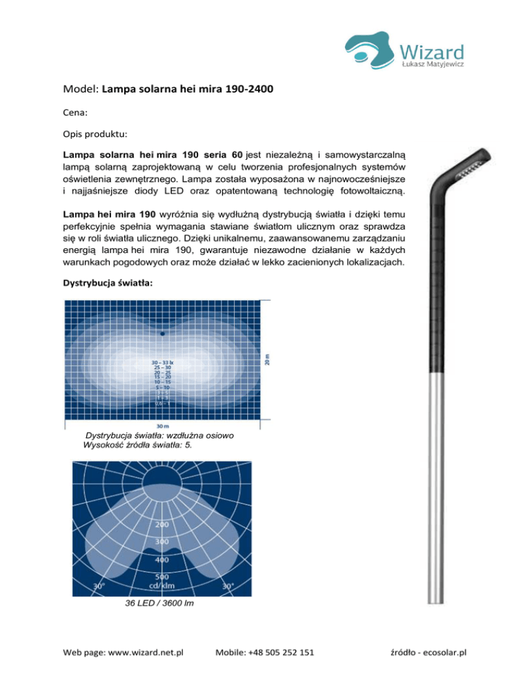 Model: Lampa solarna hei mira 190-2400 Cena: Opis produktu: Lampa solarna hei mira 190 seria 60 jest niezależną i samowystarczalną lampą solarną zaprojektowaną w celu tworzenia profesjonalnych systemów oświetlenia zewnętrznego. Lampa została wyposażona w najnowocześniejsze i najjaśniejsze diody LED oraz opatentowaną technologię fotowoltaiczną. Lampa hei mira 190 wyróżnia się wydłużną dystrybucją światła i dzięki temu perfekcyjnie spełnia wymagania stawiane światłom ulicznym oraz sprawdza się w roli światła ulicznego. Dzięki unikalnemu, zaawansowanemu zarządzaniu energią lampa hei mira 190, gwarantuje niezawodne działanie w każdych warunkach pogodowych oraz może działać w lekko zacienionych lokalizacjach. Dystrybucja światła: Dystrybucja światła: wzdłużna osiowo Wysokość źródła światła: 5. 36 LED / 3600 lm Web page: www.wizard.net.pl Mobile: +48 505 252 151 źródło - ecosolar.pl Lampa solarna mira 190 jest dostępna z następującymi opcjami: stacja ładowania dla pojazdów elektrycznych czujnik ruchu dla zarządzania dystrybucją światła wyspecyfikowaną przez użytkownika opcja częściowo solarna dla lokalizacji o bardzo słabych warunkach oświetleniowych zdalna obsługa i zdalne sterowanie PARAMETRY TECHNICZNE: Model mira 190 Wysokość lampy 5.8 m Wysokość źródła światła 5.5 m Średnica masztu lampy 180 mm Kolor głowicy oprawy lampy RAL 9005, ciemno czarny (standardowo) stal, ocynkowana ogniowo, malowana (opcjonalnie stal nierdzewna, aluminium) Maszt Kolor masztu RAL 9006, jasne aluminium (standardowo) Instalacja fundament (opcjonalnie płyta mocująca) Waga 185 kg HEI power LED Źródło światła mira 190-2400 24 zintegrowanych LED’ów o bardzo 36 zintegrowanych LED’ów o bardzo wysokiej wydajności wysokiej wydajności Dystrybucja światła Moc maksymalna Maksymalny strumień świetlny Efektywność energetyczna Temperatura źródła światła LED mira 190-3600 wzdłużna osiowa wzdłużna osiowa 24 W 36 W 2400 Lumenów 3600 Lumenów 82% 82% biały-zimny - 5300K standardowo (opcjonalnie biały-neutralny 4100 Kelwinów, biały-ciepły, 3100 Kelwinów) Typowa żywotność Typowa jasność Oświetlana powierzchniatypowo 60 – 150 m2 >75000 godzin >75000 godzin do 12 lx do 16 lx typowo 100 – 250 m2 Rura zasilająca HEI Wysokość modułu PV 2.16 m Średnica modułu PV 180 mm Web page: www.wizard.net.pl Mobile: +48 505 252 151 źródło - ecosolar.pl Technologia PV krzemowe ogniwa fotowoltaiczne Ilość ogniw fotowoltaicznych 64 sztuki Nominalna moc wyjściowa 192 Wp Kontrola/Sterowanie mocą HEI Programowalny mikrokontroler Dynamiczny profil oświetlenia tak zaprogramowany dla danego zastosowania zgodnie z życzeniem klienta Czujnik ruchu opcjonalny Pojemność baterii 12V/72Ah (standardowo w maszcie) 12V/75Ah (w studzience pod ziemią)* Technologia baterii kwasowo - ołowiowa Standardy/Zgodność Oświetlenie Poziom ochrony modułu PV Certyfikacja masztu lampy Poziom ochrony elektroniki zgodnie z normą EN 13201 IK06 EN 40-5, EN 40-3-1, ISO 1461 IP65 Emisja EMV EN 55015, EN 61547 Standard PV EN 61215 (przystosowana) Certyfikat CE posiada * Instalacja baterii w ziemi jest rekomendowana dla lokalizacji gdzie występują niskie temperatury w celu wydłużenia ich żywotności Web page: www.wizard.net.pl Mobile: +48 505 252 151 źródło - ecosolar.pl