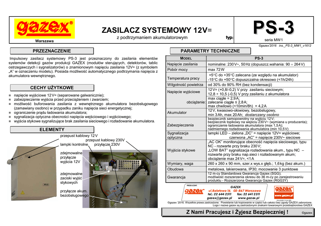 ZASILACZ SYSTEMOWY 12 V= z podtrzymaniem akumulatorowym Warszawa typ: PS-3 seria MW1 ©gazex’2016 ins._PS-3_MW1_v1612 PRZEZNACZENIE Impulsowy zasilacz systemowy PS-3 jest przeznaczony do zasilania elementów systemów detekcji gazów produkcji GAZEX (modułów sterujących, detektorów, tablic ostrzegawczych i sygnalizatorów) o znamionowym napięciu zasilania 12V= (z symbolem „A” w oznaczeniu modelu). Posiada możliwość automatycznego podtrzymania napięcia z akumulatora wewnętrznego. CECHY UŻYTKOWE napięcie wyjściowe 12 V= (separowane galwanicznie); zabezpieczenie wyjścia przed przeciążeniem i zwarciem; możliwość buforowania zasilania z wewnętrznego akumulatora bezobsługowego (zamawiany osobno) w przypadku zaniku napięcia sieci energetycznej; ograniczenie prądu ładowania akumulatora; sygnalizacja optyczna obecności napięcia wejściowego i wyjściowego; wyjścia stykowe sygnalizujące brak zasilania sieciowego i rozładowanie akumulatora. PARAMETRY TECHNICZNE MODEL Napięcie zasilania Pobór mocy nominalne: 230 V~, 50 Hz (dopuszcz.wahania: 90 ÷ 264 V) max 72 W +5°C do +35°C zalecana (ze względu na akumulator) Temperatura pracy -15°C do +50°C dopuszczalna okresowo (<1h/24h) Wilgotność powietrza od 30% do 90% RH (bez kondensacji) 12 V= (+0,8/-0,2) V przy zasilaniu sieciowym; Napięcie wyjściowe 12,8 ÷ 10,5 (-0,5) V przy zasilaniu z akumulatora max ciągłe = 2,9 A; obciążenie: zalecane ciągłe ≤ 2,8 A; max chwilowo (<10min/8h) = 4,2 A 12 V, kwasowo-ołowiowy, bezobsługowy, Akumulator min 3 Ah, max 20 Ah; dostarczany osobno Zabezpieczenia ELEMENTY przepust kablowy 12 V przepust kablowy 230V lampki kontrolne przyłącze 230V zdejmowalne przyłącze wyjścia 12V zdejmowalne zaciski wyjść stykowych przyłącze akum. bezobsługowego PS-3 Sygnalizacja optyczna Wyjścia stykowe Wymiary, waga Obudowa bezpiecznik samopowrotny na wyjściu 12 V; bezpiecznik topikowy na wejściu 230 V~ (wymiana u producenta); ograniczenie ładowania akumulatora (max 1,5 A); nadmiernego rozładowania akumulatora (min 10,5 V) lampki LED – zielona „DC” = napięcie 12V= wyjściowe; czerwona „AC” = napięcie 230V~ sieciowe „AC OK” monitorujące obecność napięcia sieciowego, typu NC - rozwarte przy braku 230 V; „LOW BAT” sygnalizacja rozładowania akum., typu NC – rozwarte przy braku nap.sieci i rozładowanym akum; obciążenie max 24 V=, <1 A 260 x 260 x 90 mm, szer.x wys.x głęb.; 1,6 kg (bez akum.) metalowa, lakierowana, IP30; mocowanie 3 punktowe 12 m-cy Standardowa Gwarancja Gazex (SGG); możliwość rozszerzenia okresu do 36 m-cy po zarejestrowaniu produktu - Rozszerzona Gwarancja Gazex (RGG3Y) Gwarancja PRODUCENT: G AZEX ul.Baletowa 16 , 02-867 Warszawa tel. : 22 644 2511 fax: 22 64 1 2311 gazex@ gazex.pl www.gaz ex.pl ©gazex ’2016. Wszelkie prawa zastrzeżone. Powielanie lub kopiowanie w części lub całości bez zgody GAZEX zabronione. Logo i nazwa gazex są zastrzeżonymi znakami towarowymi przedsiębiorstwa GAZEX Z Nami Pracujesz i Żyjesz Bezpieczniej ! ©gazex 5) Przy podłączonym sprawnym akumulatorze, odłączyć zasilanie 230V~. Lampka czerwona „AC” powinna zgasnąć, zielona „DC” powinna pozostać ciągle zapalona. Prawidłowa praca systemu przez przynajmniej kilka minut, świadczy o poprawnej pracy buforowej zasilacza. Włączyć zasilanie 230V~. Zapalenie lampki czerwonej „AC” świadczy o poprawnej pracy zasilacza. MONTAŻ / URUCHOMIENIE Ze względu na przeznaczenie, PS-3 należy montować w miejscu: - możliwie blisko potencjalnych odbiorników zasilanych napięciem 12V (aby ograniczyć spadek napięcia na przewodzie zasilającym); - z dala od źródeł ciepła, w miejscu nienasłonecznionym; - tak, aby nie ograniczać przepływu powietrza wokół bocznych otworów wentylacyjnych i od góry (aby uniknąć przegrzania i wydłużyć trwałość akumulatora); - na wysokości 0,5 ÷ 1,5m nad poziomem podłoża (aby ułatwić konserwację i zapobiec uszkodzeniu podczas sprzątania), - z dala od urządzeń radioelektronicznych (w tym telefonów komórkowych i bezprzedowowych). Zdemontować pokrywę zasilacza: wykręcić 2 śruby mocujące , lekko odchylić pokrywę i unieść do góry. Przytwierdzić podstawę zasilacza do ściany w 3 punktach. Mocowanie musi być bardzo solidne ze względu na znaczny ciężar akumulatora. Przez przepust dławicowy z lewej strony zasilacza wprowadzić przewód do zasilania elementów systemu detekcji i podłączyć go do zacisków wyjściowych napięcia 12V (zaciski zdejmowalne). Połączenie należy wykonać przewodem o przekroju 1,5 lub 2,5 mm2. Szczegóły doboru przewodu połączeniowego – odnieść się do właściwych instrukcji obsługi podłączanych urządzeń. Przez dławicę z prawej strony należy wprowadzić przewód zasilający sieci energetycznej 230V~ ze zdjętą izolacją oponową do wewnętrznej strony przepustu. Połączenie należy wykonać przewodem o przekroju nie większym niż 3 x 1,5 mm2, pamiętając o zachowaniu kolejności przewodów złącza 230VAC: - podłączyć przewód ochronny PE do zacisku z przewodem żółtozielonym (połączonym z kołkiem uziemienia na obudowie); - przewód neutralny do zacisku z przewodem niebieskim; - przewód fazowy do zacisku z przewodem czarnym. Przewody i złącza ułożyć powyżej metalowej, dziurkowanej osłony przetwornicy. Zasilanie 230V~ do PS-3 należy podłączyć poprzez wydzielony odłącznik instalacyjny, rozłączający oba (L i N) przewody zasilające. Jeśli wymagany jest monitoring pracy zasilacza PS-3, podłączyć przewody do zdejmowalnych złącz [AC OK.]. oraz [BAT LOW]. Sprawdzić połączenia (polaryzację przewodów) i stan elementów systemu detekcji (gotowość do pracy). URUCHOMIENIE: 1) Wyjąć zaciski wyjściowe 12V z gniazda (ciągnąc do góry). 2) Włączyć zasilanie 230V~. Lampki LED zielona („AC”) i czerwona („DC”) powinny świecić ciągle. Wyłączyć zasilanie 230V~. 3) Wcisnąć zaciski