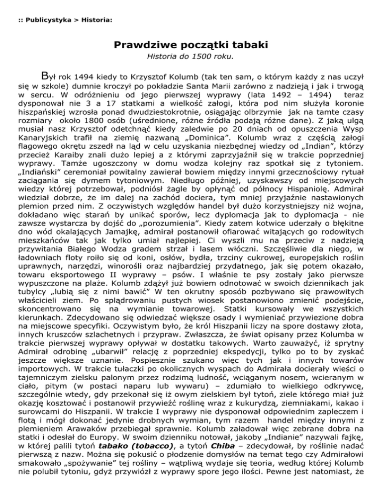 :: Publicystyka > Historia: Prawdziwe początki tabaki Historia do 1500 roku. Był rok 1494 kiedy to Krzysztof Kolumb (tak ten sam, o którym każdy z nas uczył się w szkole) dumnie kroczył po pokładzie Santa Marii zarówno z nadzieją i jak i trwogą w sercu. W odróżnieniu od jego pierwszej wyprawy (lata 1492 – 1494) teraz dysponował nie 3 a 17 statkami a wielkość załogi, która pod nim służyła koronie hiszpańskiej wzrosła ponad dwudziestokrotnie, osiągając olbrzymie jak na tamte czasy rozmiary około 1800 osób (uśrednione, różne źródła podają różne dane). Z jaką ulgą musiał nasz Krzysztof odetchnąć kiedy zaledwie po 20 dniach od opuszczenia Wysp Kanaryjskich trafił na ziemię nazwaną „Dominica”. Kolumb wraz z częścią załogi flagowego okrętu zszedł na ląd w celu uzyskania niezbędnej wiedzy od „Indian”, którzy przecież Karaiby znali dużo lepiej a z którymi zaprzyjaźnił się w trakcie poprzedniej wyprawy. Tamże ugoszczony w domu wodza kolejny raz spotkał się z tytoniem. „Indiański” ceremoniał powitalny zawierał bowiem między innymi grzecznościowy rytuał zaciągania się dymem tytoniowym. Niedługo później, uzyskawszy od miejscowych wiedzy której potrzebował, podniósł żagle by opłynąć od północy Hispaniolę. Admirał wiedział dobrze, że im dalej na zachód dociera, tym mniej przyjaźnie nastawionych plemion przed nim. Z oczywistych względów handel był dużo korzystniejszy niż wojna, dokładano więc starań by unikać sporów, lecz dyplomacja jak to dyplomacja - nie zawsze wystarcza by dojść do „porozumienia”. Kiedy zatem kotwice uderzały o błękitne dno wód okalających Jamajkę, admirał postanowił ofiarować witających go rodowitych mieszkańców tak jak tylko umiał najlepiej. Ci wyszli mu na przeciw z nadzieją przywitania Białego Wodza gradem strzał i lasem włóczni. Szczęśliwie dla niego, w ładowniach floty roiło się od koni, osłów, bydła, trzciny cukrowej, europejskich roślin uprawnych, narzędzi, winorośli oraz najbardziej przydatnego, jak się potem okazało, towaru eksportowego II wyprawy – psów. I właśnie te psy zostały jako pierwsze wypuszczone na plaże. Kolumb zdążył już bowiem odnotować w swoich dziennikach jak tubylcy „lubią się z nimi bawić” W ten okrutny sposób pozbywano się prawowitych właścicieli ziem. Po splądrowaniu pustych wiosek postanowiono zmienić podejście, skoncentrowano się na wymianie towarowej. Statki kursowały we wszystkich kierunkach. Zdecydowano się odwiedzać większe osady i wymieniać przywiezione dobra na miejscowe specyfiki. Oczywistym było, że król Hiszpanii liczy na spore dostawy złota, innych kruszców szlachetnych i przypraw. Zwłaszcza, że świat opisany przez Kolumba w trakcie pierwszej wyprawy opływał w dostatku takowych. Warto zauważyć, iż sprytny Admirał odrobinę „ubarwił” relację z poprzedniej ekspedycji, tylko po to by zyskać jeszcze większe uznanie. Pospiesznie szukano więc tych jak i innych towarów importowych. W trakcie tułaczki po okolicznych wyspach do Admirała docierały wieści o tajemniczym zielsku palonym przez rodzimą ludność, wciąganym nosem, wcieranym w ciało, pitym (w postaci naparu lub wywaru) – zdumiało to wielkiego odkrywcę, szczególnie wtedy, gdy przekonał się iż owym zielskiem był tytoń, ziele którego miał już okazję kosztować i postanowił przywieźć roślinę wraz z kukurydzą, ziemniakami, kakao i surowcami do Hiszpanii. W trakcie I wyprawy nie dysponował odpowiednim zapleczem i flotą i mógł dokonać jedynie drobnych wymian, tym razem handel między innymi z plemieniem Arawaków przebiegał sprawnie. Kolumb załadował więc zebrane dobra na statki i odesłał do Europy. W swoim dzienniku notował, jakoby „Indianie” nazywali fajkę, w której palili tytoń tabako (tobacco), a tytoń Chiba – zdecydował, by roślinie nadać pierwszą z nazw. Można się pokusić o płodzenie domysłów na temat tego czy Admirałowi smakowało „spożywanie” tej rośliny – wątpliwą wydaje się teoria, według której Kolumb nie polubił tytoniu, gdyż przywiózł z wyprawy spore jego ilości. Pewne jest natomiast, że marynarze próbowali żuć tytoń i tabaczyć. Smak żutego tytoniu nie był jednak czymś wspaniałym a słowo „ogień” nie przechodziło przez gardła ludzi morza. Do Hiszpanii tytoń trafił jako zioło wciągane przez nozdrza palone i wcierane w ciało. Tabaczenie nie przetrwało jednak tej próby i mimo wszystko fajki triumfowały. W miarę upływu czasu oczywiste stało się, że tytoń był szeroko znaną wśród ludności Nowego Świata rośliną, wykorzystywaną od wschodnich wybrzeży Brazylii przez Wenezuelę (badania w trakcie wyprawy Amerigo Vespucci), Kubę, Haiti (wyspa badana do 1497 roku przez mnicha Romano Pane, o tabace i tytoniu pisał w dziele ‘De insularium ribitus’) i inne wyspy morza karaibskiego, Panamę i Meksyk aż po okolice obecnego Montrealu (Kanada). Nicotiana rustica, czyli tytoń dziki, machorka, bakun lub po prostu tytoń indiański ruszył w obieg. Późniejsze badania nad cywilizacjami prekolumbijskimi pozwoliły jednoznacznie stwierdzić, iż już w I wieku naszej ery palenie tytoniu i wciąganie tabaki było częścią religijnych obrzędów jak i codziennego życia Majów oraz ludności zamieszkującej kontynentalną część Ameryki Środkowej. W dalszym okresie odkryto zwyczaj przyjmowania tytoniu i tabaki pod różnymi postaciami w kulturze Azteków. Ostatni władca aztecki Montezuma II posiadał specjalną fajkę, którą wypalał po obiedzie. Prawdopodobnie tubylcy zwrócili uwagę na specyficzny zapach palonego tytoniu, z którym mogli mieć do czynienia przy wypalaniu łąk i lasów pod budowę osad oraz przypadkowych pożarów. Pojawiły się również teorie, według których to chińczycy wymyślili palenie tytoniu na długo przed kulturami amerykańskimi, jednak zapis