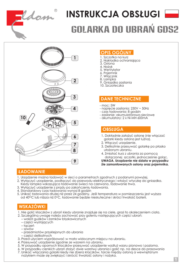 R INSTRUKCJA OBSŁUGI , golarka do ubran gds2 1 2 3 4 10 5 OPIS OGÓLNY 1. Szczotka na kurz 2. Nakładka ochraniająca 3. Osłona 4. Nożyk 5. Wentylator 6. Pojemnik 7. Włącznik 8. Lampka 9. Gniazdko zasilania 10. Szczoteczka DANE TECHNICZNE - moc: 5W - napięcie zasilania: 230V ~ 50Hz - czas ładowania: 8 godzin - zasilanie: akumulatorowo-sieciowe - akumulatory: 2 x Ni-MH 600mA OBSŁUGA 6 7 8 9 1. Dokładnie założyć osłonę (nie włączać golarki kiedy osłona jest luźna). 2. Włączyć urządzenie. 3. Delikatnie przesuwać golarkę po płasko ułożonym ubraniu. 4. Zmiatać kurz z ubrania za pomocą dołączonej szczotki, jednocześnie goląc. UWAGA. Urządzenie nie działa w przypadku źle zamontowanych osłony oraz pojemnika. ŁADOWANIE 1. Urządzenie można ładować w sieci o parametrach zgodnych z podanymi powyżej. 2. Wyłączyć urządzenie, podłączyć do przewodu elektrycznego i włożyć wtyczkę do gniazdka. Kiedy lampka wskazująca ładowanie świeci na czerwono, ładowanie trwa. 3. Wyłączyć urządzenie z prądu po zakończeniu ładowania. 4. Standardowy czas ładowania wynosi 8 godzin 5. Unikać ładowania dłużej niż przez 24 godziny. Jeśli temperatura w pomieszczeniu jest wyższa od 40OC lub niższa niż 0OC, ładowanie będzie nieskuteczne i skróci trwałość baterii. WSKAZÓWKI 1. Nie golić kłaczków z ubrań kiedy ubranie znajduje się na ciele, grozi to okaleczeniem ciała. 2. Szczególną uwagę należy zachować przy goleniu następujących części ubrań: – wokół guzików i zamków błyskawicznych – części wystających – łączeń – szwów – przedmiotów przyklejonych do ubrania – części delikatnych 3. Przed użyciem wypróbować w mało widocznym miejscu na ubraniu. 4. Przesuwać urządzenie zgodnie ze wzorem na ubraniu. 5. W przypadku opornych kłaczków przesuwać urządzenie wzdłuż wzoru pionowo i poziomo. 6. W przypadku cienkich ubrań złożyć dwie warstwy ubrania i golić np. na desce do prasowania 7. Unikać włączania golarki kiedy nie zbiera kłaczków, tarcie między osłoną a wewnętrznym nożykiem może się zwiększyć i skrócić trwałość osłony i nożyka. 1 KONSERWACJA I CZYSZCZENIE Gdy pojemnik napełni się w około 80%, należy wyczyścić pojemnik i wewnętrzne nożyki. - przed czyszczeniem odłączyć urządzenie od sieci i wyłączyć - urządzenia nie wolno zanurzać w wodzie - nie używać silnych lub niszczących powierzchnię środków czystości i produktów do czyszczenia - obudowę przecierać wilgotną szmatką Zdjąć osłonę nożyk Wentylator Wyciągnąć nożyk Wyczyścić pojemnik Zmontować nożyk, osłonę i nakładkę ochraniającą Osłona WSKAZÓWKI BEZPIECZEŃSTWA - przed pierwszym użyciem prosimy uważnie zapoznać się z całością treści niniejszej instrukcji - podczas mycia nie wolno zanurzać urządzenia w wodzie - sprzęt tylko do użytku domowego, przy eksploatacji przemysłowej, niezgodnej z przeznaczeniem lub wbrew niniejszej instrukcji sprzedawca nie ponosi żadnej odpowiedzialności, a uprawnienia z tytułu gwarancji wygasają - nie używać urządzenia do celów innych niż te wymienione w instrukcji - nie wolno używać urządzenia z uszkodzonym przewodem przyłączeniowym. W przypadku uszkodzenia należy konsultować się z Serwisem Producenta - urządzenie to nie jest przeznaczone do użytku przez osoby (w tym dzieci) z ograniczonymi zdolnościami fizycznymi, sensorycznymi lub umysłowymi, chyba że będą one nadzorowane przez osobę odpowiedzialną za ich bezpieczeństwo. Należy zwracać uwagę aby dzieci nie bawiły się sprzętem - napraw sprzętu może dokonać jedynie autoryzowany punkt serwisowy. Wszelkie modernizacje lub stosowanie innych niż oryginalne części zamiennych lub elementów urządzenia jest zabronione i zagraża bezpieczeństwu użytkowania - używać tylko z oryginalnie dołączonymi akcesoriami OCHRONA ŚRODOWISKA - urządzenie jest zbudowane z materiałów, które mogą być poddane ponownemu przetwarzaniu lub recyklingowi - należy je przekazać do odpowiedniego punktu, który zajmuje się zbieraniem i recyklingiem urządzeń elektrycznych i elektronicznych. GWARANCJA Producent zapewnia dobrą jakość i dobre działanie sprzętu, którego dotyczy niniejsza gwarancja w okresie 24 miesięcy od daty sprzedaży zapisanej w dowodzie zakupu. Wady lub uszkodzenia sprzętu ujawnione w okresie gwarancji, będą usuwane bezpłatnie w terminie 14 dni od daty dostarczenia niesprawnego urządzenia do punktu serwisowego wraz z dowodem zakupu. Reklamujący powinien dostarczyć uszkodzony sprzęt do miejsca zakupu lub wysłać go w oryginalnym opakowaniu wraz z dowodem zakupu Pocztą Polską do centralnego punktu serwisowego na adres: 40-238 Katowice, ul. Pawła Chromika 5A. Paczkę można wysłać Pocztą Polską jako przesyłkę pobraniową. Kwota pobrania powinna się równać kosztowi nadania przesyłki, a wartość paczki należy zadeklarować jako 0 PLN. Pojęcie "naprawa" nie obejmuje czynności wymienionych w instrukcji obsługi (np. czyszczenie lub konserwacja), do wykonania których zobowiazany jest użytkownik we własnym zakresie. Termin naprawy, w przypadku dostarczenia do centralnego punktu serwisowego wysyłką pocztową lub za innym pośrednictwem ulegnie przedłużeniu o czas niezbędny do dostarczenia i odbioru sprzętu.Gwarancją nie są objęte uszkodzenia powstałe w wyniku niewłaściwego lub niezgodnego z instrukcją jego użytkowania, przechowywania, konserwacji, samowolnego zrywania plomb oraz wszelkich uszkodzeń mechanicznych. Gwarancja nie obejmuje żarówek i baterii. Gwarancja na sprzedany towar konsumpcyjny nie wyłącza, nie ogranicza ani nie zawiesza uprawnień kupującego wynikających z niezgodności towaru z umową. Sprzęt przeznaczony jest wyłącznie do użytku domowego, w przypadku innego użytkowania traci gwarancję. 2 Eldom sp. z o.o. ul. Pawła Chromika 5a, 40-238 Katowice, POLAND tel: (032)255-33-40, fa