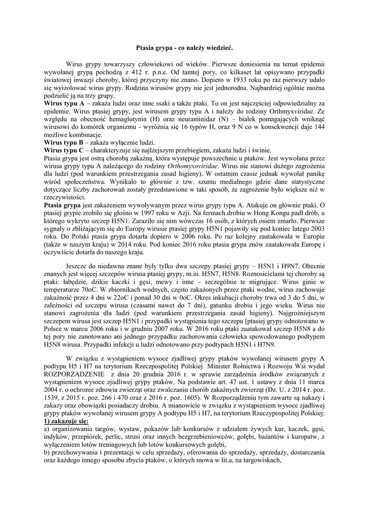 Ptasia grypa - co należy wiedzieć. Wirus grypy towarzyszy człowiekowi od wieków. Pierwsze doniesienia na temat epidemii wywołanej grypą pochodzą z 412 r. p.n.e. Od tamtej pory, co kilkaset lat opisywano przypadki światowej inwazji choroby, której przyczyny nie znano. Dopiero w 1933 roku po raz pierwszy udało się wyizolować wirus grypy. Rodzina wirusów grypy nie jest jednorodna. Najbardziej ogólnie można podzielić ją na trzy grupy. Wirus typu A – zakaża ludzi oraz inne ssaki a także ptaki. To on jest najczęściej odpowiedzialny za epidemie. Wirus ptasiej grypy, jest wirusem grypy typu A i należy do rodziny Orthmyxviridae. Ze względu na obecność hemaglutynin (H) oraz neuraminidaz (N) – białek pomagających wniknąć wirusowi do komórek organizmu - wyróżnia się 16 typów H, oraz 9 N co w konsekwencji daje 144 możliwe kombinacje. Wirus typu B – zakaża wyłącznie ludzi. Wirus typu C – charakteryzuje się najlżejszym przebiegiem, zakaża ludzi i świnie. Ptasia grypa jest ostrą chorobą zakaźną, która występuje powszechnie u ptaków. Jest wywołana przez wirusa grypy typu A należącego do rodziny Orthomyxoviridae. Wirus nie stanowi dużego zagrożenia dla ludzi (pod warunkiem przestrzegania zasad higieny). W ostatnim czasie jednak wywołał panikę wśród społeczeństwa. Wynikało to głównie z tzw. szumu medialnego gdzie dane statystyczne dotyczące liczby zachorowań zostały przedstawione w taki sposób, że zagrożenie było większe niż w rzeczywistości. Ptasia grypa jest zakażeniem wywoływanym przez wirus grypy typu A. Atakuje on głównie ptaki. O ptasiej grypie zrobiło się głośno w 1997 roku w Azji. Na fermach drobiu w Hong Kongu padł drób, u którego wykryto szczep H5N1. Zaraziło się nim wówczas 16 osób, z których osiem zmarło. Pierwsze sygnały o zbliżającym się do Europy wirusie ptasiej grypy H5N1 pojawiły się pod koniec lutego 2003 roku. Do Polski ptasia grypa dotarła dopiero w 2006 roku. Po raz kolejny zaatakowała w Europie (także w naszym kraju) w 2014 roku. Pod koniec 2016 roku ptasia grypa znów zaatakowała Europę i oczywiście dotarła do naszego kraju. Jeszcze do niedawna znane były tylko dwa szczepy ptasiej grypy – H5N1 i H9N7. Obecnie znanych jest więcej szczepów wirusa ptasiej grypy, m.in. H5N7, H5N8. Roznosicielami tej choroby są ptaki: łabędzie, dzikie kaczki i gęsi, mewy i inne – szczególnie te migrujące. Wirus ginie w temperaturze 70oC. W zbiornikach wodnych, często zakażonych przez ptaki wodne, wirus zachowuje zakaźność przez 4 dni w 22oC i ponad 30 dni w 0oC. Okres inkubacji choroby trwa od 3 do 5 dni, w zależności od szczepu wirusa (czasami nawet do 7 dni), gatunku drobiu i jego wieku. Wirus nie stanowi zagrożenia dla ludzi (pod warunkiem przestrzegania zasad higieny). Najgroźniejszym szczepem wirusa jest szczep H5N1 i przypadki wystąpienia tego szczepu [ptasiej grypy odnotowano w Polsce w marcu 2006 roku i w grudniu 2007 roku. W 2016 roku ptaki zaatakował szczep H5N8 a do tej pory nie zanotowano ani jednego przypadku zachorowania człowieka spowodowanego podtypem H5N8 wirusa. Przypadki infekcji u ludzi odnotowano przy podtypach H5N1 i H7N9. W związku z wystąpieniem wysoce zjadliwej grypy ptaków wywołanej wirusem grypy A podtypu H5 i H7 na terytorium Rzeczpospolitej Polskiej Minister Rolnictwa i Rozwoju Wsi wydał ROZPORZĄDZENIE z dnia 20 grudnia 2016 r. w sprawie zarządzenia środków związanych z wystąpieniem wysoce zjadliwej grypy ptaków. Na podstawie art. 47 ust. 1 ustawy z dnia 11 marca 2004 r. o ochronie zdrowia zwierząt oraz zwalczaniu chorób zakaźnych zwierząt (Dz. U. z 2014 r. poz. 1539, z 2015 r. poz. 266 i 470 oraz z 2016 r. poz. 1605). W Rozporządzeniu tym zawarte są nakazy i zakazy oraz obowiązki posiadaczy drobiu. A mianowicie w związku z wystąpieniem wysoce zjadliwej grypy ptaków wywołanej wirusem grypy A podtypu H5 i H7, na terytorium Rzeczypospolitej Polskiej: 1) zakazuje się: a) organizowania targów, wystaw, pokazów lub konkursów z udziałem żywych kur, kaczek, gęsi, indyków, przepiórek, perlic, strusi oraz innych bezgrzebieniowców, gołębi, bażantów i kuropatw, z wyłączeniem lotów treningowych lub lotów konkursowych gołębi, b) przechowywania i prezentacji w celu sprzedaży, oferowania do sprzedaży, sprzedaży, dostarczania oraz każdego innego sposobu zbycia ptaków, o których mowa w lit.a, na targowiskach, c) pojenia drobiu oraz ptaków utrzymywanych przez człowieka wodą ze zbiorników, do których dostęp mają dzikie ptaki, d) wnoszenia i wwożenia na teren gospodarstwa, w którym jest utrzymywany drób, zwłok dzikich ptaków lub tusz ptaków łownych; 2) nakazuje się: a) odosobnienie drobiu lub innych ptaków w gospodarstwie, w szczególności w zamkniętych obiektach budowlanych lub innych miejscach, w sposób uniemożliwiając y kontakt z drobiem lub innymi ptakami utrzymywanymi w innych gospodarstwach oraz ograniczający ich kontakt z dzikimi ptakami, b) zgłaszanie do powiatowego lekarza weterynarii miejsc, w których jest utrzymywany drób lub inne ptaki, z wyłączeniem ptaków utrzymywanych stale w pomieszczeniach mieszkalnych, c) utrzymywanie drobiu w sposób wykluczający jego dostęp do zbiorników wodnych, do których dostęp mają dzikie ptaki, d) zgłaszanie powiatowemu lekarzowi weterynarii właściwemu dla miejsca wysyłki, co najmniej na 24 godziny przed przemieszczeniem, informacji o planowanym przemieszczeniu przesyłek drobiu obejmujących: rodzaj przesyłki, ze wskazaniem odpowiednio gatunku drobiu, piskląt jednodniowych albo jaj wylęgowych, datę przemieszczenia, miejsce wysyłki i miejsce przeznaczenia, liczbę ptaków, e) przechowywanie paszy dla ptaków w sposób zabezpieczający przed kontaktem z dzikimi ptakami oraz i odchodami, f) karmienie i pojenie drobiu oraz ptaków utrzymywanych w niewoli w sposób zabezpieczający paszę i wodę przed dostępem dzikich ptaków oraz ic