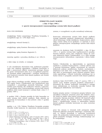 152 Dziennik Urzędowy Unii Europejskiej PL 13/t. 17 31996L0048 L 235/6 DZIENNIK URZĘDOWY WSPÓLNOT EUROPEJSKICH 17.9.1996 DYREKTYWA RADY 96/48/WE z dnia 23 lipca 1996 r. w sprawie interoperacyjności transeuropejskiego systemu kolei dużych prędkości RADA UNII EUROPEJSKIEJ, systemu, w szczególności na polu normalizacji technicznej; uwzględniając Traktat ustanawiający Wspólnotę Europejską, w szczególności jego art. 129d akapit trzeci, komercyjne wykorzystanie systemu kolei dużych prędkości wymaga doskonałej zgodności charakterystyk infrastruktury i taboru kolejowego; wyniki działalności, bezpieczeństwo, jakość usług i koszty zależą od tej zgodności, co zapewnia w szczególności interoperacyjność europejskiego systemu kolei dużych prędkości; uwzględniając wniosek Komisji (1), uwzględniając opinię Komitetu Ekonomiczno-Społecznego (2), uwzględniając opinię Komitetu Regionów (3), stanowiąc zgodnie z procedurą określoną w art. 189c (4), stosownie do dyrektywy Rady 91/440/EWG z dnia 29 lipca 1991 r. w sprawie rozwoju kolei wspólnotowych (6) przedsiębiorstwa kolejowe muszą mieć zwiększony dostęp do systemów kolejowych Państw Członkowskich, a to z kolei wymaga interoperacyjności infrastruktury, wyposażenia i taboru kolejowego; a także mając na uwadze, co następuje: w celu umożliwienia obywatelom Unii, podmiotom gospodarczym oraz władzom regionalnym i lokalnym korzystania w pełni z pozytywnych efektów ustanowienia pewnego obszaru bez granic wewnętrznych zaleca się w szczególności poprawienie powiązań między połączeniami i uzyskanie interoperacyjności krajowych systemów kolei dużych prędkości, jak również dostępu do nich; grupa robocza wysokiego szczebla, składająca się z przedstawicieli rządów Państw Członkowskich oraz przedstawicieli kolei europejskich i europejskiego przemysłu kolejowego, została zwołana przez Komisję, aby zrealizować wniosek o opracowanie generalnego planu transeuropejskiego systemu kolei dużych prędkości, który został wyrażony w rezolucji Rady z dnia 4 i 5 grudnia 1989 r.; w grudniu 1990 r. Komisja przesłała do Rady komunikat na temat systemu kolei dużych prędkości, Rada odniosła się pozytywnie do komunikatu w swej uchwale z dnia 17 grudnia 1990 r. (5); Państwa Członkowskie są odpowiedzialne za zapewnienie zgodności z zasadami bezpieczeństwa i ochrony zdrowia oraz z prawami konsumenta, ogólnie stosowanymi do systemów kolejowych podczas projektowania, budowy, uruchamiania i eksploatacji tych kolei; wraz z władzami lokalnymi odpowiadają także za przestrzeganie prawa własności gruntów, planowania regionalnego i ochrony środowiska naturalnego; jest to bardzo istotne w przypadku systemów kolei dużych prędkości; dyrektywa Rady 85/337/EWG z dnia 27 czerwca 1985 r. w sprawie oceny skutków pewnych projektów państwowych i prywatnych dla ochrony środowiska naturalnego (7) wymaga oceny oddziaływania na środowisko naturalne budowy linii obsługujących dalekobieżny ruch kolejowy; krajowe przepisy prawne i wewnętrzne przepisy kolejowe oraz specyfikacje techniczne stosowane przez linie kolejowe znacznie różnią się między sobą; krajowe przepisy prawne i przepisy wewnętrzne włączają procedury właściwe dla krajowych gałęzi przemysłu; zalecają one określone wymiary zewnętrzne, urządzenia i charakterystyki; sytuacja ta uniemożliwia kolejom dużych prędkości swobodne kursowanie na całym terytorium Wspólnoty; zgodnie z art. 129c Traktatu Wspólnota Europejska przyjmie wszystkie środki konieczne do zapewnienia interoperacyjności 1 () (2) (3) (4) Dz.U. C 134 z 17.5.1994, str. 6. Dz.U. C 397 z 31.12.1994, str. 8. Dz.U. C 210 z 14.8.1995, str. 38. Opinia Parlamentu Europejskiego z dnia 19 stycznia 1995 r. (Dz.U. C 43 z 20.2.1995, str. 60), wspólne stanowisko Rady z dnia 8 grudnia 1995 r. (Dz.U. 356 z 30.12.1995, str. 43) i decyzja Parlamentu Europejskiego z dnia 16 kwietnia 1996 r. (Dz.U. C 141 z 13.5.1996, str. 48). (5) Dz.U. C 33 z 8.2.1991, str. 1. przez lata sytuacja ta stworzyła ścisłe powiązania między krajowymi gałęziami przemysłu kolejowego a krajowymi kolejami, co stanowi przeszkodę w zawieraniu prawdziwych umów; dla podniesienia konkurencyjności w skali światowej te gałęzie przemysłu wymagają otwartego, konkurencyjnego rynku europejskiego; (6) Dz.U. L 237 z 24.8.1991, str. 25. (7) Dz.U. L 175 z 5.7.1985, str. 40. 13/t. 17 PL Dziennik Urzędowy Unii Europejskiej z tego powodu właściwe jest określenie zasadniczych wymagań dla całej Wspólnoty, które będą stosowane do transeuropejskiego systemu kolei dużych prędkości; w obliczu zasięgu i złożoności transeuropejskiego systemu kolei dużych prędkości wykazano, że z przyczyn praktycznych konieczne jest rozbicie go na podsystemy; dla każdego z tych podsystemów muszą być wyszczególnione zasadnicze wymagania, ustalone podstawowe parametry i wyznaczone warunki techniczne dla całej Wspólnoty, w szczególności w odniesieniu do części składowych i interfejsów, tak aby spełnić te zasadnicze wymagania; pewne podsystemy (środowisko naturalne, użytkownicy i eksploatacja) będą podlegać warunkom technicznym interoperacyjności (TSI) tylko w takim stopniu, w jakim jest konieczne zapewnienie interoperacyjności w sferze infrastruktury, energii, wydawania dyspozycji i kontroli oraz sterowania ruchem i taborem kolejowym; wprowadzenie przepisów dotyczących interoperacyjności transeuropejskiego systemu kolei dużych prędkości nie może stwarzać nieuzasadnionych barier w wielkości kosztów i korzyści dla zachowania istniejącej sieci kolejowej w każdym Państwie Członkowskim, ale musi dążyć do utrzymania celu kursowania kolei dużych prędkości na obszarze Wspólnoty; poszczególnym Państwom Członkowskim powinno się zezwolić w szczególnych przypadkach na niestosowanie pewnych warunków technicznych interoperacyjności, pod warunkiem że is