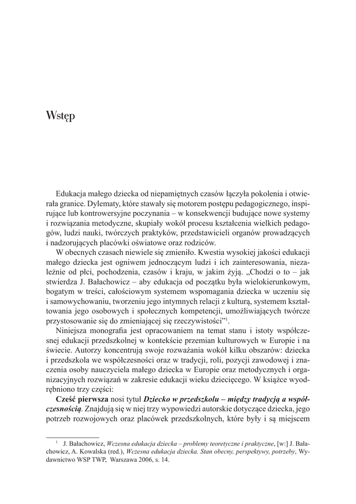 Wstęp Edukacja małego dziecka od niepamiętnych czasów łączyła pokolenia i otwierała granice. Dylematy, które stawały się motorem postępu pedagogicznego, inspirujące lub kontrowersyjne poczynania – w konsekwencji budujące nowe systemy i rozwiązania metodyczne, skupiały wokół procesu kształcenia wielkich pedagogów, ludzi nauki, twórczych praktyków, przedstawicieli organów prowadzących i nadzorujących placówki oświatowe oraz rodziców. W obecnych czasach niewiele się zmieniło. Kwestia wysokiej jakości edukacji małego dziecka jest ogniwem jednoczącym ludzi i ich zainteresowania, niezależnie od płci, pochodzenia, czasów i kraju, w jakim żyją. „Chodzi o to – jak stwierdza J. Bałachowicz – aby edukacja od początku była wielokierunkowym, bogatym w treści, całościowym systemem wspomagania dziecka w uczeniu się i samowychowaniu, tworzeniu jego intymnych relacji z kulturą, systemem kształtowania jego osobowych i społecznych kompetencji, umożliwiających twórcze przystosowanie się do zmieniającej się rzeczywistości”1. Niniejsza monografia jest opracowaniem na temat stanu i istoty współczesnej edukacji przedszkolnej w kontekście przemian kulturowych w Europie i na świecie. Autorzy koncentrują swoje rozważania wokół kilku obszarów: dziecka i przedszkola we współczesności oraz w tradycji, roli, pozycji zawodowej i znaczenia osoby nauczyciela małego dziecka w Europie oraz metodycznych i organizacyjnych rozwiązań w zakresie edukacji wieku dziecięcego. W książce wyodrębniono trzy części: Cześć pierwsza nosi tytuł Dziecko w przedszkolu – między tradycją a współczesnością. Znajdują się w niej trzy wypowiedzi autorskie dotyczące dziecka, jego potrzeb rozwojowych oraz placówek przedszkolnych, które były i są miejscem J. Bałachowicz, Wczesna edukacja dziecka – problemy teoretyczne i praktyczne, [w:] J. Bałachowicz, A. Kowalska (red.), Wczesna edukacja dziecka. Stan obecny, perspektywy, potrzeby, Wydawnictwo WSP TWP, Warszawa 2006, s. 14. 1 10 Wstęp wspierania procesu indywidualizacji i socjalizacji. Monografię otwiera opracowanie Teresy Parczewskiej pt. Być wrażliwym na potrzeby dziecka… Autorka podejmuje tu problem zaspokajania potrzeb małych dzieci w ośrodkach przedszkolnych i szkolnych, podkreśla, że uwaga badaczy skierowana jest współcześ nie raczej na kwestie związane z zaspokojeniem potrzeb biologicznych dzieci, a w codziennym życiu nader często kultywowanie wartości zastępuje spełnianie materialnych, a nie rzeczywistych pragnień i potrzeb dziecka. W opracowaniu scharakteryzowano model francuski, który może stanowić dobry przykład zaspokajania potrzeb dziecka w praktyce edukacyjnej. Tekst Barbary BilewiczKuźni poświęcony jest analizie edukacji przedszkolnej w odniesieniu do osoby twórcy wychowania przedszkolnego, zwanego ojcem i prorokiem nowożytnego wychowania – Fryderyka Fröbla. Opracowanie podejmuje kwestie życia, postawy, filozofii i programu edukacyjnego Fröbla, którego poglądy i praca szybko zyskały uznanie w Polsce i na świecie, stając się podstawą organizacji wychowania przedszkolnego w zinstytucjonalizowanej formie. Opracowanie Małgorzaty Centner-Guz koncentruje się wokół problemu postrzegania społecznego przedszkola, które może być determinowane przez nazwę współczesnej placówki niepublicznej. Jak wskazuje Autorka, nazwy własne, podobnie jak inne kategorie językowe, biorą udział w budowaniu obrazu świata oraz dokonują oceny i wartościowania rozmaitych zjawisk za sprawą związanych z nimi konotacji, a więc treści nabytych w czasie ich funkcjonowania. Nazwy przedszkoli powinny kojarzyć się z miejscem rozwoju i edukacji małego dziecka oraz wiązać się z pozytywnym obrazem dziecka i dzieciństwa. Analizy poczynione przez Autorkę ukazują, że wartości ujawniające się w akcie nominacji placówek niepublicznych odnoszą się w głównej mierze do pojęć związanych ze stanem dzieciństwa. Druga część monografii o tytule Nauczyciel europejski obejmuje trzy autorskie opracowania. Beata Papuda wskazuje na podobieństwa i różnice w zakresie percepcji osoby nauczyciela i warunków jego pracy na przykładzie sytuacji nauczycieli przedszkolnych w Wielkiej Brytanii, Holandii, Finlandii. Autorka dochodzi do konkluzji, że na postrzeganie jego zawodu i statusu duży wpływ mają obiektywne okoliczności, takie jak opinia społeczna, rozwiązania polityczne, uwarunkowania kulturowe i środowiskowe. Magdalena Grochowalska przedstawia aspekty funkcjonowania nauczyciela w edukacji przedszkolnej jako człowieka, który organizuje uczenie się dzieci i młodzieży oraz jako osobę, która także sama się uczy. Autorka wykazuje, że nauczyciel w roli zawodowej działa w dwóch integralnych perspektywach: bezpośrednio w kontakcie z dzieckiem, organizując mu środowisko uczenia się, oraz w drugiej przestrzeni jako profesjonalista, reprezentujący grupę innych nauczycieli i współdziałający z nimi. Opracowanie Iwony Zwierzchowskiej zostało poświęcone analizie wyników badań przeprowadzonych wśród nauczycieli przedszkoli, dotyczących ich opinii i refleksji na temat realizowanej reformy oświatowej. Stanowisko nauczycieli wobec 11 Wstęp zachodzących zmian, ocena ich zasadności, problemy związane z dostosowaniem procesu edukacyjnego do założeń nowej podstawy programowej czy oczekiwane rodzaje wsparcia w związku z realizacją reformy to najistotniejsze kwestie, na które zwrócono uwagę w kontekście aktualnego stanu edukacji przedszkolnej. Trzecia część pracy pt. Metodyczne i organizacyjne rozwiązania w zakresie edukacji małego dziecka zawiera cztery teksty dotyczące propozycji praktycznych. Agata Jacewicz opisuje metody pracy edukacyjnej w przedszkolu. Autorka przedstawia klasyfikację metod W. Okonia i M. Kwiatowskiej, akcentując znaczenie metod aktywizujących oraz działań wspierających aktywność dzieci: