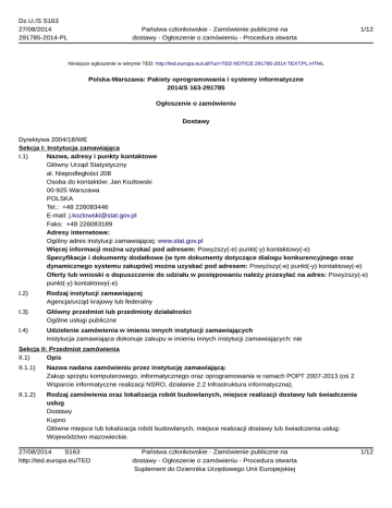 Dz.U./S S163 27/08/2014 291785-2014-PL Państwa członkowskie - Zamówienie publiczne na dostawy - Ogłoszenie o zamówieniu - Procedura otwarta 1/12 Niniejsze ogłoszenie w witrynie TED: http://ted.europa.eu/udl?uri=TED:NOTICE:291785-2014:TEXT:PL:HTML Polska-Warszawa: Pakiety oprogramowania i systemy informatyczne 2014/S 163-291785 Ogłoszenie o zamówieniu Dostawy Dyrektywa 2004/18/WE Sekcja I: Instytucja zamawiająca I.1) Nazwa, adresy i punkty kontaktowe Główny Urząd Statystyczny al. Niepodległości 208 Osoba do kontaktów: Jan Kozłowski 00-925 Warszawa POLSKA Tel.: +48 226083446 E-mail: [email protected] Faks: +48 226083189 Adresy internetowe: Ogólny adres instytucji zamawiającej: www.stat.gov.pl Więcej informacji można uzyskać pod adresem: Powyższy(-e) punkt(-y) kontaktowy(-e) Specyfikacje i dokumenty dodatkowe (w tym dokumenty dotyczące dialogu konkurencyjnego oraz dynamicznego systemu zakupów) można uzyskać pod adresem: Powyższy(-e) punkt(-y) kontaktowy(-e) Oferty lub wnioski o dopuszczenie do udziału w postępowaniu należy przesyłać na adres: Powyższy(-e) punkt(-y) kontaktowy(-e) I.2) Rodzaj instytucji zamawiającej Agencja/urząd krajowy lub federalny I.3) Główny przedmiot lub przedmioty działalności Ogólne usługi publiczne I.4) Udzielenie zamówienia w imieniu innych instytucji zamawiających Instytucja zamawiająca dokonuje zakupu w imieniu innych instytucji zamawiających: nie Sekcja II: Przedmiot zamówienia II.1) Opis II.1.1) Nazwa nadana zamówieniu przez instytucję zamawiającą: Zakup sprzętu komputerowego, informatycznego oraz oprogramowania w ramach POPT 2007-2013 (oś 2 Wsparcie informatyczne realizacji NSRO, działanie 2.2 Infrastruktura informatyczna). II.1.2) Rodzaj zamówienia oraz lokalizacja robót budowlanych, miejsce realizacji dostawy lub świadczenia usług Dostawy Kupno Główne miejsce lub lokalizacja robót budowlanych, miejsce realizacji dostawy lub świadczenia usług: Województwo mazowieckie. 27/08/2014 S163 http://ted.europa.eu/TED Państwa członkowskie - Zamówienie publiczne na dostawy - Ogłoszenie o zamówieniu - Procedura otwarta Suplement do Dziennika Urzędowego Unii Europejskiej 1/12 Dz.U./S S163 27/08/2014 291785-2014-PL Państwa członkowskie - Zamówienie publiczne na dostawy - Ogłoszenie o zamówieniu - Procedura otwarta 2/12 Kod NUTS PL12 II.1.3) Informacje na temat zamówienia publicznego, umowy ramowej lub dynamicznego systemu zakupów (DSZ) Ogłoszenie dotyczy zamówienia publicznego II.1.4) Informacje na temat umowy ramowej II.1.5) Krótki opis zamówienia lub zakupu I. Przedmiotem zamówienia jest zakup sprzętu komputerowego, informatycznego oraz oprogramowania w ramach POPT 2007-2013 (oś 2 Wsparcie informatyczne realizacji NSRO, działanie 2.2 Infrastruktura informatyczna). II. Przedmiot zamówienia obejmuje 2 części. Część nr 1: Dostawa oprogramowania w ramach projektu „Infrastruktura informatyczna na rzecz rozwoju systemu Strateg”. Przedmiot zamówienia obejmuje dostawę, w ramach projektu „Infrastruktura informatyczna na rzecz rozwoju systemu Strateg”, oprogramowania: 1) do tworzenia i obróbki dokumentów w formacie PDF - 14 szt. licencji oprogramowania (licencja bezterminowa); 2) do tworzenia grafiki komputerowej - 5 szt. licencji oprogramowania (licencja jednoroczna); 3) do zaawansowanej edycji filmów wideo - 4 szt. licencji oprogramowania (licencja bezterminowa); 4) narzędziowego do tworzenia wszelkiego rodzaju prezentacji i demonstracji szkoleniowych - 4 szt. licencji oprogramowania (licencja bezterminowa); 5) do testowania aplikacji - 1 szt. licencji oprogramowania (licencja z 3 letnią gwarancją otrzymywania aktualizacji); 6) do testowania aplikacji - 1 szt. licencji oprogramowania (licencja z 3 letnią gwarancją otrzymywania aktualizacji); 7) do testowania aplikacji - 2 szt. licencji oprogramowania (licencja z 1 roczną gwarancją otrzymywania aktualizacji); Część nr 2: Dostawa sprzętu komputerowego w ramach projektu „Infrastruktura informatyczna na rzecz rozwoju systemu Strateg”. Przedmiot zamówienia obejmuje dostawę, w ramach projektu „Infrastruktura informatyczna na rzecz rozwoju systemu Strateg”, następującego sprzętu komputerowego: 1) Zestaw komputerowy PC - 14 sztuk; 2) Monitor do Zestawu komputerowego PC - 14 sztuk; 3) Notebook z wyświetlaczem 15,6” – 7 sztuk; II.1.6) Wspólny Słownik Zamówień (CPV) 48000000, 48300000, 48322000, 48986000, 30213300, 30231300, 30213100 II.1.7) Informacje na temat Porozumienia w sprawie zamówień rządowych (GPA) Zamówienie jest objęte Porozumieniem w sprawie zamówień rządowych (GPA): nie II.1.8) Części To zamówienie podzielone jest na części: tak Oferty można składać w odniesieniu do wszystkich części II.1.9) Informacje o ofertach wariantowych Dopuszcza się składanie ofert wariantowych: nie II.2) Wielkość lub zakres zamówienia II.2.1) Całkowita wielkość lub zakres: Szacunkowa wartość bez VAT: 149 292,68 PLN 27/08/2014 S163 http://ted.europa.eu/TED Państwa członkowskie - Zamówienie publiczne na dostawy - Ogłoszenie o zamówieniu - Procedura otwarta Suplement do Dziennika Urzędowego Unii Europejskiej 2/12 Dz.U./S S163 27/08/2014 291785-2014-PL Państwa członkowskie - Zamówienie publiczne na dostawy - Ogłoszenie o zamówieniu - Procedura otwarta II.2.2) Informacje o opcjach Opcje: nie II.2.3) Informacje o wznowieniach Jest to zamówienie podlegające wznowieniu: nie II.3) Czas trwania zamówienia lub termin realizacji w dniach: 30 (od udzielenia zamówienia) 3/12 Informacje o częściach zamówienia Część nr: 1 Nazwa: Dostawa oprogramowania w ramach projektu „Infrastruktura informatyczna na rzecz rozwoju systemu Strateg”. 1) Krótki opis Przedmiot zamówienia obejmuje dostawę, w ramach projektu „Infrastruktura informatyczna na rzecz rozwoju systemu Strateg”, oprogramowania: 1) do tworzenia i obróbki dokumentów w formacie PDF - 14 szt. licencji oprogramowania (lice