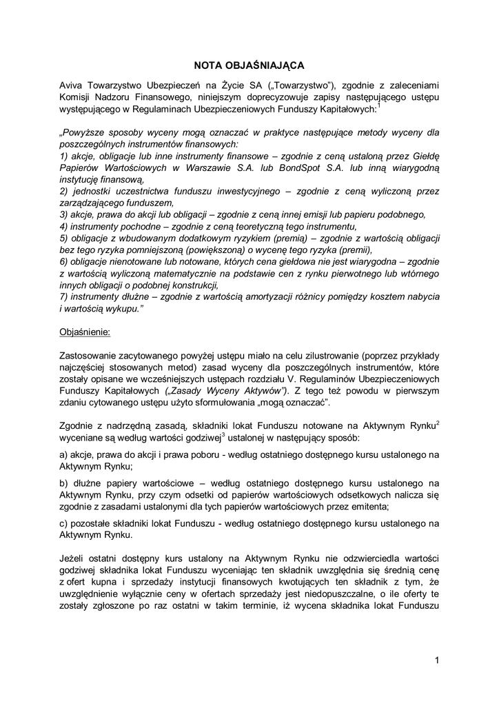 NOTA OBJAŚNIAJĄCA Aviva Towarzystwo Ubezpieczeń na Życie SA („Towarzystwo”), zgodnie z zaleceniami Komisji Nadzoru Finansowego, niniejszym doprecyzowuje zapisy następującego ustępu występującego w Regulaminach Ubezpieczeniowych Funduszy Kapitałowych:1 „Powyższe sposoby wyceny mogą oznaczać w praktyce następujące metody wyceny dla poszczególnych instrumentów finansowych: 1) akcje, obligacje lub inne instrumenty finansowe – zgodnie z ceną ustaloną przez Giełdę Papierów Wartościowych w Warszawie S.A. lub BondSpot S.A. lub inną wiarygodną instytucję finansową, 2) jednostki uczestnictwa funduszu inwestycyjnego – zgodnie z ceną wyliczoną przez zarządzającego funduszem, 3) akcje, prawa do akcji lub obligacji – zgodnie z ceną innej emisji lub papieru podobnego, 4) instrumenty pochodne – zgodnie z ceną teoretyczną tego instrumentu, 5) obligacje z wbudowanym dodatkowym ryzykiem (premią) – zgodnie z wartością obligacji bez tego ryzyka pomniejszoną (powiększoną) o wycenę tego ryzyka (premii), 6) obligacje nienotowane lub notowane, których cena giełdowa nie jest wiarygodna – zgodnie z wartością wyliczoną matematycznie na podstawie cen z rynku pierwotnego lub wtórnego innych obligacji o podobnej konstrukcji, 7) instrumenty dłużne – zgodnie z wartością amortyzacji różnicy pomiędzy kosztem nabycia i wartością wykupu.” Objaśnienie: Zastosowanie zacytowanego powyżej ustępu miało na celu zilustrowanie (poprzez przykłady najczęściej stosowanych metod) zasad wyceny dla poszczególnych instrumentów, które zostały opisane we wcześniejszych ustępach rozdziału V. Regulaminów Ubezpieczeniowych Funduszy Kapitałowych („Zasady Wyceny Aktywów”). Z tego też powodu w pierwszym zdaniu cytowanego ustępu użyto sformułowania „mogą oznaczać”. Zgodnie z nadrzędną zasadą, składniki lokat Funduszu notowane na Aktywnym Rynku2 wyceniane są według wartości godziwej 3 ustalonej w następujący sposób: a) akcje, prawa do akcji i prawa poboru - według ostatniego dostępnego kursu ustalonego na Aktywnym Rynku; b) dłużne papiery wartościowe – według ostatniego dostępnego kursu ustalonego na Aktywnym Rynku, przy czym odsetki od papierów wartościowych odsetkowych nalicza się zgodnie z zasadami ustalonymi dla tych papierów wartościowych przez emitenta; c) pozostałe składniki lokat Funduszu - według ostatniego dostępnego kursu ustalonego na Aktywnym Rynku. Jeżeli ostatni dostępny kurs ustalony na Aktywnym Rynku nie odzwierciedla wartości godziwej składnika lokat Funduszu wyceniając ten składnik uwzględnia się średnią cenę z ofert kupna i sprzedaży instytucji finansowych kwotujących ten składnik z tym, że uwzględnienie wyłącznie ceny w ofertach sprzedaży jest niedopuszczalne, o ile oferty te zostały zgłoszone po raz ostatni w takim terminie, iż wycena składnika lokat Funduszu 1 w oparciu o te oferty odzwierciedla jego wartość godziwą. W szczególności wyceny dokonuje się na podstawie wskaźników: a) Bloomberg Valuation Service, a w przypadku jego braku dla danego składnika lokat Funduszu: b) Bloomberg Generic, a w przypadku jego braku dla danego składnika lokat Funduszu, c) Bondtrader Composite, a w przypadku jego braku dla danego składnika lokat Funduszu, d) średniej z najlepszych obowiązujących ofert kupna i sprzedaży dostępnych w momencie dokonywania wyceny z tym, że uwzględnienie wyłącznie ceny w ofertach sprzedaży jest niedopuszczalne. Użycie w podpunkcie 6) cytowanego ustępu pojęcie „cena giełdowa nie jest wiarygodna” zostało użyte w związku z wymogiem stosowania do wyceny „wartości godziwej” określonej przepisami o rachunkowości. Przykładowo, tak jak opisano powyżej, w niektórych sytuacjach ostatni dostępny kurs ustalony na Aktywnym Rynku może nie odzwierciedlać realnej wartości instrumentu finansowego w portfelu. Skrajnym przypadkiem jest zupełny brak dostępnych notowań na Aktywnym Rynku (przykładowo w sytuacji gdy instrument nigdy nie był notowany na jakimkolwiek Aktywnym Rynku), gdy stosuje się indywidualne metody wyceny lub porównania do instrumentów podobnych (np. w przypadku obligacji „o podobnej konstrukcji” – to jest zapadalności, rentowności (wysokości i częstotliwości kuponu odsetkowego), ryzyku kredytowym emitenta). Użyte w podpunkcie 4) dla instrumentów pochodnych pojęcie „ceny teoretycznej” oznacza właśnie indywidualną wycenę opartą o model matematyczny (kalkulowaną zwykle i publikowaną przez bank emitenta, którą Towarzystwo niezależnie weryfikuje), którą to wycenę Towarzystwo musi zastosować w przypadku braku notowań instrumentu pochodnego na Aktywnym Rynku. 1 Zapis stosowany przez Towarzystwo we wszystkich Regulaminach Ubezpieczeniowych Funduszu Kapitałowych, obowiązujących na dzieo 31 sierpnia 2012 roku, w tym: jako ustęp 9 w Rozdziale V Regulaminu Ubezpieczeniowych Funduszy Kapitałowych (RUFK/NPER/2/2008) dla umów Nowa Perspektywa oraz Kapitalna Przyszłośd; jako ustęp 8 w Rozdziale V Regulaminu Ubezpieczeniowych Funduszy Kapitałowych (RUFK/BVIP/1/2008) dla umów Bonus VIP; jako ustęp 10 w Rozdziale V Regulaminu Ubezpieczeniowych Funduszy Kapitałowych (RUFK/GR/1/2011) dla umów ubezpieczeo grupowych. 2 Definicja Aktywnego Rynku została przytoczona w rozdziale V Regulaminu Ubezpieczeniowych Funduszy Kapitałowych. 3 Zgodnie z przepisami art. 28 ust. 6 Ustawy o rachunkowości, za wartośd godziwą przyjmuje się kwotę, za jaką dany składnik aktywów mógłby zostad wymieniony, a zobowiązanie uregulowane na warunkach transakcji rynkowej, pomiędzy zainteresowanymi i dobrze poinformowanymi, niepowiązanymi ze sobą stronami. Wartośd godziwą instrumentów finansowych znajdujących się w obrocie na aktywnym rynku stanowi cena rynkowa pomniejszona o koszty związane z przeprowadzeniem transakcji, gdyby ich wysokośd była znacząca. Cenę rynkową aktywów finansowych
