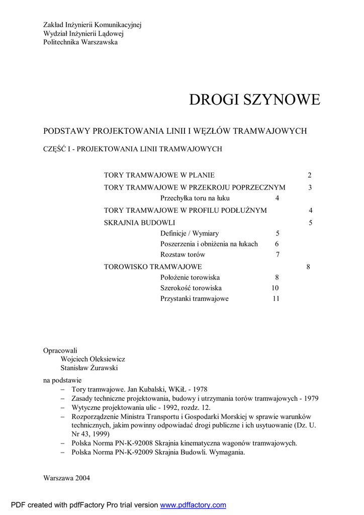 Zakład Inżynierii Komunikacyjnej Wydział Inżynierii Lądowej Politechnika Warszawska DROGI SZYNOWE PODSTAWY PROJEKTOWANIA LINII I WĘZŁÓW TRAMWAJOWYCH CZĘŚĆ I - PROJEKTOWANIA LINII TRAMWAJOWYCH TORY TRAMWAJOWE W PLANIE 2 TORY TRAMWAJOWE W PRZEKROJU POPRZECZNYM Przechyłka toru na łuku 4 3 TORY TRAMWAJOWE W PROFILU PODŁUŻNYM 4 SKRAJNIA BUDOWLI Definicje / Wymiary Poszerzenia i obniżenia na łukach Rozstaw torów 5 TOROWISKO TRAMWAJOWE Położenie torowiska Szerokość torowiska Przystanki tramwajowe 5 6 7 8 8 10 11 Opracowali Wojciech Oleksiewicz Stanisław Żurawski na podstawie − Tory tramwajowe. Jan Kubalski, WKiŁ - 1978 − Zasady techniczne projektowania, budowy i utrzymania torów tramwajowych - 1979 − Wytyczne projektowania ulic - 1992, rozdz. 12. − Rozporządzenie Ministra Transportu i Gospodarki Morskiej w sprawie warunków technicznych, jakim powinny odpowiadać drogi publiczne i ich usytuowanie (Dz. U. Nr 43, 1999) − Polska Norma PN-K-92008 Skrajnia kinematyczna wagonów tramwajowych. − Polska Norma PN-K-92009 Skrajnia Budowli. Wymagania. Warszawa 2004 PDF created with pdfFactory Pro trial version www.pdffactory.com 2 * ZIK IDiM PW * ZIK IDiM PW * ZIK IDiM PW * ZIK IDIM Drogi szynowe. Podstawy projektowania linii i węzłów tramwajowych. Materiały do ćwiczeń. Część I TORY TRAMWAJOWE W PLANIE • • • • • • • • • • • • jak najdłuższe odcinki proste jak najłagodniejsze krzywizny szerokość zasadnicza toru 1435mm lub 1000mm (rozbudowa lub dobudowa) nie stosuje się poszerzenia toru na łukach zalecane promienie łuków na szlaku co najmniej 150 m, minimalne na szlaku 50 m, promienie łuków na skrzyżowaniach ulic i w węzłach rozjazdowych co najmniej 25 m promienie łuków w zajezdniach i torach gospodarczych wyjątkowo 20 m normalne promienie łuków 25 do 35 m, 50 m, 75 m, 100 m, 150 m, 200 m, 300 m i większe dla R<150m stosuje się wyłącznie szyny rowkowe w przypadku jednoczesnego występowania łuku pionowego i łuku w planie minimalny promień łuku w planie wynosi 200 m w torze na łuku poziomym stosuje się przechyłkę na szlaku dla R<100m stosuje się krzywe przejściowe w postaci łuków o wzrastających promieniach lub paraboli 3-stopnia promień zasadniczy Rz R = 25 – 35 m R = 50 m R = 75 m promienie łuków przejściowych, wartości kątów i długości łuków przejściowych (po osi toru) R2 = 50 m; α2 = 6˚; l2 = 5,236 m R1 = 100 m; α1 = 3˚; l1 = 5,236 m --R = 100 m; α1 = 3˚; l = 5,236 m --R = 150 m; α1 = 1,5˚; l = 5,236 m parametry krzywej przejściowej jako paraboli 3-stopnia x3 C ; C = 250÷1000; l = y= R 6 ⋅C y x Proste i łuki łuki z przechyłką dwie rampy przechyłkowe łuki bez przechyłki wstawka prosta = 0 >= 20 m, jednak zdecydowanie długie • w torach stacyjnych, zajezdniowych i gospodarczych dopuszcza się łuki odwrotne o promieniu 50 m bez wstawek prostych • na skrzyżowaniach ulic i w węzłach rozjazdowych dla R = 25 – 35 m stosuje się łuki przejściowe o promieniu 50 m i kącie środkowym 6˚ Opracowali: W. Oleksiewicz, S. Żurawski Na podstawie: Tory tramwajowe. J. Kubalski, WKiŁ 1978; Zasady techniczne projektowania, budowy i utrzymania torów tramwajowych, 1979; Wytyczne projektowania ulic, rozdz. 12, 1992; Warunki techniczne, jakim powinny odpowiadać drogi publiczne i ich usytuowanie .Dz.U.Nr 43/1999; PN-K-92008 Skrajnia kinematyczna wagonów tramwajowych. 1998; PN-K-92009 Skrajnia budowli. Wymagania. 1998 PDF created with pdfFactory Pro trial version www.pdffactory.com 3 * ZIK IDiM PW * ZIK IDiM PW * ZIK IDiM PW * ZIK IDIM Drogi szynowe. Podstawy projektowania linii i węzłów tramwajowych. Materiały do ćwiczeń. Część I TORY TRAMWAJOWE W PRZEKROJU POPRZECZNYM Na odcinkach prostych torowisko wydzielone torowisko wspólne z jezdnią pochyl. poprz. jezdni < 15mm (1435) < 10mm (1000) poziom Przechyłki toru na łuku • • • • • • • w torze wydzielonym na łuku stosuje się przechyłkę h=8v2/R (normalna) w torze wspólnym z jezdnią na łuku stosuje się przechyłkę minimalną maksymalne stosowane wartości przechyłki 150 mm dla toru 1435mm i 100 mm dla toru 1000mm wartości przechyłek przyjmujemy zgodnie z tabelą przechyłek (wg Zasad technicznych projektowania, budowy i utrzymania torów tramwajowych) rampy przechyłkowe stosujemy o pochyleniach 1:300 przechyłkę uzyskuje się przez podniesienie toku zewnętrznego na długości rampy przechyłkowej wyjątkowo po ½ wartości przechyłki podnosi się tok zewnętrzny i opuszcza tok wewnętrzny na długości ½ długości rampy przechyłkowej Tabela wielkości przechyłek na torach tramwajowych o szerokości 1435 mm wielkość przechyłek podano w mm, wartości minimalne przechyłek podano w nawiasach, maksymalna przechyłka wynosi 150 mm promień łuku R [m] 10 27 25 51 20 45 (70) 128 (34) 107 (20) 91 (20) 80 36 54 (87) 143 (60) 125 (20) 100 24 43 67 32 50 (87) 144 (30) 96 (20) 72 20 33 48 (59) 128 (20) 85 25 36 64 (62) 133 (20) 100 24 43 67 (72) 144 (20) 96 32 50 72 (43) 131 (20) 98 25 40 58 78 27 38 52 20 29 39 <20 44 20 40 25 32 30 35 40 20 25 prędkość [km/h] 30 40 15 (25) 100 (20) 90 (20) 72 (20) 60 50 60 (148) 70 (114) 50 (123) 75 100 (143) 150 (140) 200 300 400 (149) 500 750 1000 2000 20 Opracowali: W. Oleksiewicz, S. Żurawski Na podstawie: Tory tramwajowe. J. Kubalski, WKiŁ 1978; Zasady techniczne projektowania, budowy i utrzymania torów tramwajowych, 1979; Wytyczne projektowania ulic, rozdz. 12, 1992; Warunki techniczne, jakim powinny odpowiadać drogi publiczne i ich usytuowanie .Dz.U.Nr 43/1999; PN-K-92008 Skrajnia kinematyczna wagonów tramwajowych. 1998; PN-K-92009 Skrajnia budowli. Wymagania. 1998 PDF created with pdfFactory Pro trial version www.pdffactory.com 4 * ZIK IDiM PW * ZIK IDiM PW * ZIK IDiM PW * ZIK IDIM Drogi szynowe. Podstawy projektowania linii i węzłów tramwajowych. Materiały do ćwiczeń. Część I TORY TRAMWAJOWE W PROFILU PODŁUŻNYM Pochylenia podłu