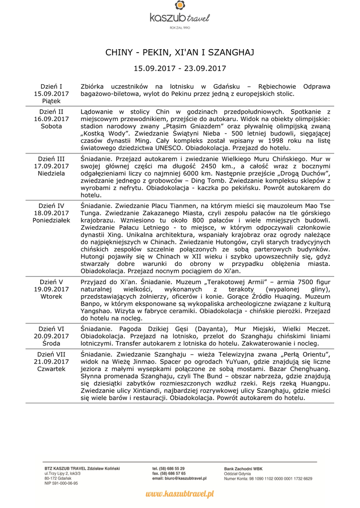 CHINY - PEKIN, XI'AN I SZANGHAJ 15.09.2017 - 23.09.2017 Dzień I 15.09.2017 Piątek Zbiórka uczestników na lotnisku w Gdańsku – Rębiechowie bagażowo-biletowa, wylot do Pekinu przez jedną z europejskich stolic. Odprawa Dzień II 16.09.2017 Sobota Lądowanie w stolicy Chin w godzinach przedpołudniowych. Spotkanie z miejscowym przewodnikiem, przejście do autokaru. Widok na obiekty olimpijskie: stadion narodowy zwany „Ptasim Gniazdem” oraz pływalnię olimpijską zwaną „Kostką Wody”. Zwiedzanie Świątyni Nieba - 500 letniej budowli, sięgającej czasów dynastii Ming. Cały kompleks został wpisany w 1998 roku na listę światowego dziedzictwa UNESCO. Obiadokolacja. Przejazd do hotelu. Dzień III 17.09.2017 Niedziela Śniadanie. Przejazd autokarem i zwiedzanie Wielkiego Muru Chińskiego. Mur w swojej głównej części ma długość 2450 km., a całość wraz z bocznymi odgałęzieniami liczy co najmniej 6000 km. Następnie przejście „Drogą Duchów”, zwiedzanie jednego z grobowców – Ding Tomb. Zwiedzanie kompleksu sklepów z wyrobami z nefrytu. Obiadokolacja - kaczka po pekińsku. Powrót autokarem do hotelu. Dzień IV 18.09.2017 Poniedziałek Śniadanie. Zwiedzanie Placu Tianmen, na którym mieści się mauzoleum Mao Tse Tunga. Zwiedzanie Zakazanego Miasta, czyli zespołu pałaców na tle górskiego krajobrazu. Wzniesiono tu około 800 pałaców i wiele mniejszych budowli. Zwiedzanie Pałacu Letniego - to miejsce, w którym odpoczywali członkowie dynastii Xing. Unikalna architektura, wspaniały krajobraz oraz ogrody należące do najpiękniejszych w Chinach. Zwiedzanie Hutongów, czyli starych tradycyjnych chińskich zespołów szczelnie połączonych ze sobą parterowych budynków. Hutongi pojawiły się w Chinach w XII wieku i szybko upowszechniły się, gdyż stwarzały dobre warunki do obrony w przypadku oblężenia miasta. Obiadokolacja. Przejazd nocnym pociągiem do Xi'an. Dzień V 19.09.2017 Wtorek Przyjazd do Xi'an. Śniadanie. Muzeum „Terakotowej Armii” – armia 7500 figur naturalnej wielkości, wykonanych z terakoty (wypalonej gliny), przedstawiających żołnierzy, oficerów i konie. Gorące Źródło Huaqing. Muzeum Banpo, w którym eksponowane są wykopaliska archeologiczne związane z kulturą Yangshao. Wizyta w fabryce ceramiki. Obiadokolacja - chińskie pierożki. Przejazd do hotelu na nocleg. Dzień VI 20.09.2017 Środa Śniadanie. Pagoda Dzikiej Gęsi (Dayanta), Mur Miejski, Wielki Meczet. Obiadokolacja. Przejazd na lotnisko, przelot do Szanghaju chińskimi liniami lotniczymi. Transfer autokarem z lotniska do hotelu. Zakwaterowanie i nocleg. Dzień VII 21.09.2017 Czwartek Śniadanie. Zwiedzanie Szanghaju – wieża Telewizyjna zwana „Perłą Orientu”, widok na Wieżę Jinmao. Spacer po ogrodach YuYuan, gdzie znajdują się liczne jeziora z małymi wysepkami połączone ze sobą mostami. Bazar Chenghuang. Słynna promenada Szanghaju, czyli The Bund – obszar nabrzeża, gdzie znajdują się dziesiątki zabytków rozmieszczonych wzdłuż rzeki. Rejs rzeką Huangpu. Zwiedzanie ulicy Xintiandi, najbardziej rozrywkowej ulicy Szanghaju, gdzie mieści się wiele barów i restauracji. Obiadokolacja. Powrót autokarem do hotelu. Dzień VIII 22.09.2017 Piątek Śniadanie. Zwiedzanie Muzeum Szanghajskiego oraz Świątyni Nefrytowego Buddy. Jest to jedna z niewielu buddyjskich świątyń w Szanghaju. W świątyni znajduje się wysoki na 2 metry posąg Buddy bogato zdobiony złotem i klejnotami. Wizyta w sklepie z wyrobami z jedwabiu – Jiangnan. Tianzifang – ośrodek, gdzie można zobaczyć, jak Szanghaj wyglądał kiedyś: wąskie urokliwe uliczki, sklepy, restauracje, herbaciarnie a wszystko mieszczące się w niesamowitych, starych chińskich budynkach. Zwiedzanie i zakupy na słynnej ulicy Nankińskiej. Powrót do hotelu. Obiadokolacja w stylu mongolskim. Dzień IX 23.09.2017 Sobota Śniadanie. Transfer autokarowy na lotnisko. Odprawa bagażowo-biletowa. Wylot do Gdańska przez jedną z europejskich stolic. Lądowanie w Gdańsku – Rębiechowie. Zakończenie wyjazdu. CENA: 1150 USD + bilet lotniczy ŚWIADCZENIA: • przelot samolotem na trasie: Polska-Chiny-Polska • transport autokarem lub busem klimatyzowanym • bilety wstępów do zwiedzanych obiektów • noclegi w hotelach **** wg norm lokalnych, pokoje 2 - osobowe z WC i łazienką • śniadania (szwedzki stół) • obiadokolacje (poza hotelem, serwowane) • opieka pilota i przewodnika • ubezpieczenie NW i Kl i bagażu w Signal Iduna - wariant podstawowy (nie obejmuje chorób przewlekłych • bilety na pociąg na trasie: Pekin-Xi'an • przelot samolotem na trasie: Xi’an-Szanghaj CENA NIE ZAWIERA: UWAGI: • zastrzega się możliwość zmiany kolejności zwiedzanych • organizator nie odpowiada za nieprzewidziane zmiany niezależne od niego • cena nie zawiera wizy chińskiej (ok. 350 zł) • cena nie obejmuje wizy, napiwków dla kierowcy i przewodników lokalnych (standardy lokalne, 4 $/dzień), • należy posiadać ważny paszport – minimum 6 miesięcy od daty powrotu!