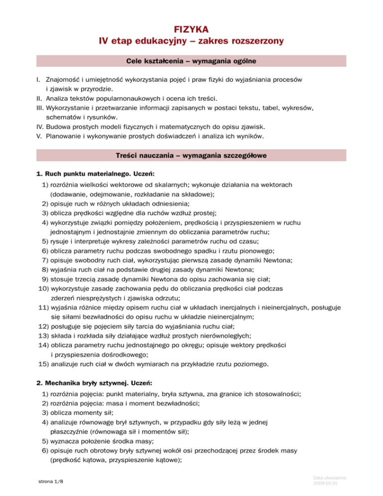FIZYKA IV etap edukacyjny – zakres rozszerzony Cele kształcenia – wymagania ogólne I. Znajomość i umiejętność wykorzystania pojęć i praw fizyki do wyjaśniania procesów i zjawisk w przyrodzie. II. Analiza tekstów popularnonaukowych i ocena ich treści. III.Wykorzystanie i przetwarzanie informacji zapisanych w postaci tekstu, tabel, wykresów, schematów i rysunków. IV.Budowa prostych modeli fizycznych i matematycznych do opisu zjawisk. V. Planowanie i wykonywanie prostych doświadczeń i analiza ich wyników. Treści nauczania – wymagania szczegółowe 1. Ruch punktu materialnego. Uczeń: 1) rozróżnia wielkości wektorowe od skalarnych; wykonuje działania na wektorach (dodawanie, odejmowanie, rozkładanie na składowe); 2) opisuje ruch w różnych układach odniesienia; 3) oblicza prędkości względne dla ruchów wzdłuż prostej; 4) wykorzystuje związki pomiędzy położeniem, prędkością i przyspieszeniem w ruchu jednostajnym i jednostajnie zmiennym do obliczania parametrów ruchu; 5) rysuje i interpretuje wykresy zależności parametrów ruchu od czasu; 6) oblicza parametry ruchu podczas swobodnego spadku i rzutu pionowego; 7) opisuje swobodny ruch ciał, wykorzystując pierwszą zasadę dynamiki Newtona; 8) wyjaśnia ruch ciał na podstawie drugiej zasady dynamiki Newtona; 9) stosuje trzecią zasadę dynamiki Newtona do opisu zachowania się ciał; 10) wykorzystuje zasadę zachowania pędu do obliczania prędkości ciał podczas zderzeń niesprężystych i zjawiska odrzutu; 11) wyjaśnia różnice między opisem ruchu ciał w układach inercjalnych i nieinercjalnych, posługuje się siłami bezwładności do opisu ruchu w układzie nieinercjalnym; 12) posługuje się pojęciem siły tarcia do wyjaśniania ruchu ciał; 13) składa i rozkłada siły działające wzdłuż prostych nierównoległych; 14) oblicza parametry ruchu jednostajnego po okręgu; opisuje wektory prędkości i przyspieszenia dośrodkowego; 15) analizuje ruch ciał w dwóch wymiarach na przykładzie rzutu poziomego. 2. Mechanika bryły sztywnej. Uczeń: 1) rozróżnia pojęcia: punkt materialny, bryła sztywna, zna granice ich stosowalności; 2) rozróżnia pojęcia: masa i moment bezwładności; 3) oblicza momenty sił; 4) analizuje równowagę brył sztywnych, w przypadku gdy siły leżą w jednej płaszczyźnie (równowaga sił i momentów sił); 5) wyznacza położenie środka masy; 6) opisuje ruch obrotowy bryły sztywnej wokół osi przechodzącej przez środek masy (prędkość kątowa, przyspieszenie kątowe); strona 1/8 Data utworzenia: 2009-10-31 7) analizuje ruch obrotowy bryły sztywnej pod wpływem momentu sił; 8) stosuje zasadę zachowania momentu pędu do analizy ruchu; 9) uwzględnia energię kinetyczną ruchu obrotowego w bilansie energii. 3. Energia mechaniczna. Uczeń: 1) oblicza pracę siły na danej drodze; 2) oblicza wartość energii kinetycznej i potencjalnej ciał w jednorodnym polu grawitacyjnym; 3) wykorzystuje zasadę zachowania energii mechanicznej do obliczania parametrów ruchu; 4) oblicza moc urządzeń, uwzględniając ich sprawność; 5) stosuje zasadę zachowania energii oraz zasadę zachowania pędu do opisu zderzeń sprężystych i niesprężystych. 4. Grawitacja. Uczeń: 1) wykorzystuje prawo powszechnego ciążenia do obliczenia siły oddziaływań grawitacyjnych między masami punktowymi i sferycznie symetrycznymi; 2) rysuje linie pola grawitacyjnego, rozróżnia pole jednorodne od pola centralnego; 3) oblicza wartość i kierunek pola grawitacyjnego na zewnątrz ciała sferycznie symetrycznego; 4) wyprowadza związek między przyspieszeniem grawitacyjnym na powierzchni planety a jej masą i promieniem; 5) oblicza zmiany energii potencjalnej grawitacji i wiąże je z pracą lub zmianą energii kinetycznej; 6) wyjaśnia pojęcie pierwszej i drugiej prędkości kosmicznej; oblicza ich wartości dla różnych ciał niebieskich; 7) oblicza okres ruchu satelitów (bez napędu) wokół Ziemi; 8) oblicza okresy obiegu planet i ich średnie odległości od gwiazdy, wykorzystując III prawo Keplera dla orbit kołowych; 9) oblicza masę ciała niebieskiego na podstawie obserwacji ruchu jego satelity. 5. Termodynamika. Uczeń: 1) wyjaśnia założenia gazu doskonałego i stosuje równanie gazu doskonałego (równanie Clapeyrona) do wyznaczenia parametrów gazu; 2) opisuje przemianę izotermiczną, izobaryczną i izochoryczną; 3) interpretuje wykresy ilustrujące przemiany gazu doskonałego; 4) opisuje związek pomiędzy temperaturą w skali Kelwina a średnią energią kinetyczną cząsteczek; 5) stosuje pierwszą zasadę termodynamiki, odróżnia przekaz energii w formie pracy od przekazu energii w formie ciepła; 6) oblicza zmianę energii wewnętrznej w przemianach izobarycznej i izochorycznej oraz pracę wykonaną w przemianie izobarycznej; 7) posługuje się pojęciem ciepła molowego w przemianach gazowych; 8) analizuje pierwszą zasadę termodynamiki jako zasadę zachowania energii; 9) interpretuje drugą zasadę termodynamiki; 10) analizuje przedstawione cykle termodynamiczne, oblicza sprawność silników cieplnych w oparciu o wymieniane ciepło i wykonaną pracę; 11) odróżnia wrzenie od parowania powierzchniowego; analizuje wpływ ciśnienia na temperaturę wrzenia cieczy; 12) wykorzystuje pojęcie ciepła właściwego oraz ciepła przemiany fazowej w analizie bilansu cieplnego. strona 2/8 Data utworzenia: 2009-10-31 6. Ruch harmoniczny i fale mechaniczne. Uczeń: 1) analizuje ruch pod wpływem sił) sprężystych (harmonicznych), podaje przykłady takiego ruchu; 2) oblicza energię potencjalną sprężystości; 3) oblicza okres drgań ciężarka na sprężynie i wahadła matematycznego; 4) interpretuje wykresy zależności położenia, prędkości i przyspieszenia od czasu w ruchu drgającym; 5) opisuje drgania wymuszone; 6) opisuje zjawisko rezonansu mechanicznego na wybranych przykładach; 7) stosuje zasadę zachowania energii w ruchu drgającym