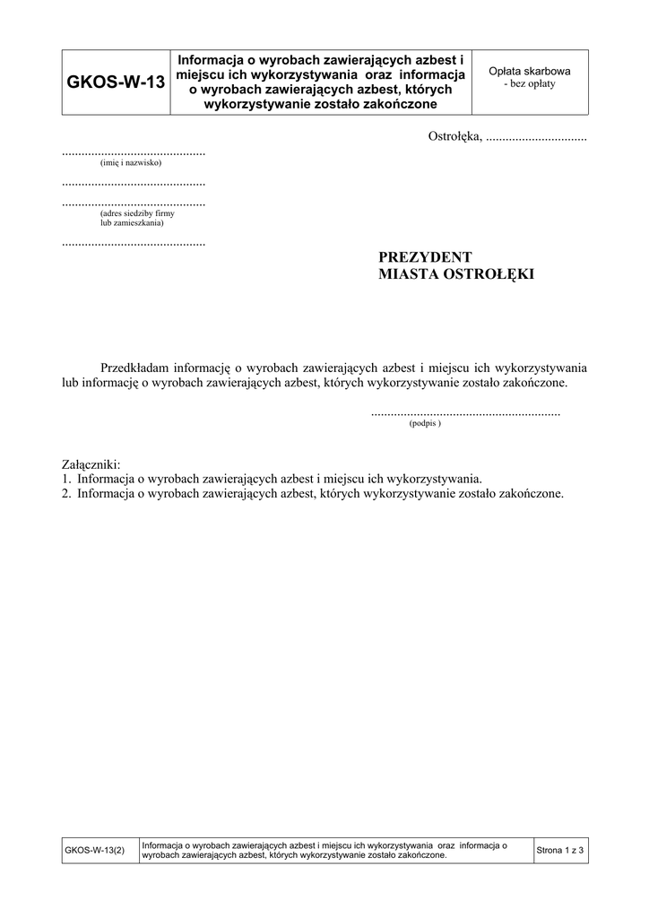 GKOS-W-13 Informacja o wyrobach zawierających azbest i miejscu ich wykorzystywania oraz informacja o wyrobach zawierających azbest, których wykorzystywanie zostało zakończone ............................................ Opłata skarbowa - bez opłaty Ostrołęka, ............................... (imię i nazwisko) ............................................ ............................................ (adres siedziby firmy lub zamieszkania) ............................................ PREZYDENT MIASTA OSTROŁĘKI Przedkładam informację o wyrobach zawierających azbest i miejscu ich wykorzystywania lub informację o wyrobach zawierających azbest, których wykorzystywanie zostało zakończone. .......................................................... (podpis ) Załączniki: 1. Informacja o wyrobach zawierających azbest i miejscu ich wykorzystywania. 2. Informacja o wyrobach zawierających azbest, których wykorzystywanie zostało zakończone. GKOS-W-13(2) Informacja o wyrobach zawierających azbest i miejscu ich wykorzystywania oraz informacja o wyrobach zawierających azbest, których wykorzystywanie zostało zakończone. Strona 1 z 3 Wzór Informacja o wyrobach zawierających azbest1) i miejscu ich wykorzystywania. 1. Miejsce, adres ........................................................................................................................................ ........................................................................................................................................ 2. właściciel /zarządca/ użytkownik*): a) osoba prawna – nazwa, adres ................................................................................ ................................................................................................................................. b) osoba fizyczna – imię, nazwisko i adres ................................................................ ................................................................................................................................. 3. Tytuł własności ........................................................................................................... ..................................................................................................................................... 4. Nazwa, rodzaj wyrobu2) ............................................................................................... .................................................................................................................................... 5. Ilość (m2, tony)3) ........................................................................................................... 6. Przydatność do dalszej eksploatacji4) .......................................................................... a) okresowej wymiany z tytułu zużycia wyrobu5) b) całkowitego usunięcia niebezpiecznych materiałów i substancji ............................ ................................................................................................................................... 7. Inne istotne informacje o wyrobach6) ...................................................................................................................................... ...................................................................................................................................... .................................................. (podpis) ....................................... Data Objaśnienia: *) Niepotrzebne skreślić 1) Za wyrób zawierający azbest uważa się każdy wyrób o stężeniu równym lub wyższym od 0,1% azbestu. 2) Przy określaniu rodzaju wyrobu zawierającego azbest należy stosować następującą klasyfikację: – płyty azbestowo-cementowe płaskie stosowane w budownictwie, – płyty faliste azbestowo-cementowe dla budownictwa, – rury i złącza azbestowo-cementowe, – izolacje natryskowe środkami zawierającymi w swoim składzie azbest, – wyroby cierne azbestowo-kauczukowe, – przędza specjalna, w tym włókna azbestowe obrobione, – szczeliwa azbestowe, – taśmy tkane i plecione, sznury i sznurki, – wyroby azbestowo-kauczukowe, z wyjątkiem wyrobów ciernych, – papier, tektura, – inne wyroby zawierające azbest, oddzielnie niewymienione, w tym papier i tektura. 3) Podać podstawę zapisu (np. dokumentacja techniczna, pomiar z natury). 4) Według „Oceny stanu i możliwości bezpiecznego użytkowania wyrobów zawierających azbest” - załącznik nr 1 do rozporządzenia ministra właściwego do spraw gospodarki w sprawie sposobów bezpiecznego użytkowania oraz warunków usuwania wyrobów zawierających azbest. 5) Na podstawie corocznego rozporządzenia ministra właściwego do spraw gospodarki w sprawie dopuszczenia wyrobów zawierających azbest do produkcji lub do wprowadzania na polski obszar celny. 6) Np. informacja o oznaczeniu na planie sytuacyjnym terenu instalacji lub urządzenia zawierającego azbest. GKOS-W-13(2) Informacja o wyrobach zawierających azbest i miejscu ich wykorzystywania oraz informacja o wyrobach zawierających azbest, których wykorzystywanie zostało zakończone. Strona 2 z 3 Wzór Informacja o wyrobach zawierających azbest1), których wykorzytywanie zostało zakończone. 1. Miejsce, adres ........................................................................................................................................ ........................................................................................................................................ 2. właściciel /zarządca/ użytkownik*): a) osoba prawna – nazwa, adres ................................................................................ ................................................................................................................................. b) osoba fizyczna – imię, nazwisko i adres ................................................