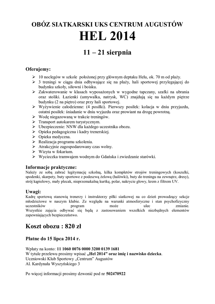 OBÓZ SIATKARSKI UKS CENTRUM AUGUSTÓW HEL 2014 11 – 21 sierpnia Oferujemy: 10 noclegów w szkole położonej przy głównym deptaku Helu, ok. 70 m od plaży. 3 treningi w ciągu dnia odbywające się na plaży, hali sportowej przylegającej do budynku szkoły, siłowni i boisku. Zakwaterowanie w klasach wyposażonych w wygodne tapczany, szafki na ubrania oraz stoliki. Łazienki (umywalka, natrysk, WC) znajdują się na każdym piętrze budynku (2 na piętro) oraz przy hali sportowej. Wyżywienie całodzienne: (4 posiłki). Pierwszy posiłek: kolacja w dniu przyjazdu, ostatni posiłek: śniadanie w dniu wyjazdu oraz prowiant na drogę powrotną. Wodę niegazowaną w trakcie treningów. Transport autokarem turystycznym. Ubezpieczenie: NNW dla każdego uczestnika obozu. Opieka pedagogiczna i kadry trenerskiej. Opieka medyczna. Realizacja programu szkolenia. Atrakcyjnie zagospodarowany czas wolny. Wizyta w fokarium. Wycieczka tramwajem wodnym do Gdańska i zwiedzanie starówki. Informacje praktyczne: Należy ze sobą zabrać legitymację szkolną, kilka kompletów strojów treningowych (koszulki, spodenki, skarpety, buty sportowe z podeszwą żelową (halówki), buty do treningu na zewnątrz, dresy), strój kąpielowy, mały plecak, nieprzemakalną kurtkę, polar, nakrycie głowy, krem z filtrem UV. Uwagi: Kadrę sportową stanowią trenerzy i instruktorzy piłki siatkowej na co dzień prowadzący sekcje młodzieżowe w naszym klubie. Ze względu na warunki atmosferyczne i stan psychofizyczny uczestników program może ulec zmianie. Wszystkie zajęcia odbywać się będą z zastosowaniem wszelkich niezbędnych elementów zapewniających bezpieczeństwo. Koszt obozu : 820 zł Płatne do 15 lipca 2014 r. Wpłaty na konto: 11 1060 0076 0000 3200 0139 1681 W tytule przelewu prosimy wpisać „Hel 2014” oraz imię i nazwisko dziecka. Uczniowski Klub Sportowy „Centrum” Augustów Al. Kardynała Wyszyńskiego 3 Po więcej informacji prosimy dzwonić pod nr 502470922 Największe atrakcje Helu w wakacje: dwie piękne helskie plaże - zatokowa i morska, fokarium, rejsy wycieczkowe statkami, tramwaj wodny do Trójmiasta, latarnia morska, muzeum rybołówstwa w Helu, port rybacki, muzeum obrony wybrzeża, wrak kutra łącznikowego „Bryza” K-18, korty tenisowe, nurkowanie, wędkarstwo i wiele innych, codzienne darmowe dyskoteki dla dzieci i dorosłych z konkursami i nagrodami na helskim bulwarze organizowane przez Urząd Miasta w Helu, imprezy letnie: Festiwal Muzyki Kameralnej, inscenizacja walk w Normandii D-Day Hell, Święto Ryby, Sobótka, turniej piłki plażowej oraz turniej poławiania bursztynu. Jadłospis I TYDZIEŃ PONIEDZIAŁEK ŚNIADANIE OBIAD KOLACJA WTOREK Wędlina, ser Pasztet, żółty, ogórek, twarożek, płatki na mleku – pomidor, czekoladowe i pieczywo, masło, kukurydziane, dżem, herbata, pieczywo, masło, kakao. dżem, herbata. Kalafiorowa, pulpety w sosie koperkowym, surówka z marchwi, ziemniaki, kompot. ŚRODA Wędlina, serek topiony, pomidor, płatki na mleku – czekoladowe i kukurydziane, pieczywo, masło, dżem, herbata. Kapuśniak, Rosół, kotlet z gulasz z drobiu, mizeria, warzywami, ziemniaki, surówka z pora, kompot. ryż, kompot, CZWARTEK Jajko gotowane, wędlina, ogórek, pieczywo, masło, dżem, herbata, kakao. Koperkowa, rumsztyk z cebulą, ogórek małosolny, ziemniaki, kompot. PIĄTEK SOBOTA NIEDZIELA Ser żółty, wędlina, Jajecznica, pomidor, płatki Parówka, serek wędlina na mleku – topiony, ogórek ,pomidor, czekoladowe lub św., masło, szczypiorek, kukurydziane, dżem, herbata, pieczywo, pieczywo, kakao. masło, dżem, masło, dżem, herbata, kakao. herbata. Jarzynowa, makaron z truskawkami i śmietaną, kompot. Ryżanka, udko z Pomidorowa, kurczaka, kotlet schabowy, marchewka z surówka z groszkiem, kapusty, ziemniaki, ziemniaki, kompot. kompot. Fasolka po Kiełbasa z wody, Wędlina, ser Wędlina, bretońsku, Leczo, pomidor, pomidor, ogórek żółty, serek Bigos, pomidor, twarożek, Wędlina, ser twarożek ogórek św., św., ketchup, wiejski, ogórek, ogórek św., pomidor, ogórek żółty, pomidor, wiejski, pieczywo, musztarda, dżem, pomidor, pieczywo, masło, św., pieczywo, pieczywo, masło pomidor, ogórek masło, dżem, masło, pieczywo, pieczywo, masło, dżem, herbata masło, dżem, , dżem, herbata. św., pieczywo, herbata. herbata. dżem, herbata. herbata. masło, dżem, herbata. II TYDZIEŃ PONIEDZIAŁEK ŚNIADANIE Wędlina, ser żółty, płatki na mlekuczekoladowe lub kukurydziane, pieczywo, masło, dżem, herbata. OBIAD Neapolitanka, kotlet mielony, fasolka szparagowa, ziemniaki, kompot. KOLACJA WTOREK ŚRODA Jajko gotowane, wędlina, Wędlina, serek pomidor, płatki wiejski, pomidor, na mleku – pieczywo, masło, czekoladowe lub dżem, herbata, kukurydziane, kakao. pieczywo, masło, dżem, herbata. CZWARTEK PIĄTEK SOBOTA NIEDZIELA Wędlina, twarożek, pomidor, Wędlina, ser Jajecznica, Parówka, ser szczypiorek, żółty, pomidor, szczypiorek, ser żółty, pomidor, płatki na mleku ogórek św., żółty, pomidor, ketchup, – czekoladowe pieczywo, masło, pieczywo, pieczywo, lub dżem, herbata, masło, dżem, masło, dżem, kukurydziane, kakao. herbata, kakao. herbata, kakao. pieczywo, masło, dżem, herbata. Ogórkowa z Krupnik, pierogi Zupa wiosenna, Żurek, kotlet Barszcz ryżem, zrazy z mięsem, pierś z kury, rybny, surówka z czerwony, mielone w sosie, surówka z surówka z pory, kapusty, gulasz, kasza, ziemniaki, marchwi, ziemniaki, ziemniaki, ogórek kiszony, buraczki, kompot. kompot. kompot. kompot. kompot. Kiełbasa z Wędlina, serek rusztu, pomidor, Serek topiony, Pasztet, ser Bigos, pomidor, topiony, ogórek ser żółty, pasztet, ogórek żółty, pomidor, ogórek św., św., masło, musztarda, św., pieczywo, pieczywo, pieczywo, masło, pieczywo, ketchup, masło, dżem, masło, dżem, dżem, herbata. herbata. pieczywo, masło, herbata. herbata. dżem, herbata. Naleśniki z twarogiem, pomidor, pieczywo,