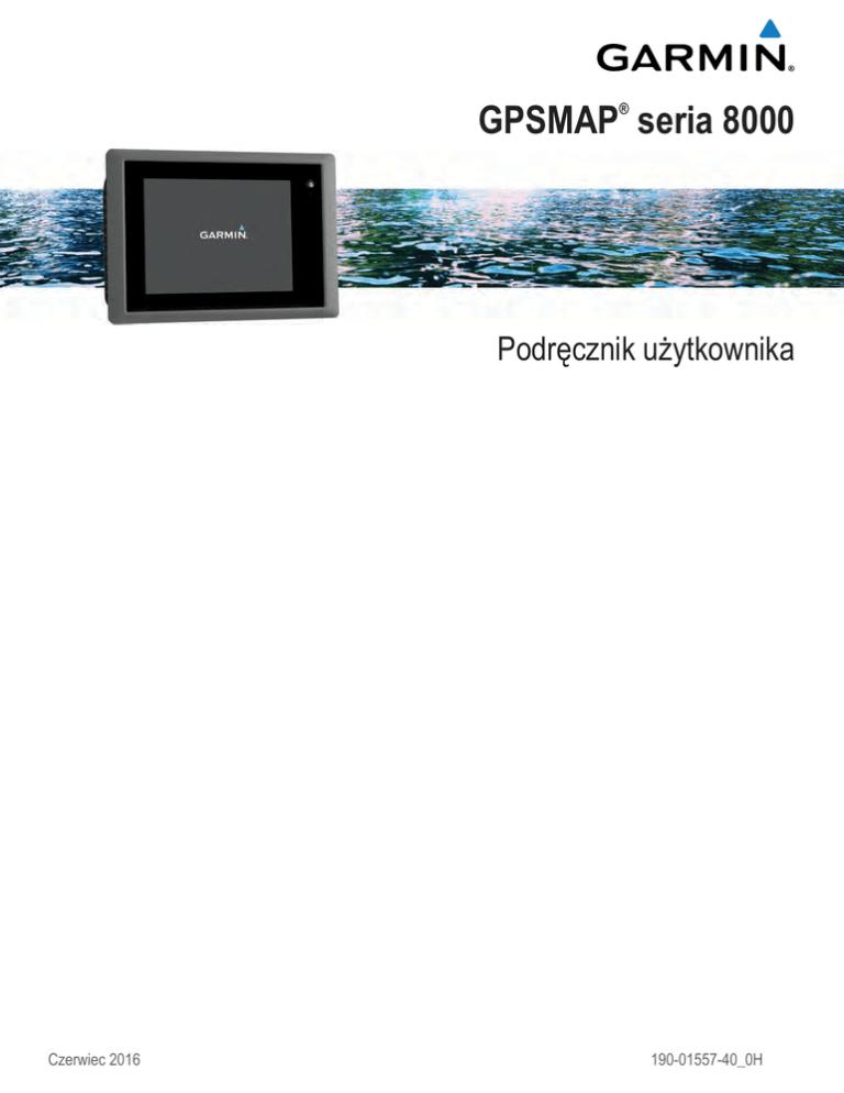 GPSMAP seria 8000 ® Podręcznik użytkownika Czerwiec 2016 190-01557-40_0H Wszelkie prawa zastrzeżone. Zgodnie z prawami autorskimi, kopiowanie niniejszego podręcznika użytkownika w całości lub częściowo bez pisemnej zgody firmy Garmin jest zabronione. Firma Garmin zastrzega sobie prawo do wprowadzenia zmian, ulepszeń do produktów lub ich zawartości niniejszego podręcznika użytkownika bez konieczności powiadamiania o tym jakiejkolwiek osoby lub organizacji. Odwiedź stronę internetową www.garmin.com, aby pobrać bieżące aktualizacje i informacje uzupełniające dotyczące użytkowania niniejszego produktu. Garmin , logo Garmin, BlueChart , g2 Vision , GPSMAP , FUSION , Ultrascroll oraz VIRB są znakami towarowymi firmy Garmin Ltd. lub jej oddziałów zarejestrowanymi w Stanach Zjednoczonych i innych krajach. Fantom™, FUSION-Link™, Garmin Helm™, Garmin LakeVü™, Garmin Nautix™, Garmin Quickdraw™, GCV™, GMR™, GRID™, GXM™, HomePort™, MotionScope™, Panoptix™, quatix , Shadow Drive™ oraz SmartMode™ są znakami towarowymi firmy Garmin Ltd. lub jej oddziałów. Wykorzystywanie tych znaków bez wyraźnej zgody firmy Garmin jest zabronione. ® ® ® ® ® ® ® ® Android™ jest znakiem towarowym firmy Google™ Inc. CZone™ jest znakiem towarowym firmy Power Products, LLC. FLIR jest zarejestrowanym znakiem towarowym firmy FLIR Systems, Inc. Logo SDHC jest znakiem towarowym firmy SD-3C, LLC. SiriusXM jest zastrzeżonym znakiem towarowym firmy SiriusXM Radio Inc. Wi‑Fi jest zastrzeżonym znakiem towarowym firmy Wi-Fi Alliance Corporation. Windows jest zastrzeżonym znakiem towarowym firmy Microsoft Corporation w Stanach Zjednoczonych i w innych krajach. Wszystkie pozostałe znaki towarowe i prawa autorskie stanowią własność poszczególnych jednostek. ® ® ® ® Spis treści Wstęp............................................................................... 1 Ogólne informacje o urządzeniu ................................................. 1 Korzystanie z ekranu dotykowego ......................................... 1 Przyciski na ekranie ............................................................... 1 Porady i skróty ....................................................................... 1 Blokowanie ekranu dotykowego ............................................ 1 Uzyskiwanie dostępu do podręcznika użytkownika w ploterze nawigacyjnym ............................................................................. 1 Pobieranie podręczników użytkownika ....................................... 1 Źródła dodatkowych informacji ................................................... 1 Wkładanie karty pamięci ............................................................. 1 Aktualizacja oprogramowania ..................................................... 2 Ładowanie nowego oprogramowania na kartę pamięci ......... 2 Aktualizacja oprogramowania urządzenia ............................. 2 Sygnały satelitarne GPS ............................................................. 2 Wybór źródła GPS ................................................................. 2 Dostosowywanie plotera nawigacyjnego.................... 2 Ekran główny .............................................................................. 2 Dodawanie pozycji do Ulubionych ......................................... 2 Dostosowywanie stron ................................................................ 2 Dostosowywanie układu trybu SmartMode lub strony kombinacji .............................................................................. 2 Dodawanie układu SmartMode .............................................. 3 Dodawanie własnego ekranu kombinacji ............................... 3 Dostosowywanie nakładek danych ........................................ 3 Resetowanie układów stacji ................................................... 3 Zapamiętane ustawienia ............................................................. 3 Zapisywanie nowego zapamiętanego ustawienia .................. 3 Zarządzanie zapamiętanymi ustawieniami ............................ 3 Ustawianie typu jednostki ........................................................... 3 Regulowanie podświetlenia ........................................................ 4 Dostosowywanie schematu kolorów ........................................... 4 Mapy i widoki map 3D.................................................... 4 Mapa nawigacyjna i morska mapa wędkarska ........................... 4 Powiększanie i pomniejszanie przy użyciu ekranu dotykowego ............................................................................ 4 Wybór mapy ........................................................................... 4 Pomiar dystansu na mapie .................................................... 4 Symbole mapy ....................................................................... 4 Wyświetlanie innej mapy ........................................................ 5 Tworzenie punktu na mapie ................................................... 5 Wyświetlanie na mapie informacji o pozycji i o obiekcie ........ 5 Wyświetlanie szczegółowych informacji o pomocach nawigacyjnych ........................................................................ 5 Nawigacja do punktu na mapie .............................................. 5 Linia kierunku i znaczniki kątów ............................................. 5 Ustawianie linii kierunku i kursu nad dnem ....................... 5 Włączanie znaczników kątów ............................................ 5 Płatne mapy ................................................................................ 6 Wyświetlanie informacji o stacjach pływów ............................ 6 Animowane wskaźniki pływów i prądów ............................ 6 Wyświetlanie wskaźników pływów i prądów ...................... 6 Wyszukiwanie obrazów satelitarnych na mapie n