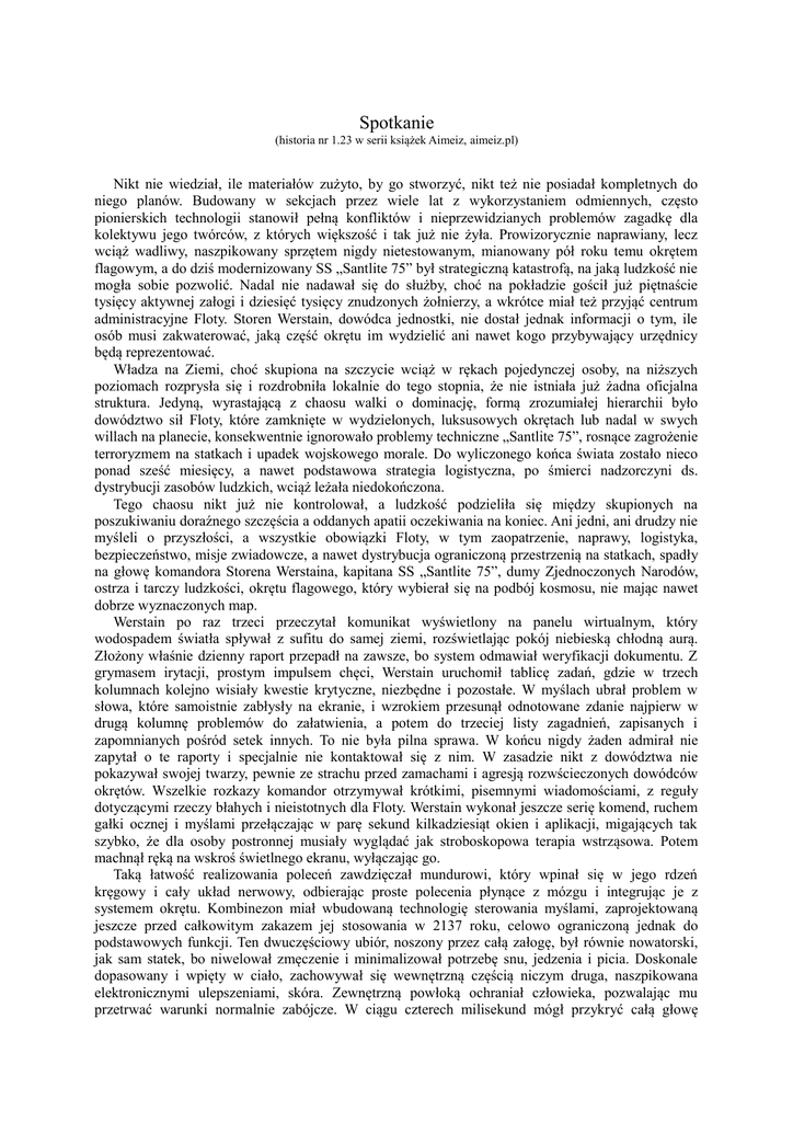 Spotkanie (historia nr 1.23 w serii książek Aimeiz, aimeiz.pl) Nikt nie wiedział, ile materiałów zużyto, by go stworzyć, nikt też nie posiadał kompletnych do niego planów. Budowany w sekcjach przez wiele lat z wykorzystaniem odmiennych, często pionierskich technologii stanowił pełną konfliktów i nieprzewidzianych problemów zagadkę dla kolektywu jego twórców, z których większość i tak już nie żyła. Prowizorycznie naprawiany, lecz wciąż wadliwy, naszpikowany sprzętem nigdy nietestowanym, mianowany pół roku temu okrętem flagowym, a do dziś modernizowany SS „Santlite 75” był strategiczną katastrofą, na jaką ludzkość nie mogła sobie pozwolić. Nadal nie nadawał się do służby, choć na pokładzie gościł już piętnaście tysięcy aktywnej załogi i dziesięć tysięcy znudzonych żołnierzy, a wkrótce miał też przyjąć centrum administracyjne Floty. Storen Werstain, dowódca jednostki, nie dostał jednak informacji o tym, ile osób musi zakwaterować, jaką część okrętu im wydzielić ani nawet kogo przybywający urzędnicy będą reprezentować. Władza na Ziemi, choć skupiona na szczycie wciąż w rękach pojedynczej osoby, na niższych poziomach rozprysła się i rozdrobniła lokalnie do tego stopnia, że nie istniała już żadna oficjalna struktura. Jedyną, wyrastającą z chaosu walki o dominację, formą zrozumiałej hierarchii było dowództwo sił Floty, które zamknięte w wydzielonych, luksusowych okrętach lub nadal w swych willach na planecie, konsekwentnie ignorowało problemy techniczne „Santlite 75”, rosnące zagrożenie terroryzmem na statkach i upadek wojskowego morale. Do wyliczonego końca świata zostało nieco ponad sześć miesięcy, a nawet podstawowa strategia logistyczna, po śmierci nadzorczyni ds. dystrybucji zasobów ludzkich, wciąż leżała niedokończona. Tego chaosu nikt już nie kontrolował, a ludzkość podzieliła się między skupionych na poszukiwaniu doraźnego szczęścia a oddanych apatii oczekiwania na koniec. Ani jedni, ani drudzy nie myśleli o przyszłości, a wszystkie obowiązki Floty, w tym zaopatrzenie, naprawy, logistyka, bezpieczeństwo, misje zwiadowcze, a nawet dystrybucja ograniczoną przestrzenią na statkach, spadły na głowę komandora Storena Werstaina, kapitana SS „Santlite 75”, dumy Zjednoczonych Narodów, ostrza i tarczy ludzkości, okrętu flagowego, który wybierał się na podbój kosmosu, nie mając nawet dobrze wyznaczonych map. Werstain po raz trzeci przeczytał komunikat wyświetlony na panelu wirtualnym, który wodospadem światła spływał z sufitu do samej ziemi, rozświetlając pokój niebieską chłodną aurą. Złożony właśnie dzienny raport przepadł na zawsze, bo system odmawiał weryfikacji dokumentu. Z grymasem irytacji, prostym impulsem chęci, Werstain uruchomił tablicę zadań, gdzie w trzech kolumnach kolejno wisiały kwestie krytyczne, niezbędne i pozostałe. W myślach ubrał problem w słowa, które samoistnie zabłysły na ekranie, i wzrokiem przesunął odnotowane zdanie najpierw w drugą kolumnę problemów do załatwienia, a potem do trzeciej listy zagadnień, zapisanych i zapomnianych pośród setek innych. To nie była pilna sprawa. W końcu nigdy żaden admirał nie zapytał o te raporty i specjalnie nie kontaktował się z nim. W zasadzie nikt z dowództwa nie pokazywał swojej twarzy, pewnie ze strachu przed zamachami i agresją rozwścieczonych dowódców okrętów. Wszelkie rozkazy komandor otrzymywał krótkimi, pisemnymi wiadomościami, z reguły dotyczącymi rzeczy błahych i nieistotnych dla Floty. Werstain wykonał jeszcze serię komend, ruchem gałki ocznej i myślami przełączając w parę sekund kilkadziesiąt okien i aplikacji, migających tak szybko, że dla osoby postronnej musiały wyglądać jak stroboskopowa terapia wstrząsowa. Potem machnął ręką na wskroś świetlnego ekranu, wyłączając go. Taką łatwość realizowania poleceń zawdzięczał mundurowi, który wpinał się w jego rdzeń kręgowy i cały układ nerwowy, odbierając proste polecenia płynące z mózgu i integrując je z systemem okrętu. Kombinezon miał wbudowaną technologię sterowania myślami, zaprojektowaną jeszcze przed całkowitym zakazem jej stosowania w 2137 roku, celowo ograniczoną jednak do podstawowych funkcji. Ten dwuczęściowy ubiór, noszony przez całą załogę, był równie nowatorski, jak sam statek, bo niwelował zmęczenie i minimalizował potrzebę snu, jedzenia i picia. Doskonale dopasowany i wpięty w ciało, zachowywał się wewnętrzną częścią niczym druga, naszpikowana elektronicznymi ulepszeniami, skóra. Zewnętrzną powłoką ochraniał człowieka, pozwalając mu przetrwać warunki normalnie zabójcze. W ciągu czterech milisekund mógł przykryć całą głowę przeźroczystym mikrofiltrem, który chronił przed działaniem próżni, promieniowaniem, mrozem, zmianą ciśnienia, jednocześnie umożliwiając oddychanie i nie krępując ani odrobinę ruchów. Mundury bez wątpienia były sukcesem naukowców pracujących w Chicago i w przeciwieństwie do budowanego tam okrętu flagowego nie budziły zastrzeżeń. To pozwoliło załodze skupić uwagę na krytycznych wadach SS „Santlite 75”, takich jak za słaba główna kolumna kadłuba, którą dopiero tydzień temu wzmocniono na tyle, żeby uniknąć wstydliwego złożenia się statku wpół na oczach całej Floty. Tak poważne problemy wynikały z nagminnej rotacji głównych zarządców przedsięwzięcia. Budowę prowadziło pięć osób, a każda ginęła z rąk DARPA lub własnych średnio po czterech latach pracy. Nie sposób też było zliczyć masowo wymienianych specjalistów oskarżanych regularnie o terroryzm, szpiegostwo i działanie na szkodę Wielkiego Planu. Do wieczornej odprawy zostało trzydzieści minut i Werstain zamierzał zmarnować cały ten czas, błogo leżąc w swoim bloku sypialnym na dużym, wygodnym łóżku. Zanim zamk