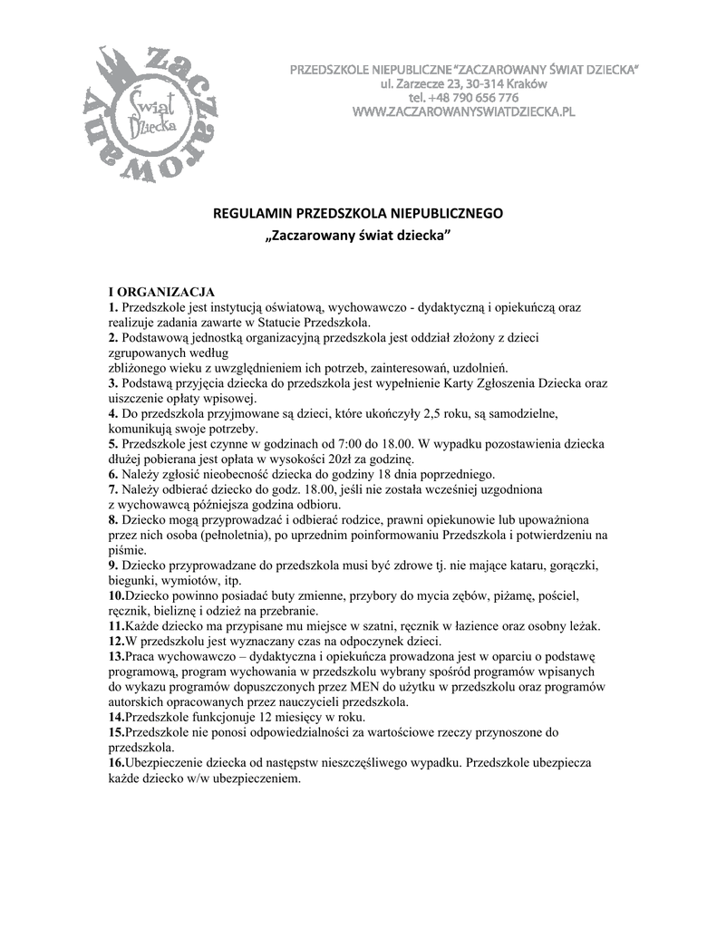 REGULAMIN PRZEDSZKOLA NIEPUBLICZNEGO „Zaczarowany świat dziecka” I ORGANIZACJA 1. Przedszkole jest instytucją oświatow wiatową, wychowawczo - dydaktyczną i opiekuńńczą oraz realizuje zadania zawarte awarte w Statucie Przedszkola. 2. Podstawową jednostką organizacyjną organizacyjn przedszkola jest oddział złożony z dzieci zgrupowanych według zbliżonego wieku z uwzględnieniem dnieniem ich potrzeb, zainteresowań, uzdolnień. 3. Podstawą przyjęcia cia dziecka do przedszkola jest wypełnienie Karty Zgłoszenia Dziecka oraz uiszczenie opłaty wpisowej. 4. Do przedszkola przyjmowane są s dzieci, które ukończyły 2,5 roku, są samodzielne, komunikują swoje potrzeby. 5. Przedszkole jest czynne w godzinach od 7:00 do 18.00. W wypadku pozostawienia dziecka dłużej pobierana jest opłata w wysokości 20zł za godzinę. 6. Należy zgłosić nieobecność dziecka do godziny 18 dnia poprzedniego. 7. Należy odbierać dziecko do godz. 18.00, jeśli je nie została wcześniej uzgodniona z wychowawcą późniejsza niejsza godzina odbioru. 8. Dziecko mogą przyprowadzaćć i odbierać rodzice, prawni opiekunowie lub upowa upoważniona przez nich osoba (pełnoletnia), po uprzednim poinformowaniu Przedszkola i potwierdzeniu na piśmie. 9. Dziecko przyprowadzane do przedszkola musi być zdrowe tj. nie mające kataru, gor gorączki, biegunki, wymiotów, itp. 10.Dziecko powinno posiadać buty zmienne, przybory do mycia zębów, z piżamę, pościel, ręcznik, bieliznę i odzież na przebranie. 11.Każde Każde dziecko ma przypisane mu miejsce w szatni, ręcznik r w łazience oraz osobny leżak. le 12.W W przedszkolu jest wyznaczany czas na odpoczynek dzieci. 13.Praca wychowawczo – dydaktyczna i opiekuńcza opieku prowadzona jest w oparciu o podstaw podstawę programową,, program wychowania w przedszkolu wybrany spośród ród programów wp wpisanych do wykazu programów dopuszczonych przez MEN do użytku w przedszkolu oraz programów autorskich opracowanych przez nauczycieli przedszkola. 14.Przedszkole Przedszkole funkcjonuje 12 miesięcy miesi w roku. 15.Przedszkole Przedszkole nie ponosi odpowiedzialności odpowiedzialno za wartościowe rzeczy przynoszone do przedszkola. 16.Ubezpieczenie Ubezpieczenie dziecka od następstw nast nieszczęśliwego wypadku. Przedszkole ubezpiecza każde de dziecko w/w ubezpieczeniem. II. ZADANIA PRZEDSZKOLA 1. Wspomaganie i ukierunkowywanie indywidualnego rozwoju dzieci zgodnie z ich możliwościami rozwojowymi. 2. Wspomaganie dzieci w rozwijaniu uzdolnień oraz kształtowanie czynności intelektualnych potrzebnych im w codziennych sytuacjach s i w dalszej edukacji. 3. Budowanie systemu wartości, w tym wychowywanie takie, ażeby potrafiły orientować się co jest dobre, a co złe. 4. Kształtowanie u dzieci odporności emocjonalnej koniecznej w nowych i trudnych sytuacjach, w tym także do łagodnego znoszenia stresów i porażek. pora 5. Rozwijanie u dzieci umiejętności społecznych, które są niezbędne w poprawnych relacjach dzieci z osobami dorosłymi. 6. Stwarzanie warunków sprzyjających wspólnej i zgodnej zabawie oraz nauce dzieci o zróżnicowanych możliwościach fizycznych i intelektualnych. 7. Troska o zdrowie dzieci i ich sprawność fizyczną. 8. Wprowadzenie dzieci w świat wartości estetycznych i rozwijanie rozwijanie umiejętności wypowiadania się poprzez wszelkie formy artystyczne. 9. Wspieranie ciekawości dziecięcej, aktywności, samodzielności, a także kształtowanie tych wiadomości i umiejętności, które są ważne w edukacji szkolnej. 10.Umożliwianie dzieciom podtrzymywania odtrzymywania poczucia tożsamości narodowej, etnicznej i językowej. 11. Udzielanie dzieciom pomocy psychologiczno – pedagogicznej. III. PRAWA DZIECKA 1. Dzieci w przedszkolu mają wszystkie prawa wynikające z Konwencji Praw Dziecka, a w szczególności do: • Właściwie zorganizowanego procesu opiekuńczo-wychowawczo-dydaktycznego; opiekuńczo dydaktycznego; • Szacunku dla wszystkich jego potrzeb, życzliwego i podmiotowego traktowania oraz akceptacji jego osoby, takim, jakim jest; • Ochrony przed wszelkimi formami wyrażania przemocy fizycznej bądź psychicznej; • Poszanowania własności; • Indywidualnego procesu rozwoju i własnego tempa rozwoju; • Pomocy i ochrony przy pokonywaniu przeżyć związanych z przykrymi i dotkliwymi zdarzeniami. IV. PRAWA I OBOWIĄZKI RODZICÓW 1. Przestrzeganie ie niniejszego regulaminu. 2. Przyprowadzanie i odbieranie dziecka z przedszkola lub zapewnienie upoważnionej osoby zastępczej. 3. Terminowe uiszczanie odpłatności za pobyt dziecka w przedszkolu. p 4. Informowanie o przyczynach nieobecności dziecka w przedszkolu oraz niezwłoczne informowanie o zatruciach pokarmowych i chorobach zakaźnych. 5. Rodzice mają prawo do: • Zapoznania się z programem i zadaniami przedszkola; • Uzyskiwania na bieżąco rzetelnej etelnej informacji na temat postępów, sukcesów i niepowodzeń swojego dziecka; • Uzyskiwania porad i wskazówek od nauczycieli w rozpoznawaniu przyczyn trudności wychowawczych oraz doborze metod udzielania dziecku pomocy; • Wyrażania i przekazywania nauczycielowi nauczy oraz dyrektorowi opinii na temat pracy przedszkola; • Przebywania w przedszkolu oraz obserwowania zajęć po wcześniejszej konsultacji z nauczycielem; • Rodzice i nauczyciele zobowiązani są współdziałać ze sobą w celu skutecznego oddziaływania wychowawczego wawczego na dziecko i określania drogi jego indywidualnego rozwoju. Regulamin wchodzi w życie z dniem 04.10.2010 r.